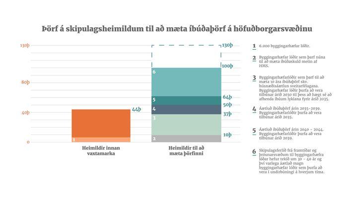 Að teknu tilliti til nýútgefinna húsnæðisáætlana einstakra sveitarfélaga á höfuðborgarsvæðinu, íbúðarskuldar sem metin er af HMS og fyrirvara vegna langrar meðgöngu nýrra íbúða í skipulagsferli sjáum við að raunhæft mat á þeim heimildum sem þurfa að vera undir í skipulagi til að mæta þörfum næstu 15 ára er 100-130 þúsund – ekki 44 þúsund. Gögnin sýna skýrt að þörfin fyrir íbúðir er margfalt meiri í fyrirsjáanlegri framtíð en sá rammi skipulags á höfuðborgarsvæðinu og vaxtarmörkin gera ráð fyrir.