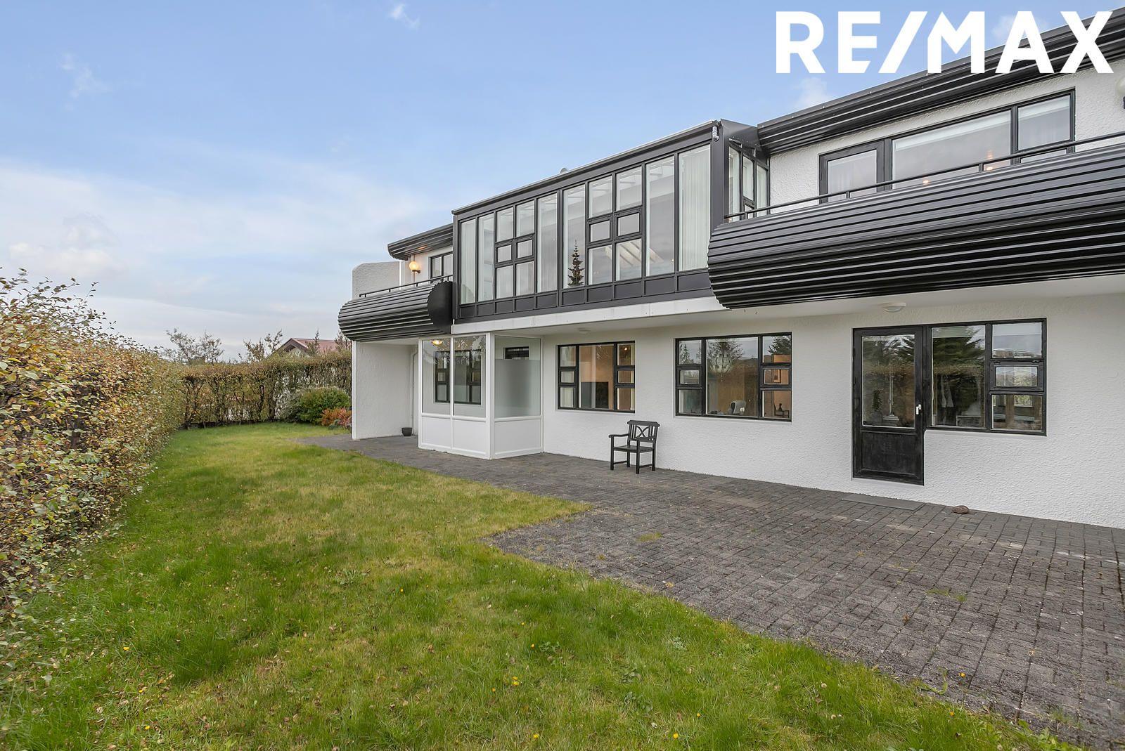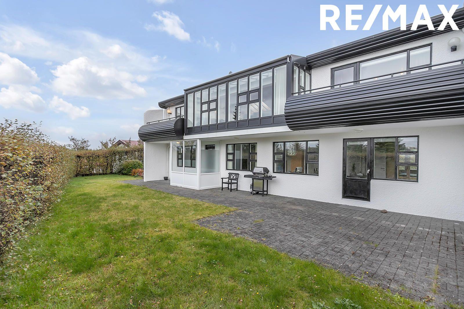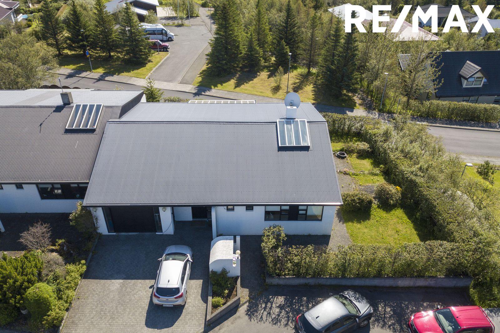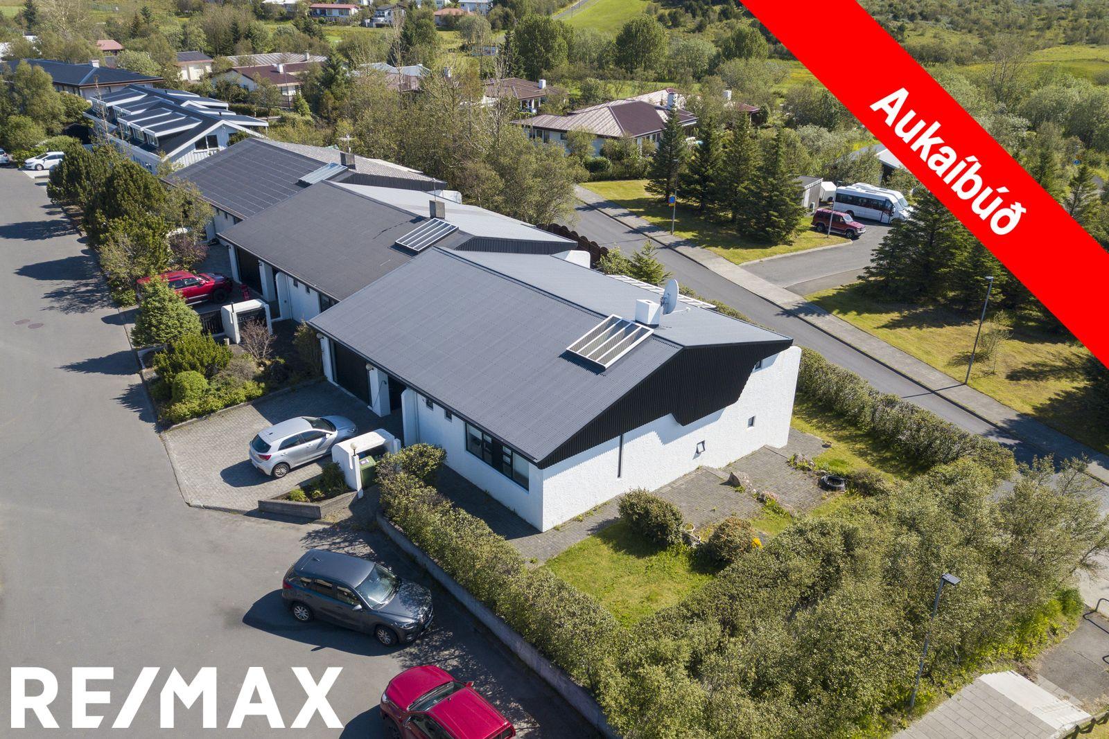Nánari lýsing: Húsið er byggt árið 1987 og er steypt. Húsið er endaraðhús og stendur í enda á botnlanga. Í dag er húsinu skipt i tvær íbúðir en lítið mál er að opna aftur á milli hæða.Efri hæðin er skráð 161,2 fm og þar er baðherbergi, stórar stofur, borðstofa, eldhús, þvottahús og stórt svefnherbergi. Bílskúrinn er skráður 32,9 fm en er með góðu geymslulofti. Neðri hæðin er skráð 87,5 fm og þar eru þrjú svefnherbergi, baðherbergi, eldhús/borðstofa og sjónvarpsrými/stofa. Fyrirkomulag á báðum hæðum sést vel á teikningu af hæðum sem sjá má undir myndum af eigninni.