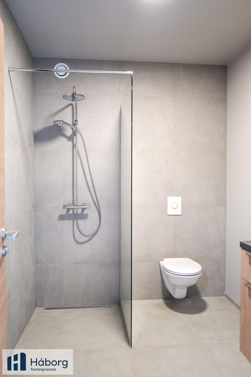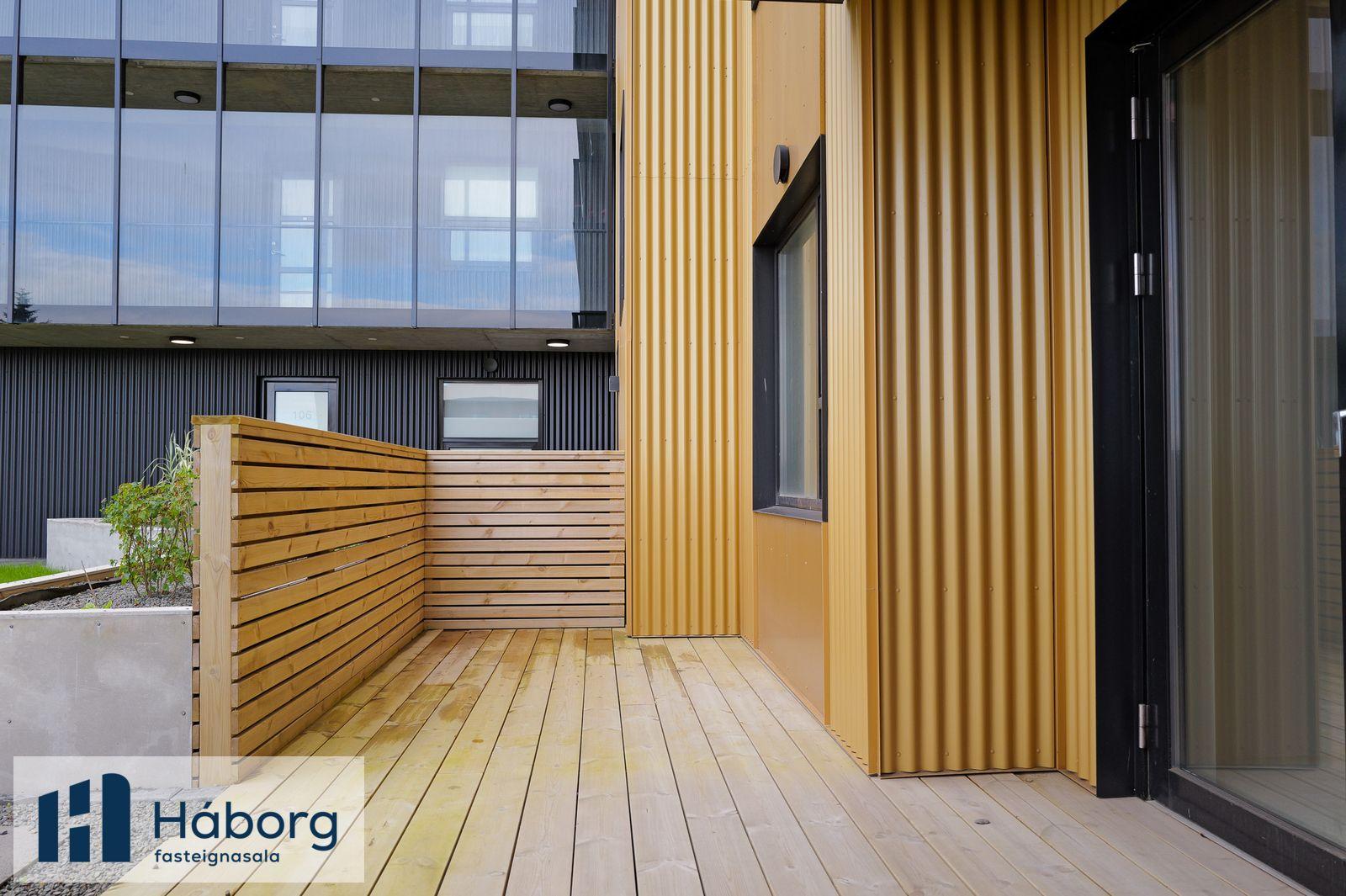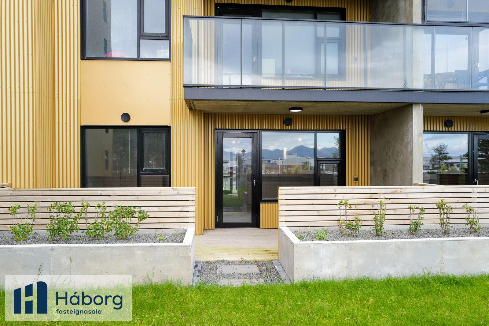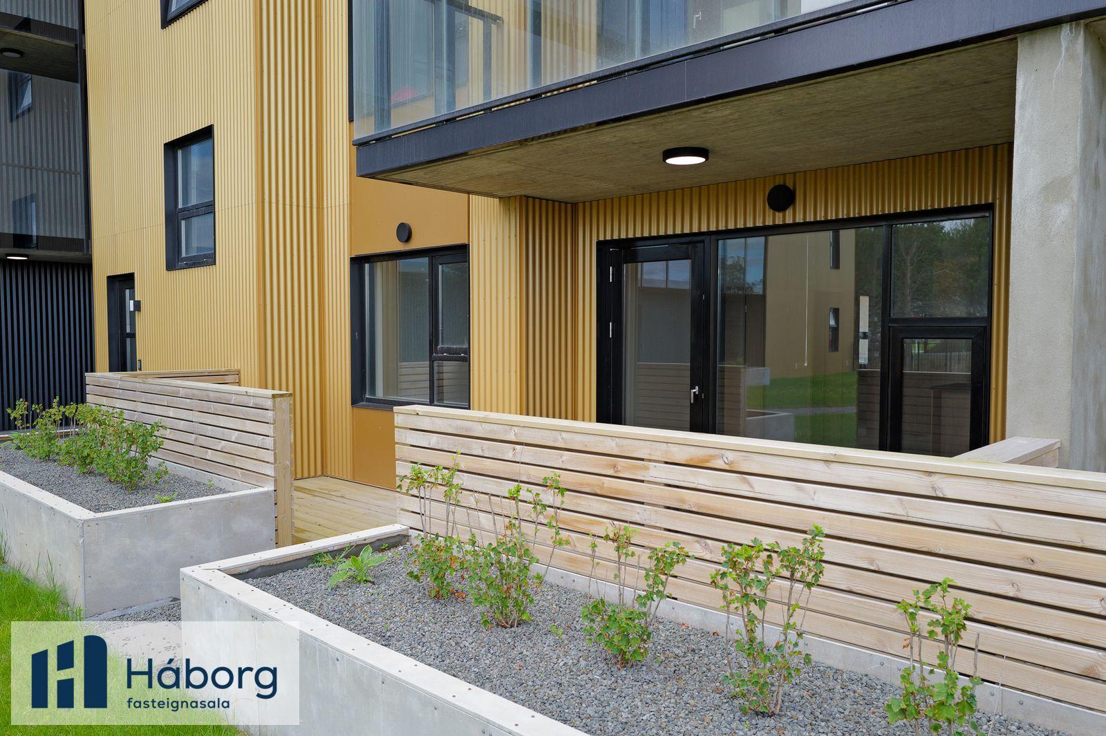 Nánari lýsing á íbúð 103: Anddyri með fataskáp. Alrými með stofu og eldhúsi. Gengið er út á svalir úr alrými. Eldhúsinnrétting er eikarlituð, AEG spanhelluborð og bakaraofn. Gert er ráð fyrir innbyggðum ísskáp og uppþvottavél. Svefnherbergi eru tvö, fataskápar í báðum. Baðherbergi, gólf er flísalagt og veggir að hluta. Vaskinnrétting er eikarlituð, speglaskápur með Led ljósum. Sturta, upphengt salerni, Grohe blöndunartæki. Hiti er í gólfum á baðherbergi. Þvottahús með innréttingu og vaski. Í kjallara er rúmgóð sérgeymsla, sameiginleg hjóla- og vagnageymsla auk stæðis í bílageymslu.