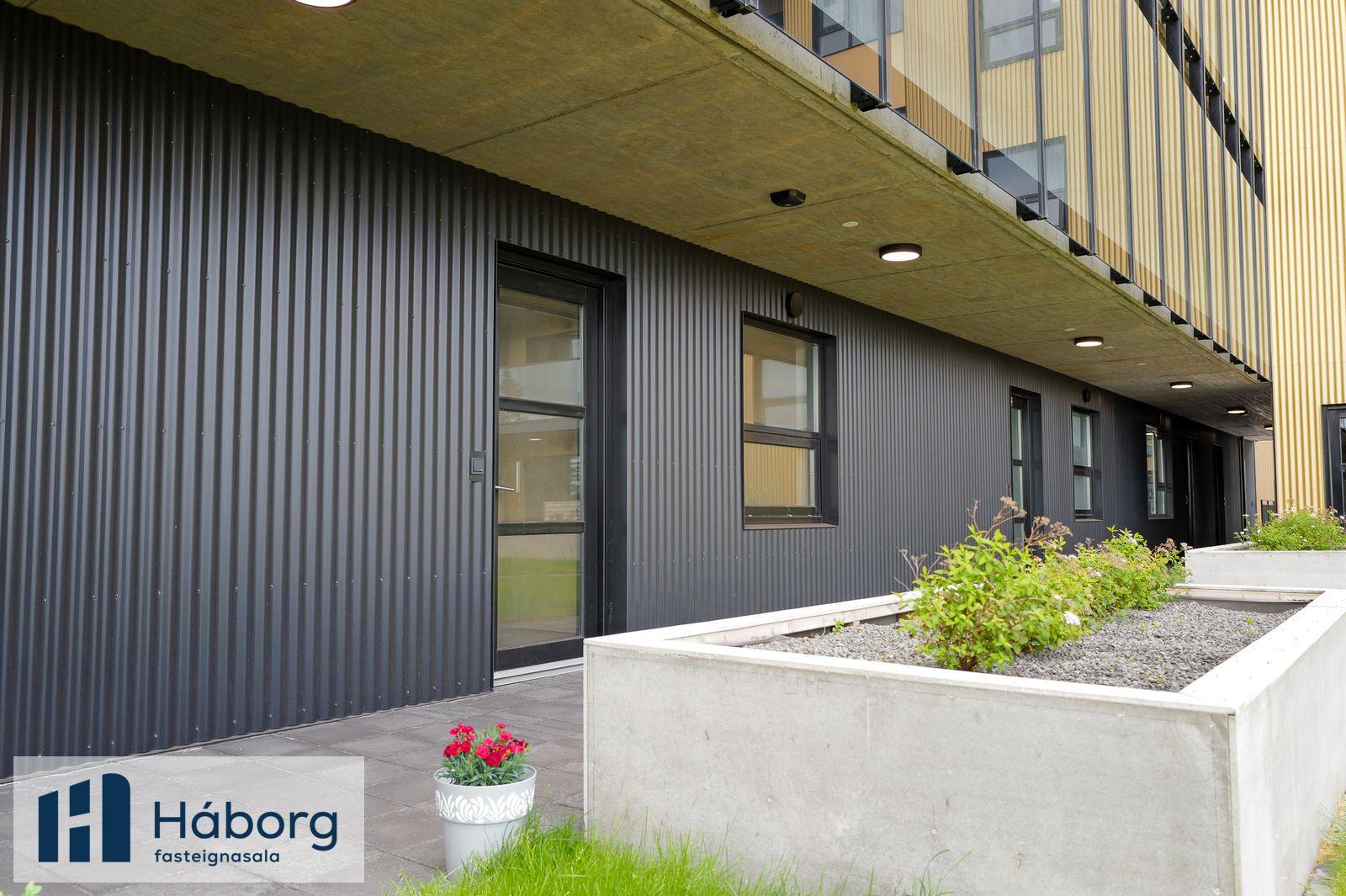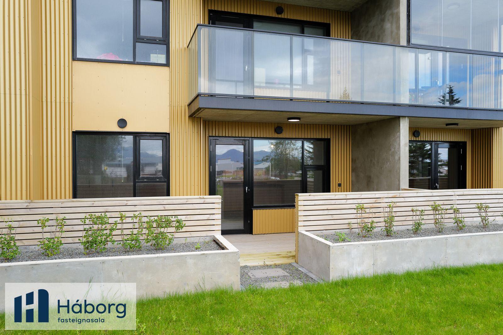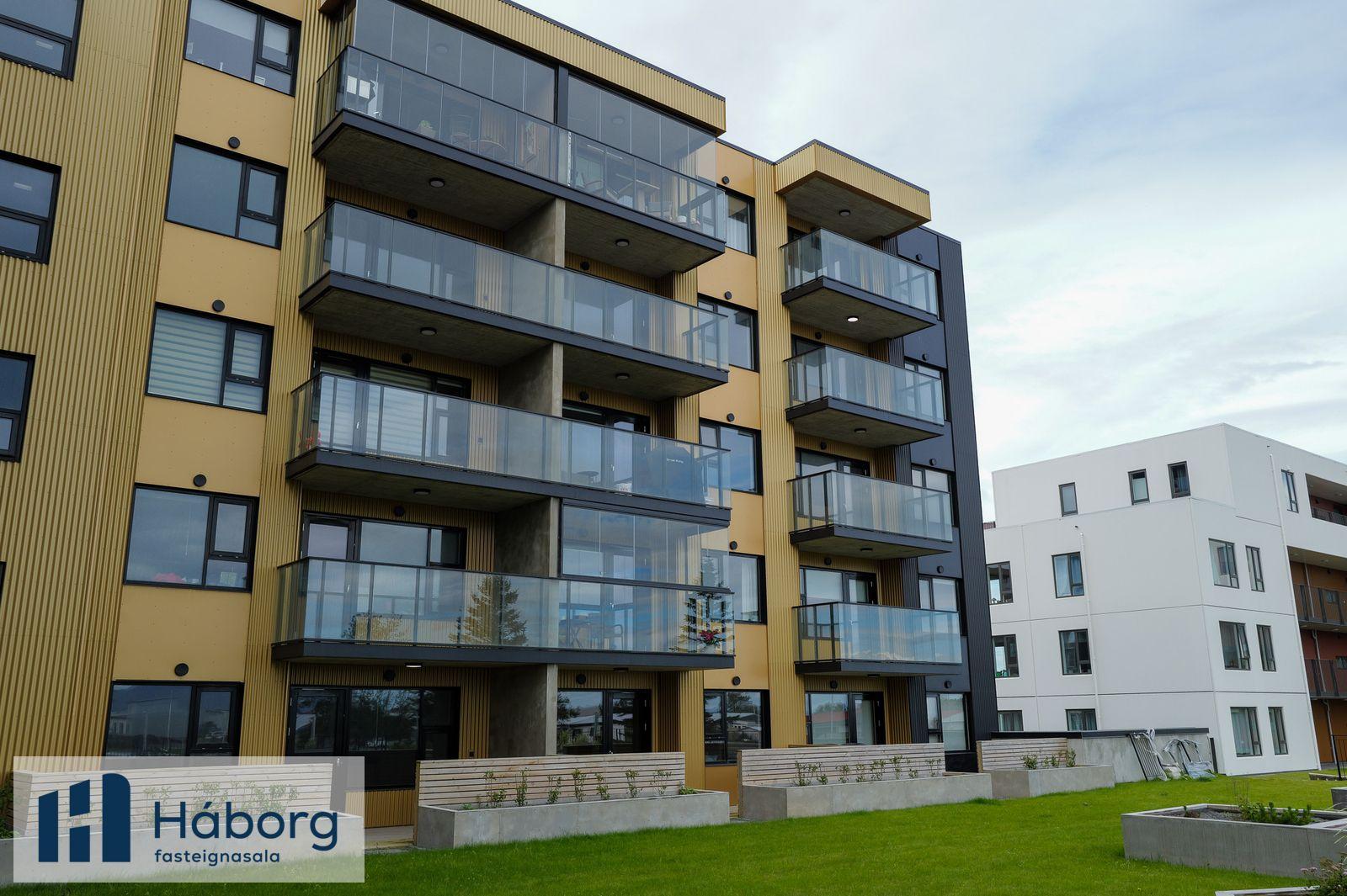 Húsið: Byggingarfélagið Bestla ehf er framkvæmdaaðili, arkitektar og aðalhönnuðir eru Krark Arkitekt. Húsið er á fimm hæðum og samanstendur af 38 íbúðum af fjölbreyttum stærðum og gerðum. Í húsinu er stiga- og lyftuhús en gengið er inn í íbúðirnar af svalagöngum. Í kjallara hússins er bílageymsla með 26 bílastæðum ásamt sérgeymslum fyrir hluta af íbúðunum og vagna- hjólageymslu. Húsið er staðsteypt, klætt með báruáli. Gluggar og svalahurðir eru úr timbri, klætt með áli að utan. Hitalögn er í helstu gönguleiðum og í bílastæðum fyrir hreyfihamlaða. Bílastæði eru austan og sunnan megin við húsið og frágangur lóðar er samkvæmt teikningum frá Landslagi ehf. Rafhleðslustöð er uppsett og gert er ráð fyrir að hægt sé að bæta fleirum við. Íbúðum er skilað fullbúnum en án gólfefna, nema votrými eru flísalögð. Lofthæð íbúða er um 2,58 cm, veggir og loft eru máluð í litnum “soft sand” frá Flugger. Hurðir eru af gerðinni Ringolit frá Birgisson, þær eru plastlagðar í eikarlit. Innréttingar eru frá Voke-3, í eikarlit. Spanhelluborð og bakaraofnar eru frá AEG. Í íbúðunum eru ýmist innbyggðir gufugleypar eða lofthengdir eyjuháfar. Ísskápar og uppþvottavélar fylgja ekki en gert er ráð fyrir að hægt sé að hafa tækin innbyggð, hurðir til uppsetningar þeirra fylgja með. Baðherbergi eru flísalögð að hluta, flísar eru frá Álfaborg. Baðinnréttingar eru í eikarlit og speglaskápar með led ljósum. Blöndunartæki og hreinlætistæki eru frá Grohe.