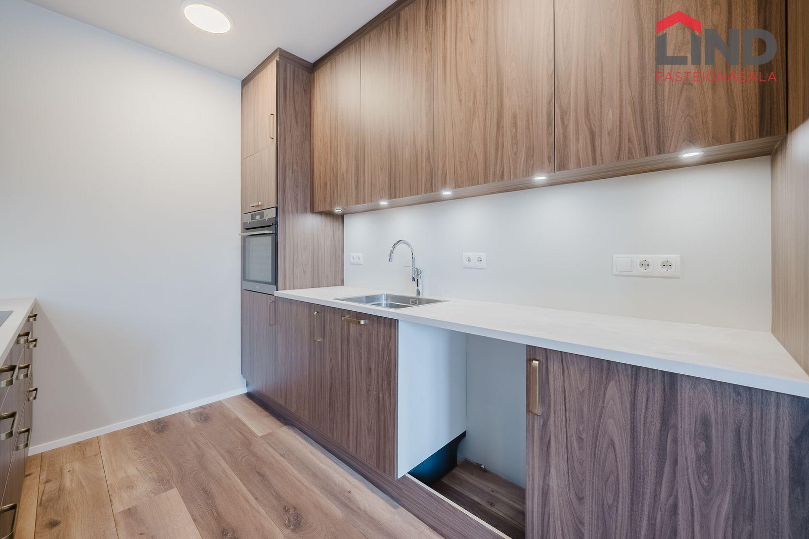 Eldhúsinnrétting er sérsmíðuð af vandaðri gerð frá Axis ásamt vaski og Grohe blöndunartækjum frá Byko. Helluborð og blástursofn eru af gerðinni AEG frá Ormsson (sjá nánar á www.ormsson.is) Gufugleypir í eldhúsi er einnig frá Ormsson.