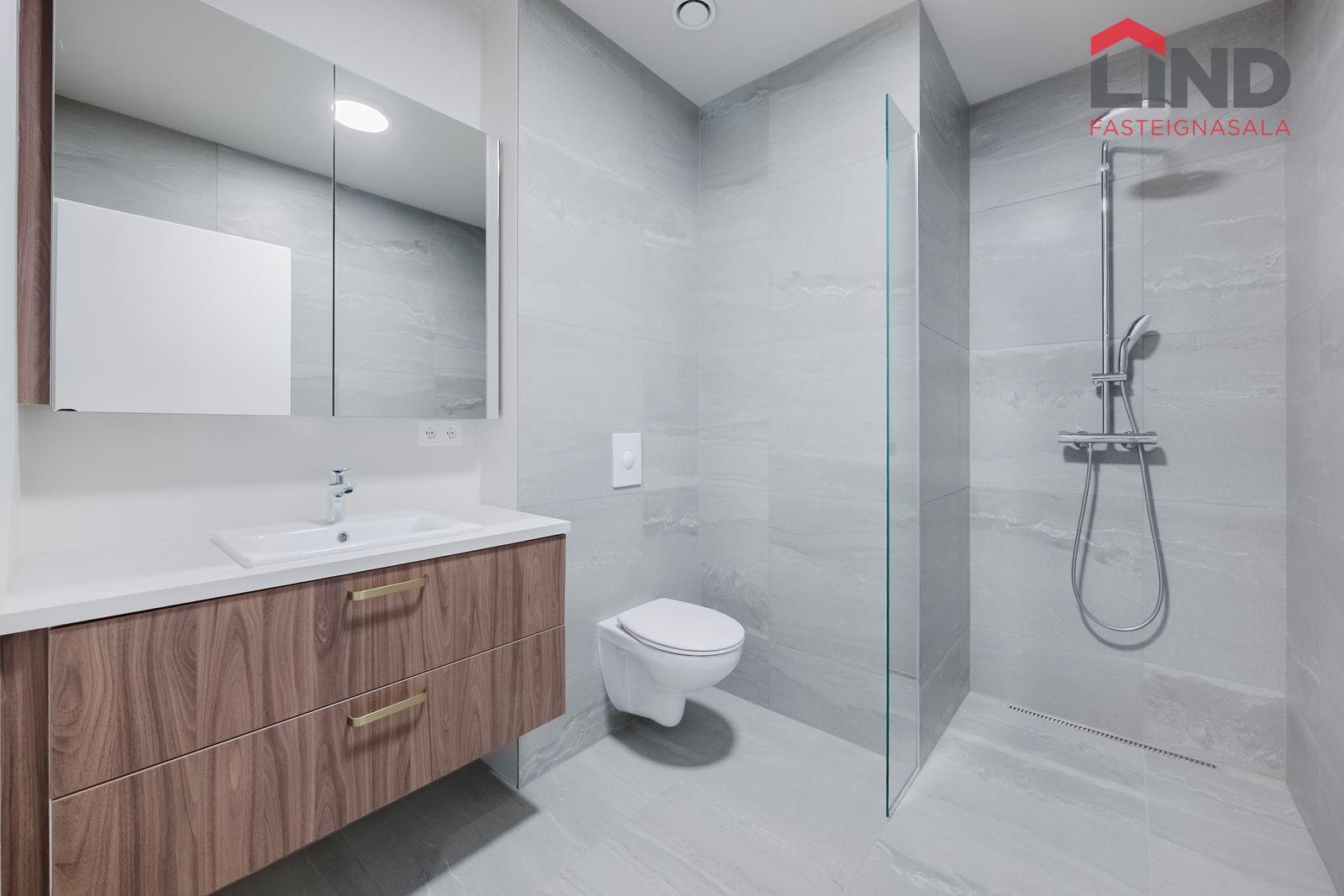 Baðherbergi: Baðinnrétting kemur frá Axis. Hreinlætistæki og handklæðaofn eru frá Byko. Salernið er upphengt og innbyggt. Hitastýrð blöndunartæki verða við sturtu. Gólf eru flísalögð og veggir að hluta upp í loft