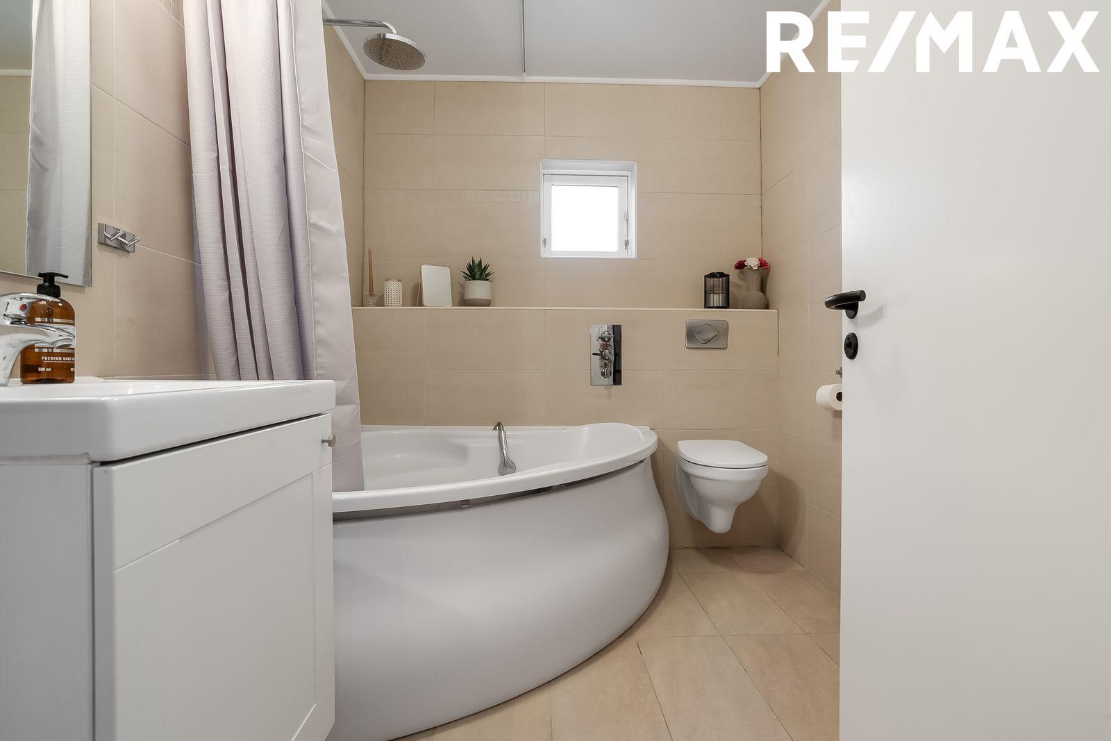 Baðherbergi er flísalagt með rafmagnshita í gólfi, innrétting með speglaskáp, upphengt salerni, handklæðaofn, gott hornbaðkar með sturtu aðstöðu og gluggi.