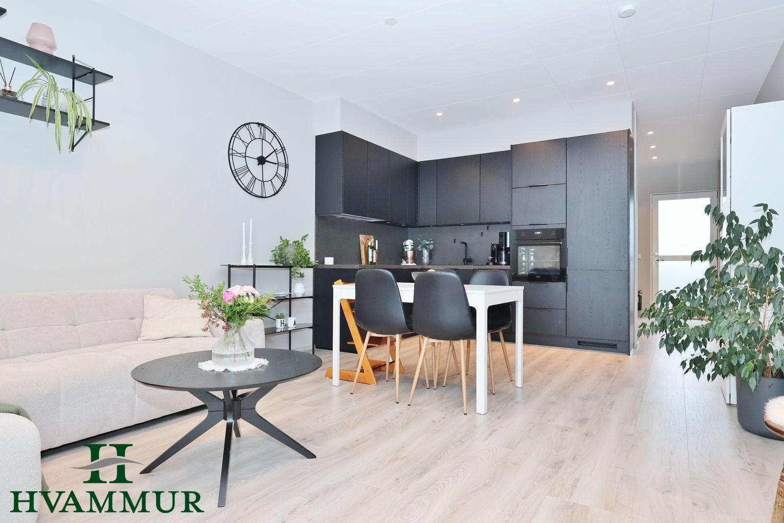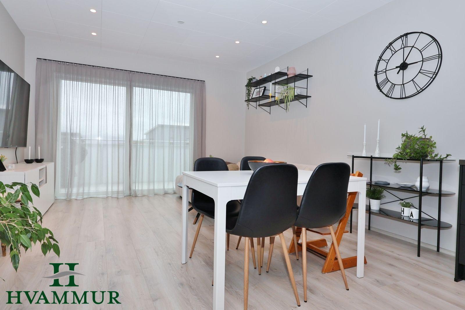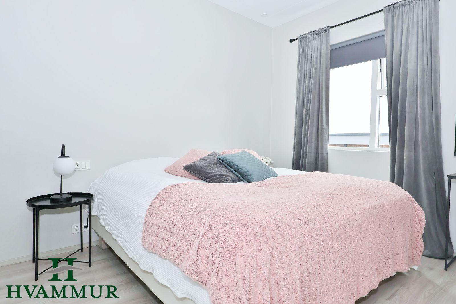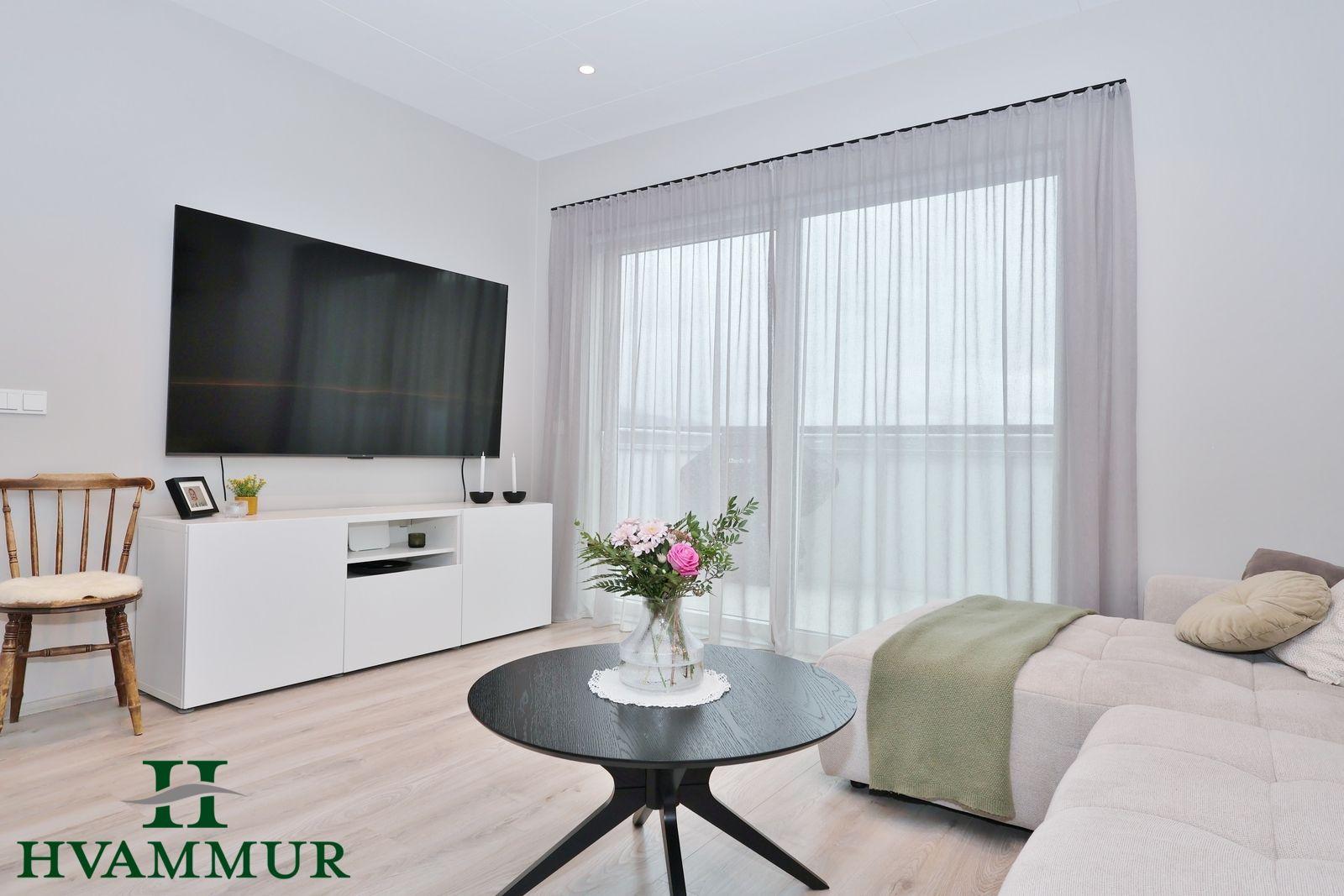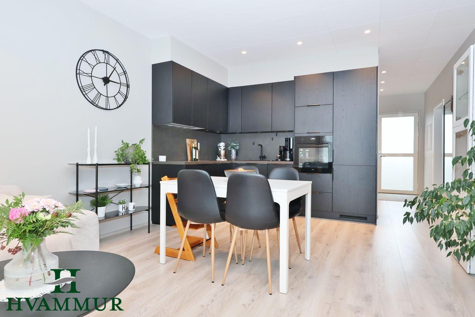 Annað: - Innréttingar og skápar er plastlagðar, Nero oak og eru frá www.gks.is - Gólfefni, ljóst harðparket er á öllum rýmum að baðherbergi undanskildu þar eru gráar flísar. - Innihurðar eru yfirfelldar hvítar. - Hljóðdempandi plötur í öllum loftum nema á baðherbergi. - Innfelld led-lýsing í loftum. - Stéttar við aðalinngang eru steyptar og með hitalögnum í. - Húsið er steypt og einangrað að utan og klætt með gráu báruðu stáli og timbri við innganga. - Sér bílastæði með hleðslustöð.