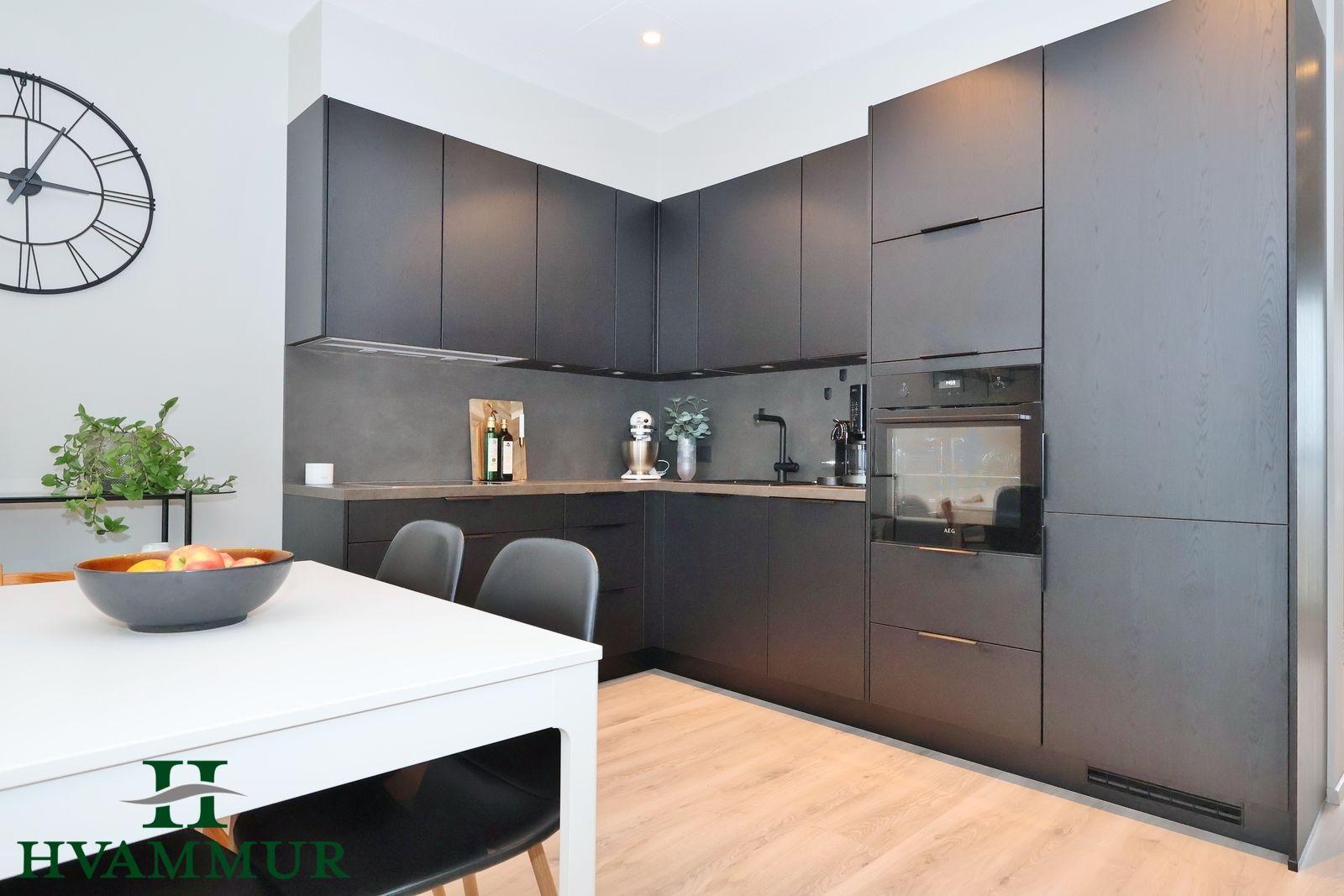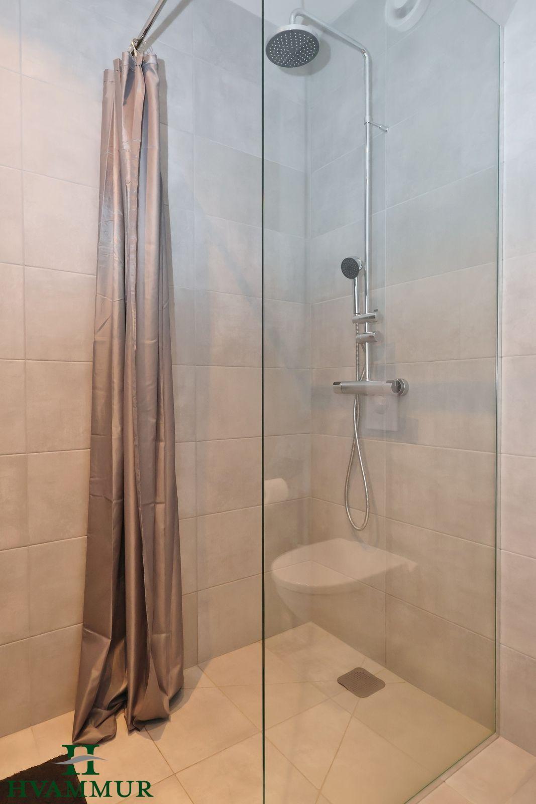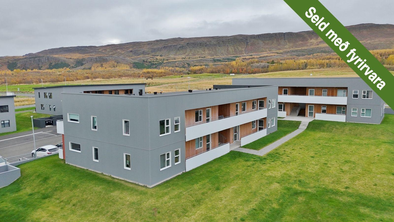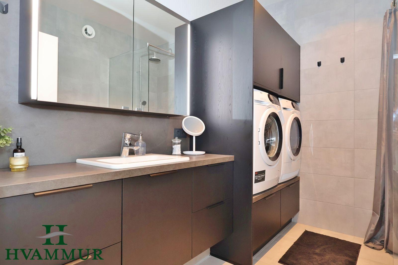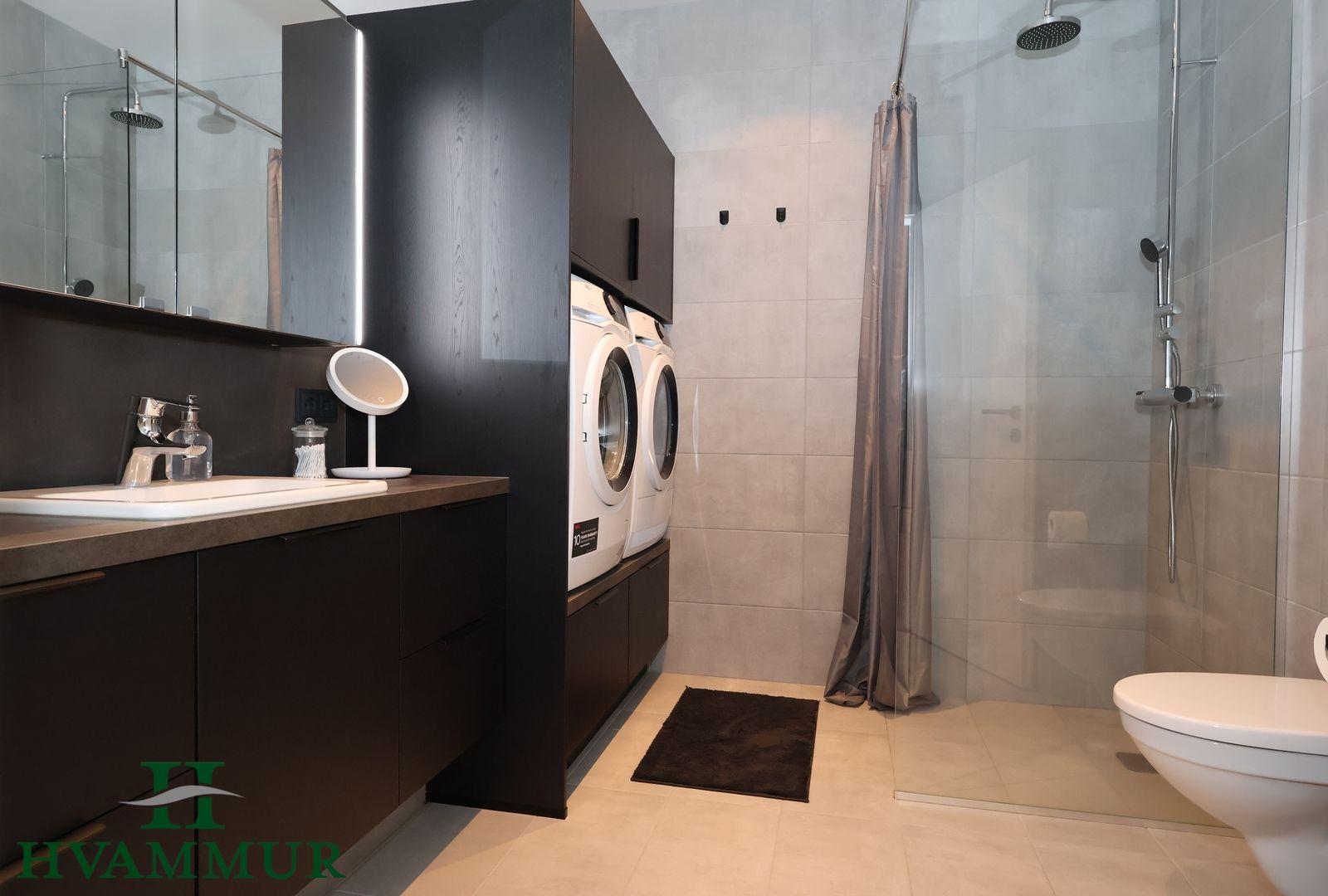Annað: - Innréttingar og skápar er plastlagðar, Nero oak og eru frá www.gks.is - Gólfefni, ljóst harðparket er á öllum rýmum að baðherbergi undanskildu þar eru gráar flísar. - Innihurðar eru yfirfelldar hvítar. - Hljóðdempandi plötur í öllum loftum nema á baðherbergi. - Innfelld led-lýsing í loftum. - Stéttar við aðalinngang eru steyptar og með hitalögnum í. - Húsið er steypt og einangrað að utan og klætt með gráu báruðu stáli og timbri við innganga. - Sér bílastæði með hleðslustöð.
