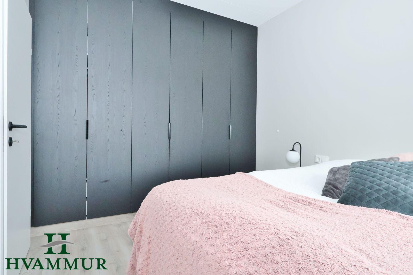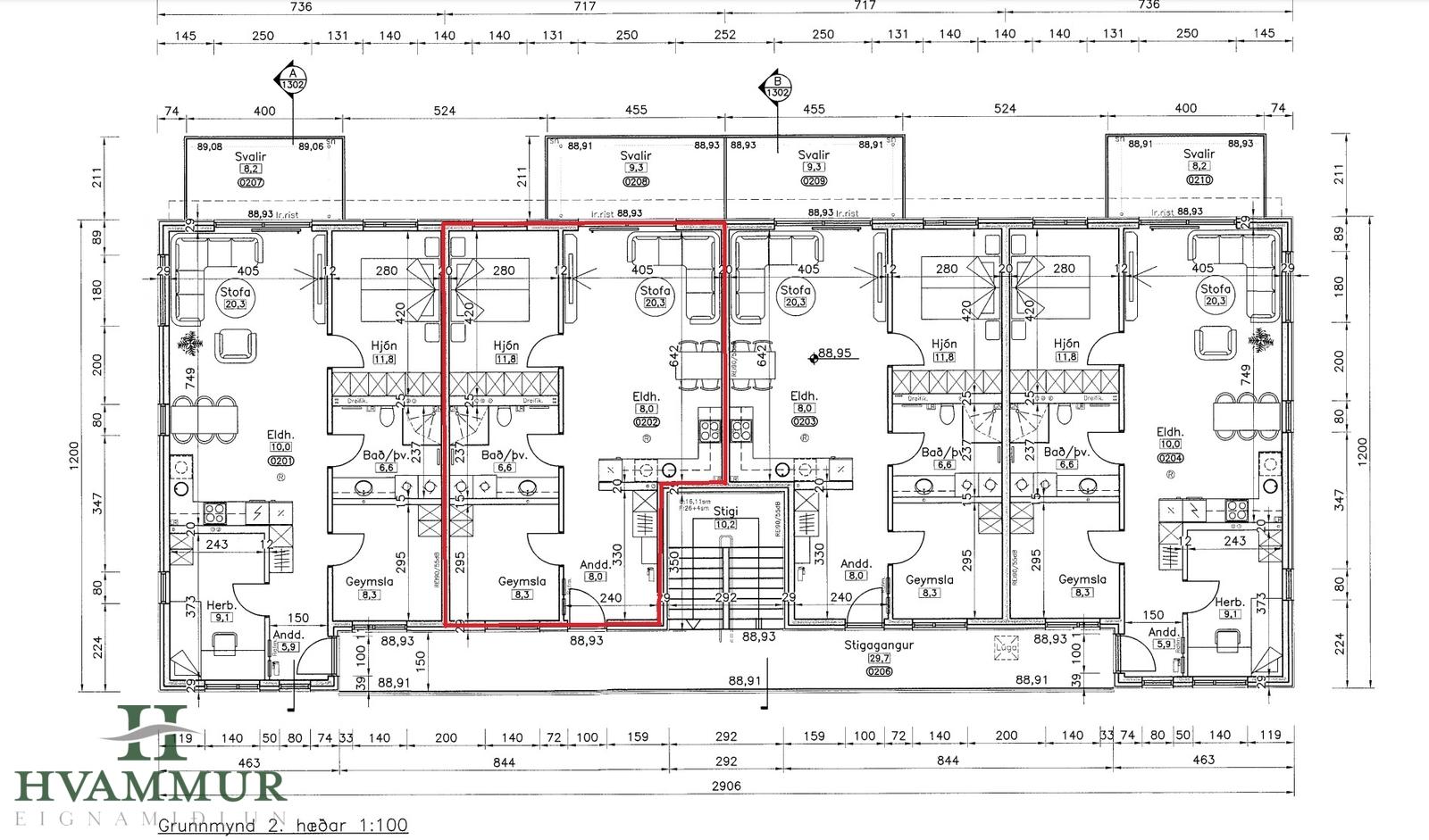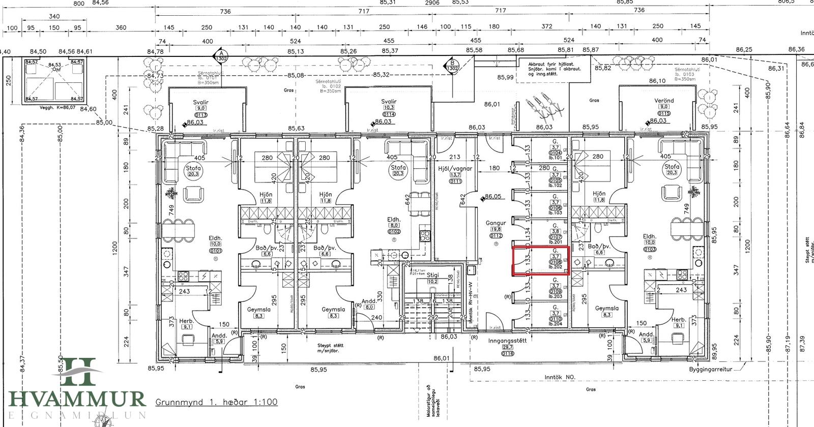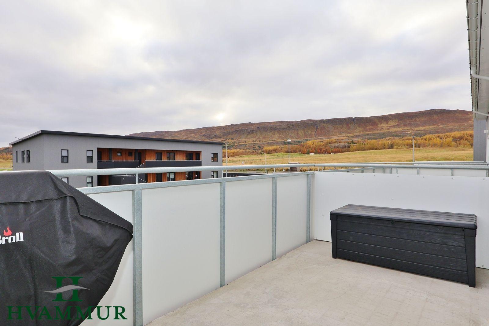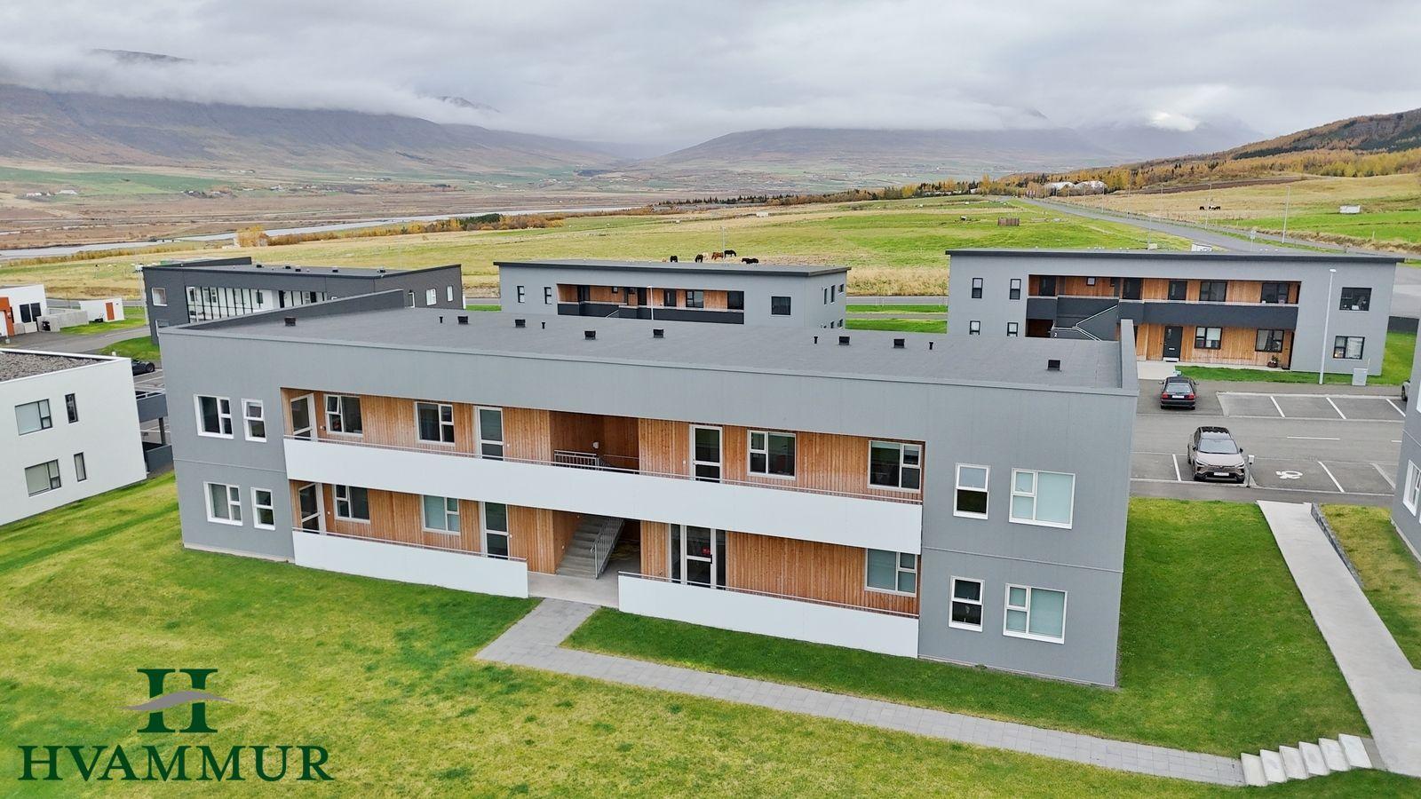 Annað: - Innréttingar og skápar er plastlagðar, Nero oak og eru frá www.gks.is - Gólfefni, ljóst harðparket er á öllum rýmum að baðherbergi undanskildu þar eru gráar flísar. - Innihurðar eru yfirfelldar hvítar. - Hljóðdempandi plötur í öllum loftum nema á baðherbergi. - Innfelld led-lýsing í loftum. - Stéttar við aðalinngang eru steyptar og með hitalögnum í. - Húsið er steypt og einangrað að utan og klætt með gráu báruðu stáli og timbri við innganga. - Sér bílastæði með hleðslustöð.
