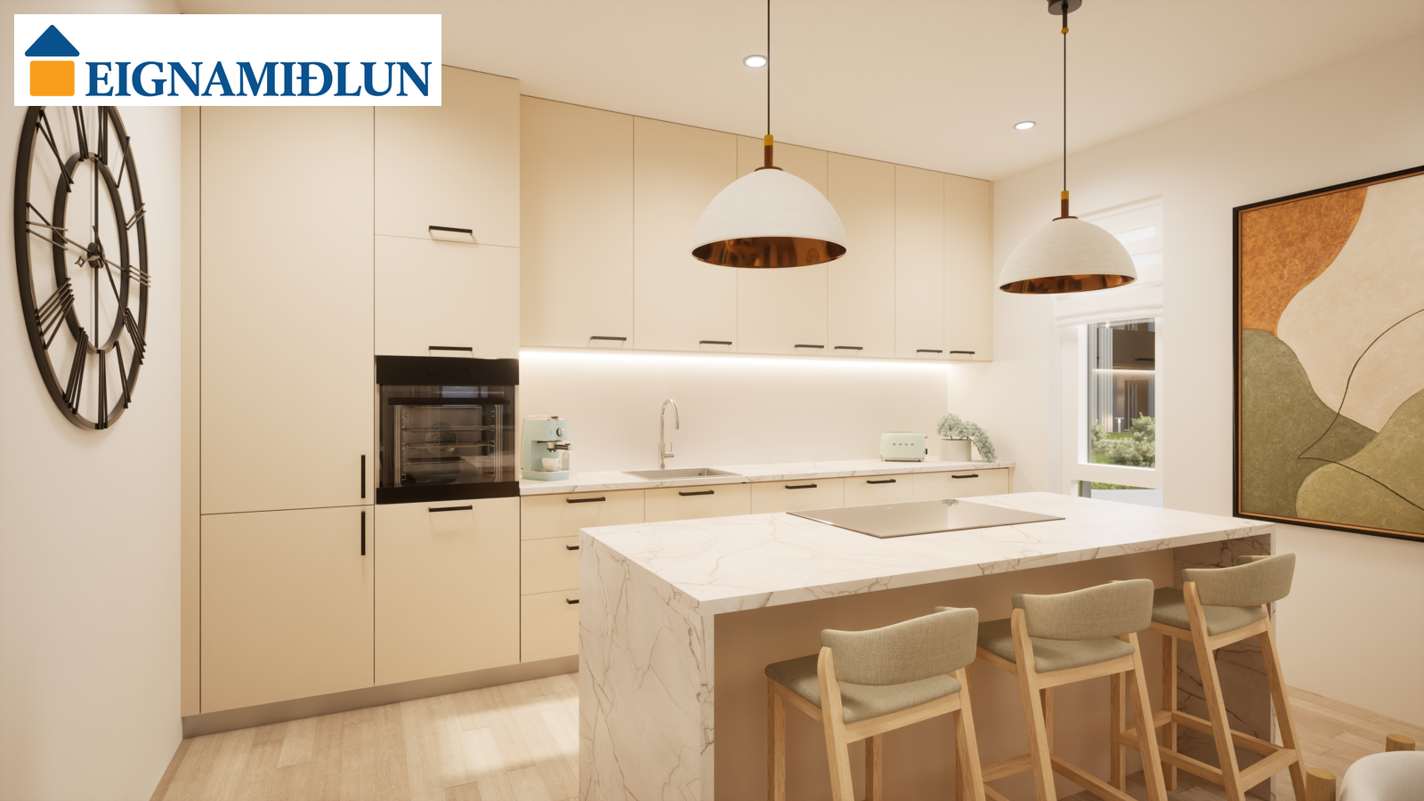 Íbúð merkt 207 - 5 herbergja 144,8 fm íbúð á annari hæð með 3 - 4 svefnherbergjum og rúmgóðum sérafnotareit. Rúmgott svefnherbergi og þrjú minni barnaherbergi, baðherbergi flísalagt í hólf og gólf. Eldhús með stórri vinnueyju opið inn í borðstofu og stofu. Bílastæði í bílakjallara merkt B29. Virkilega vel skipulögð íbúð. Athugið að myndir af íbúðum eru tölvuteiknaðar og eiga ekki alltaf við allar íbúðir.