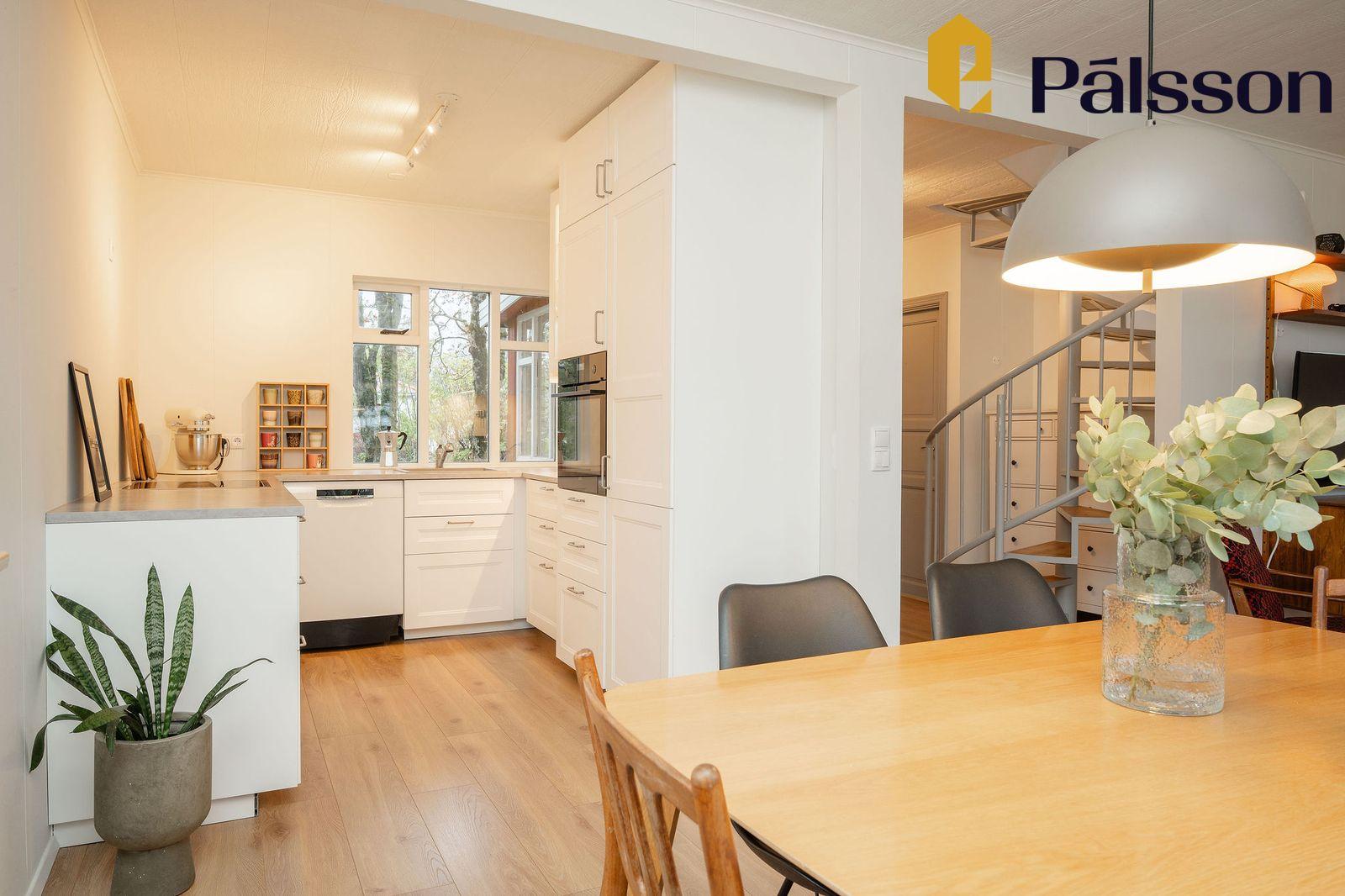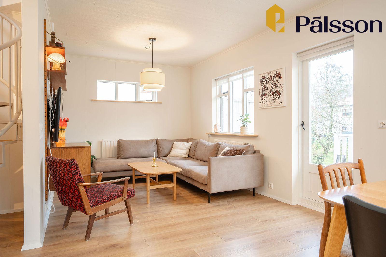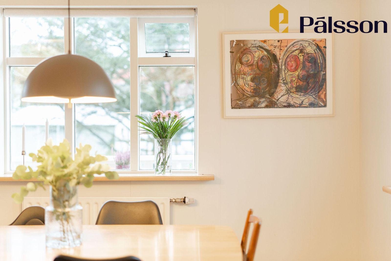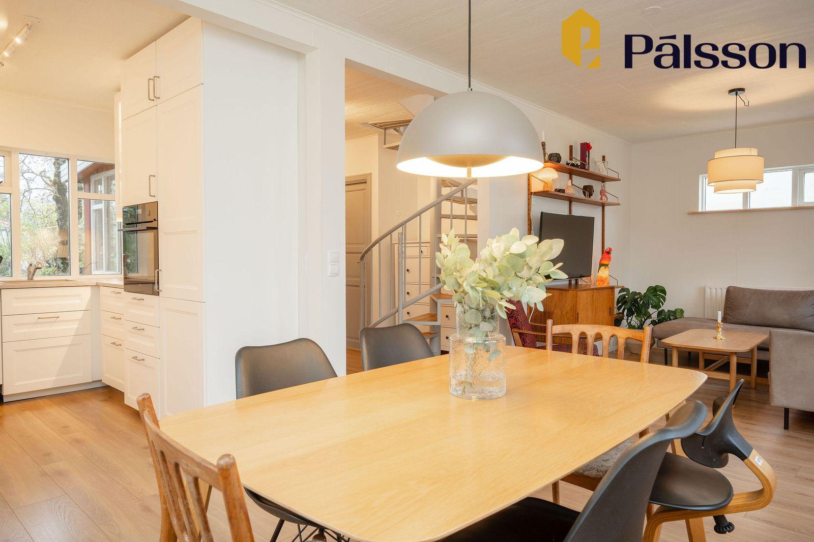 Stofa/borðstofa er opin við eldhús sem skapar sérlega góða birtu í rúmgóðu alrýminu. Þar er gengið út á pall með stiga niður í fallega garðinn.