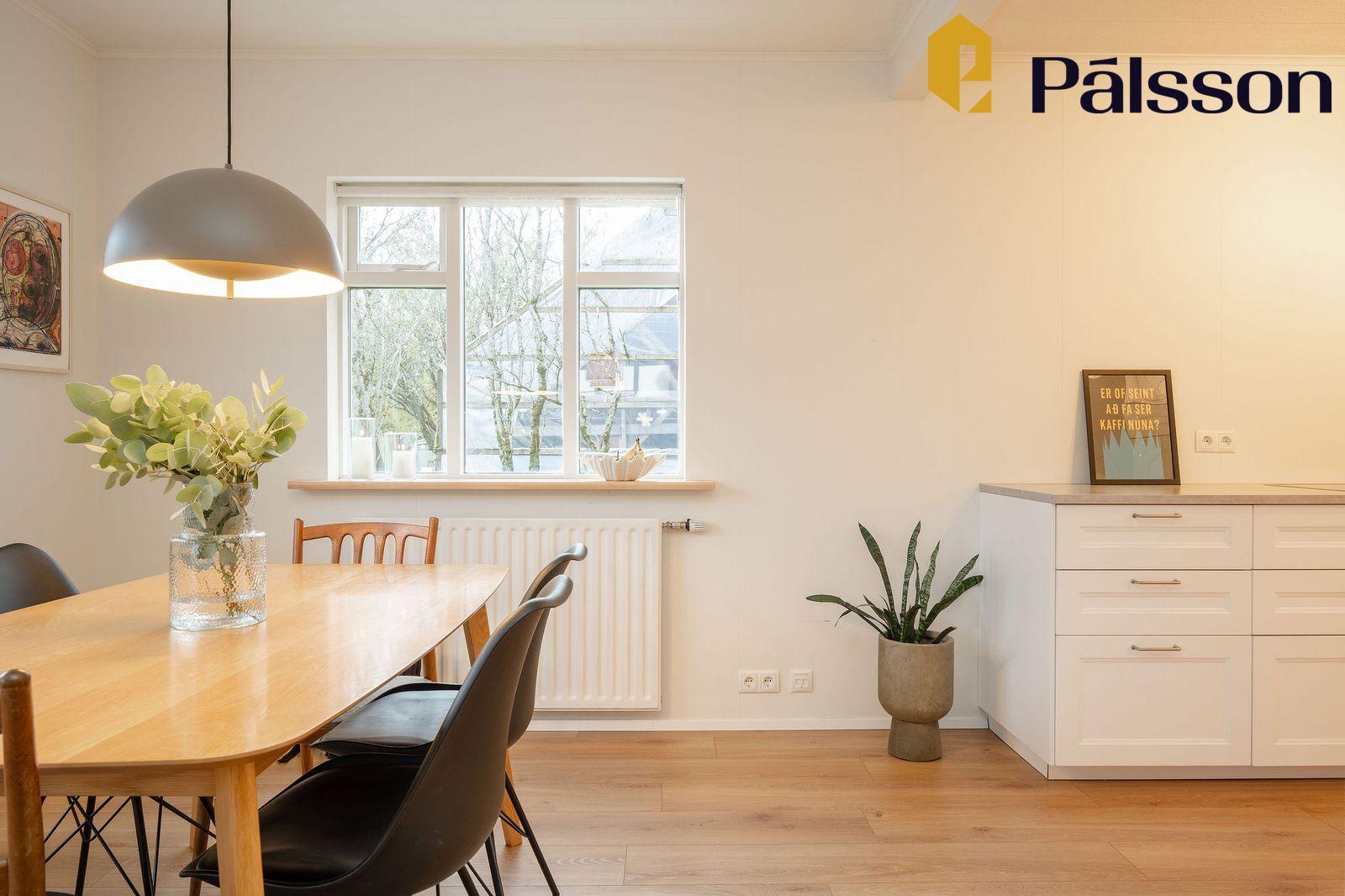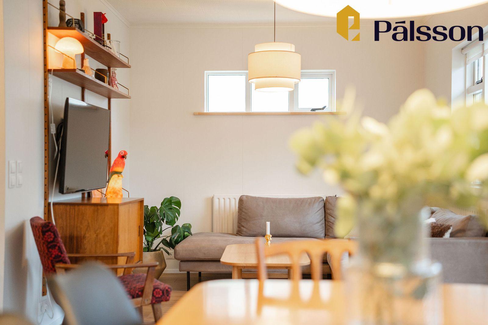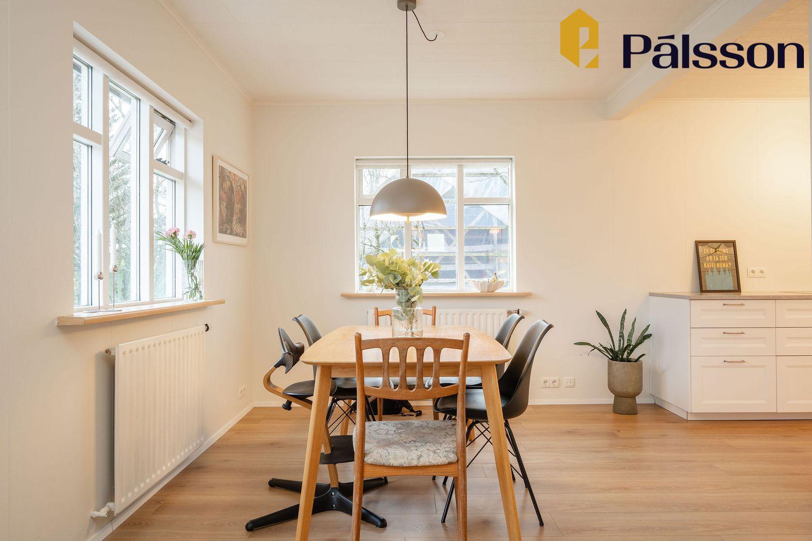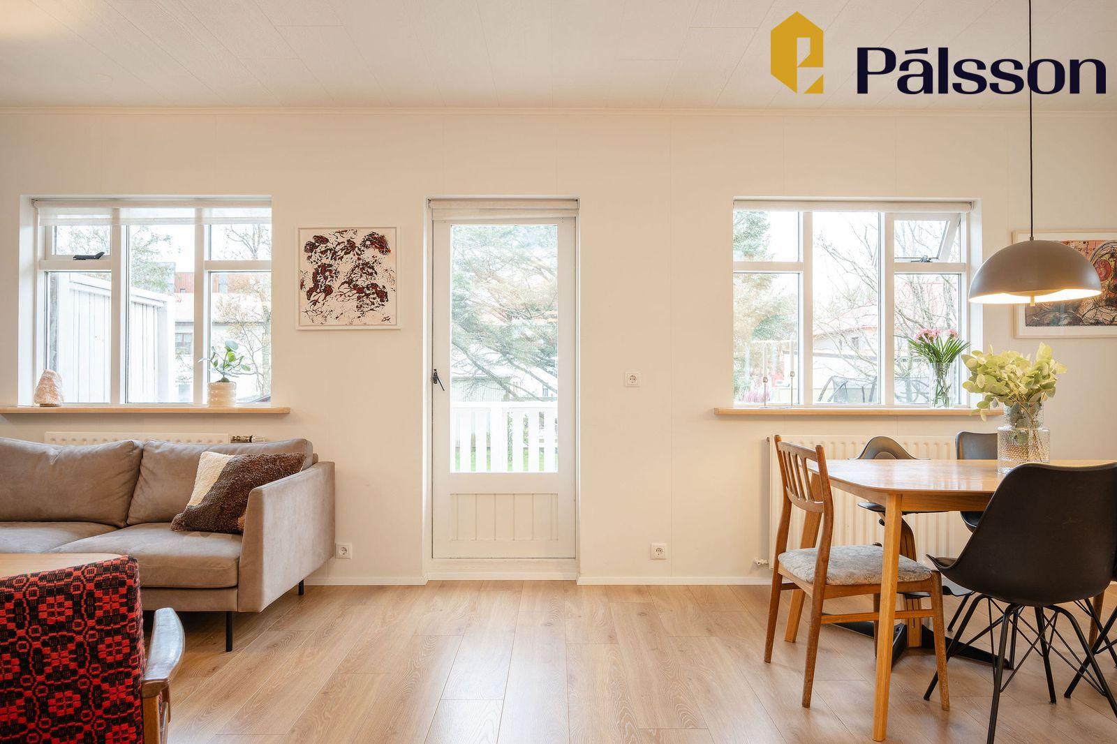 Stofa/borðstofa er opin við eldhús sem skapar sérlega góða birtu í rúmgóðu alrýminu. Þar er gengið út á pall með stiga niður í fallega garðinn.