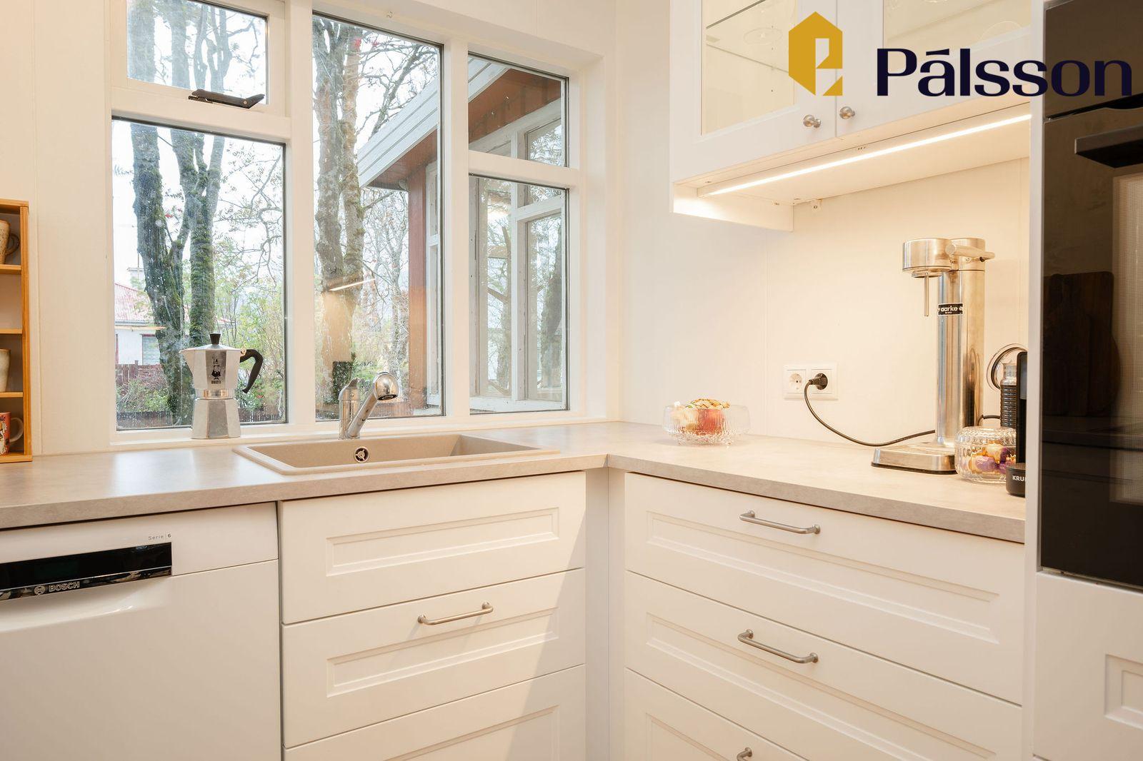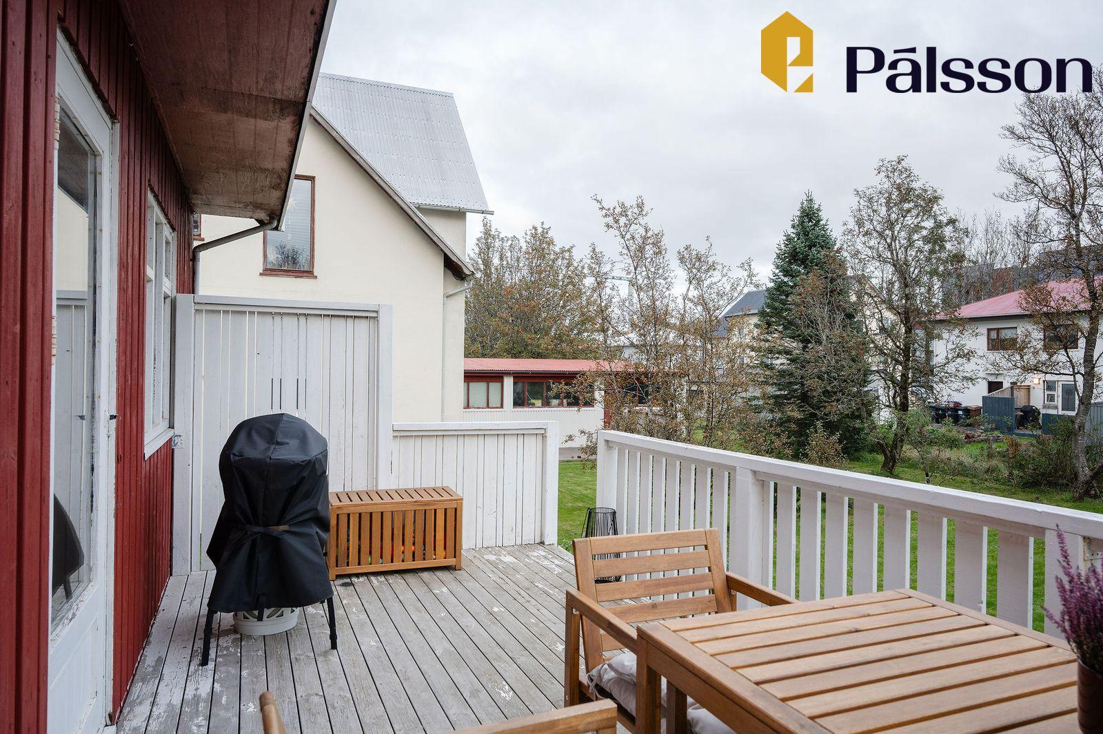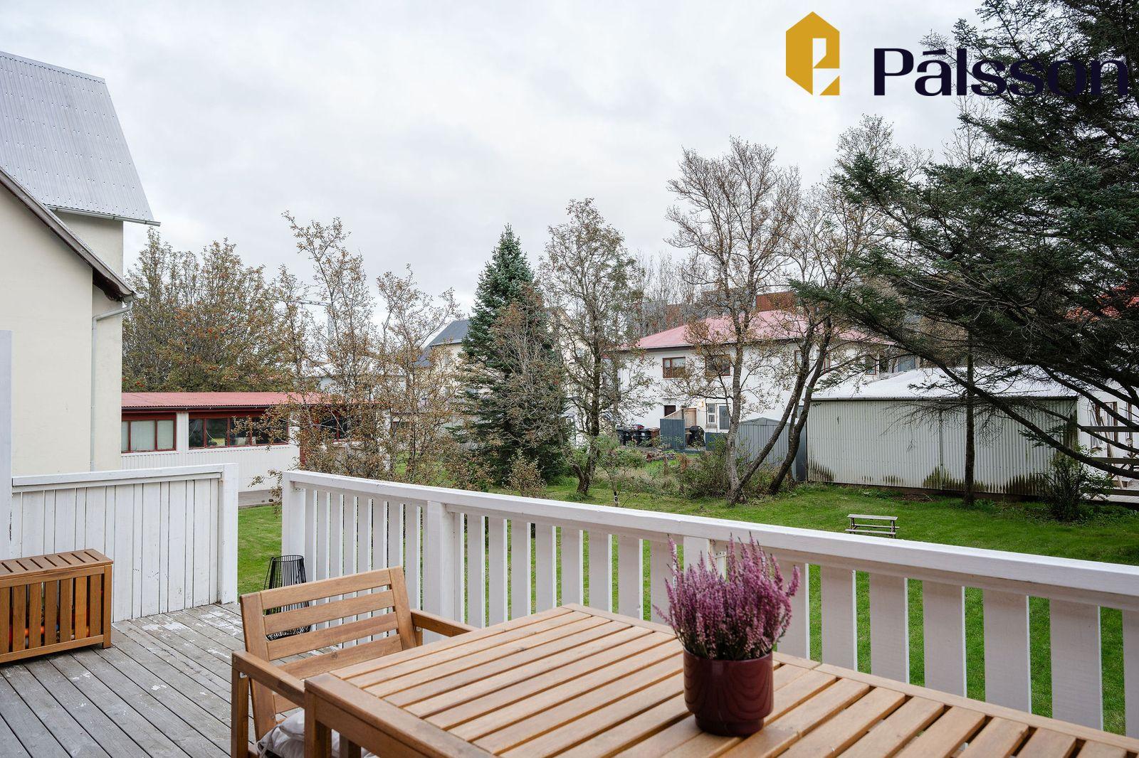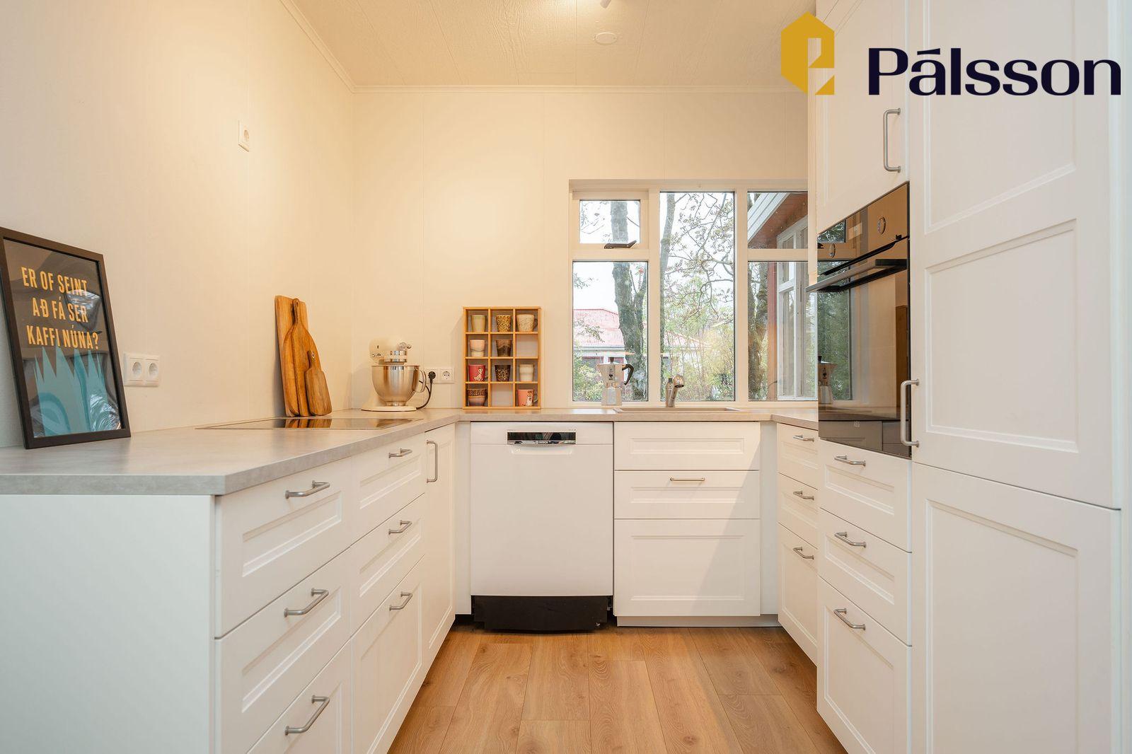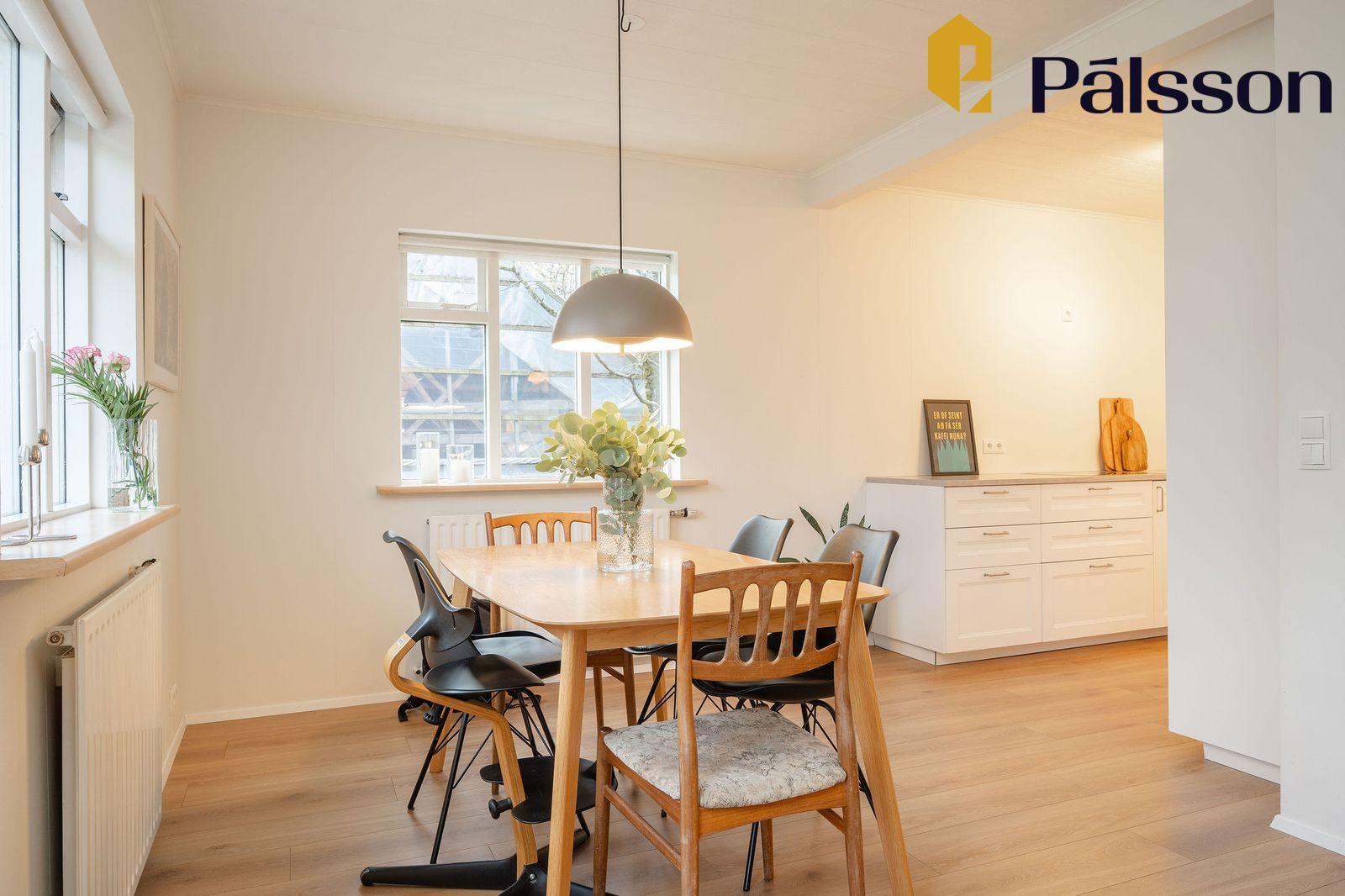Stofa/borðstofa er opin við eldhús sem skapar sérlega góða birtu í rúmgóðu alrýminu. Þar er gengið út á pall með stiga niður í fallega garðinn.