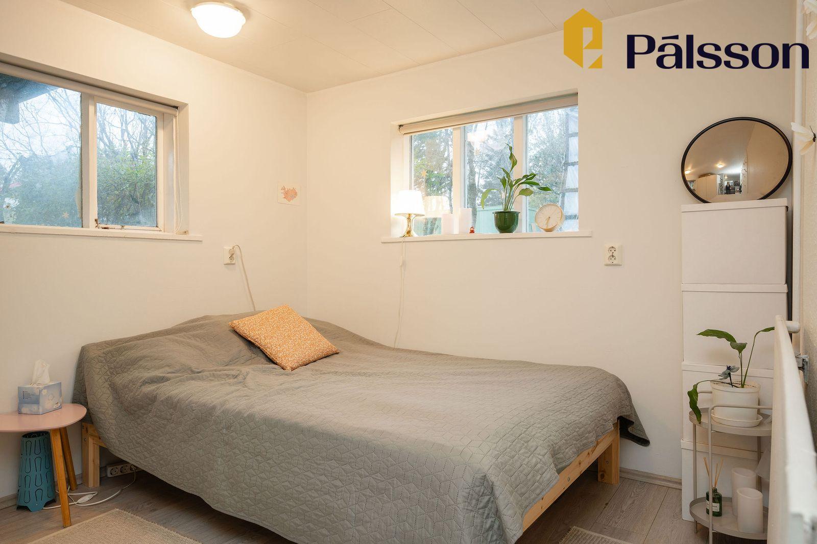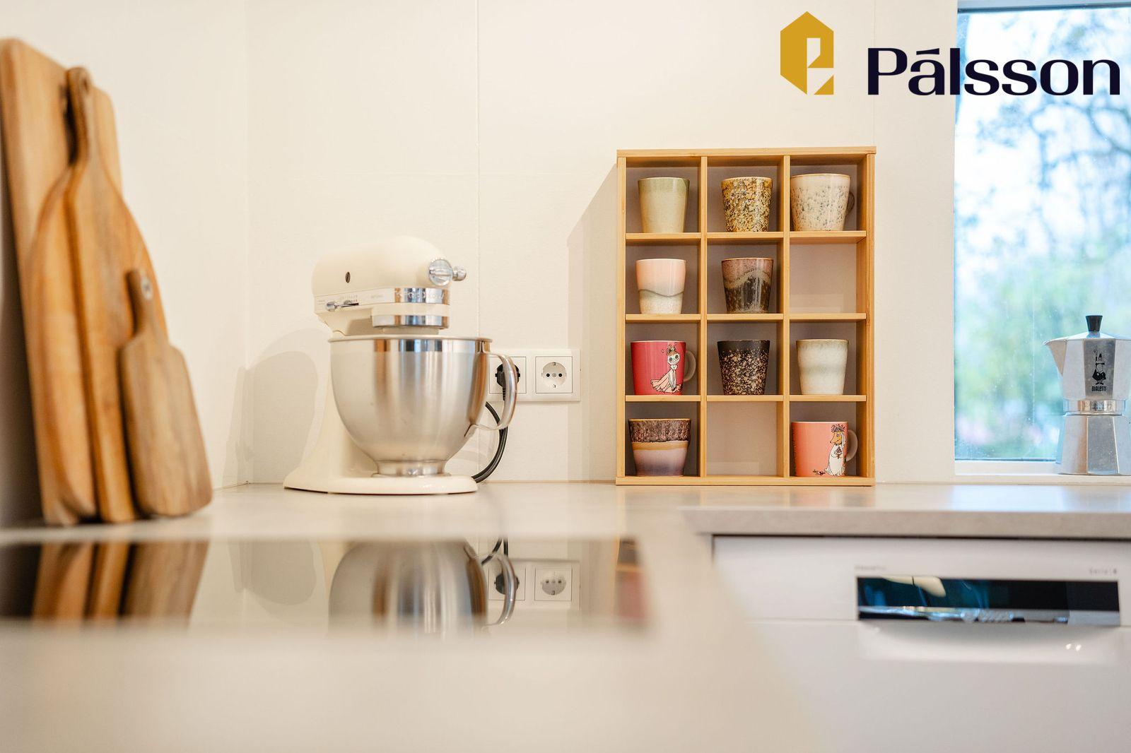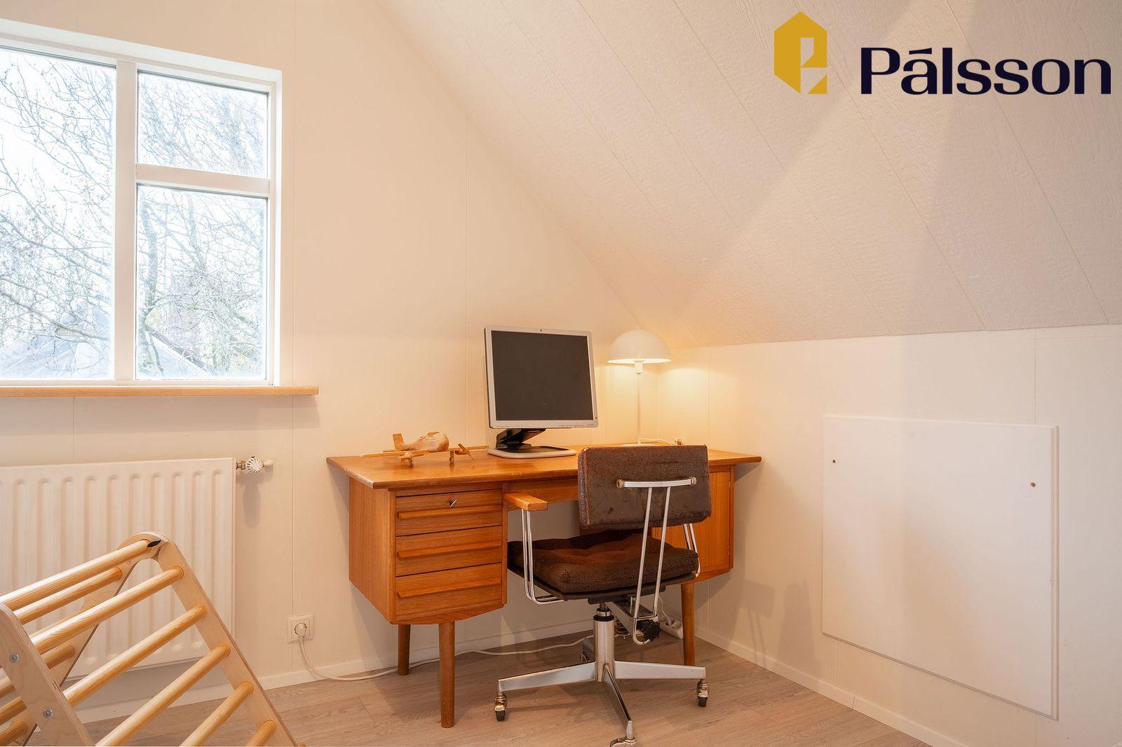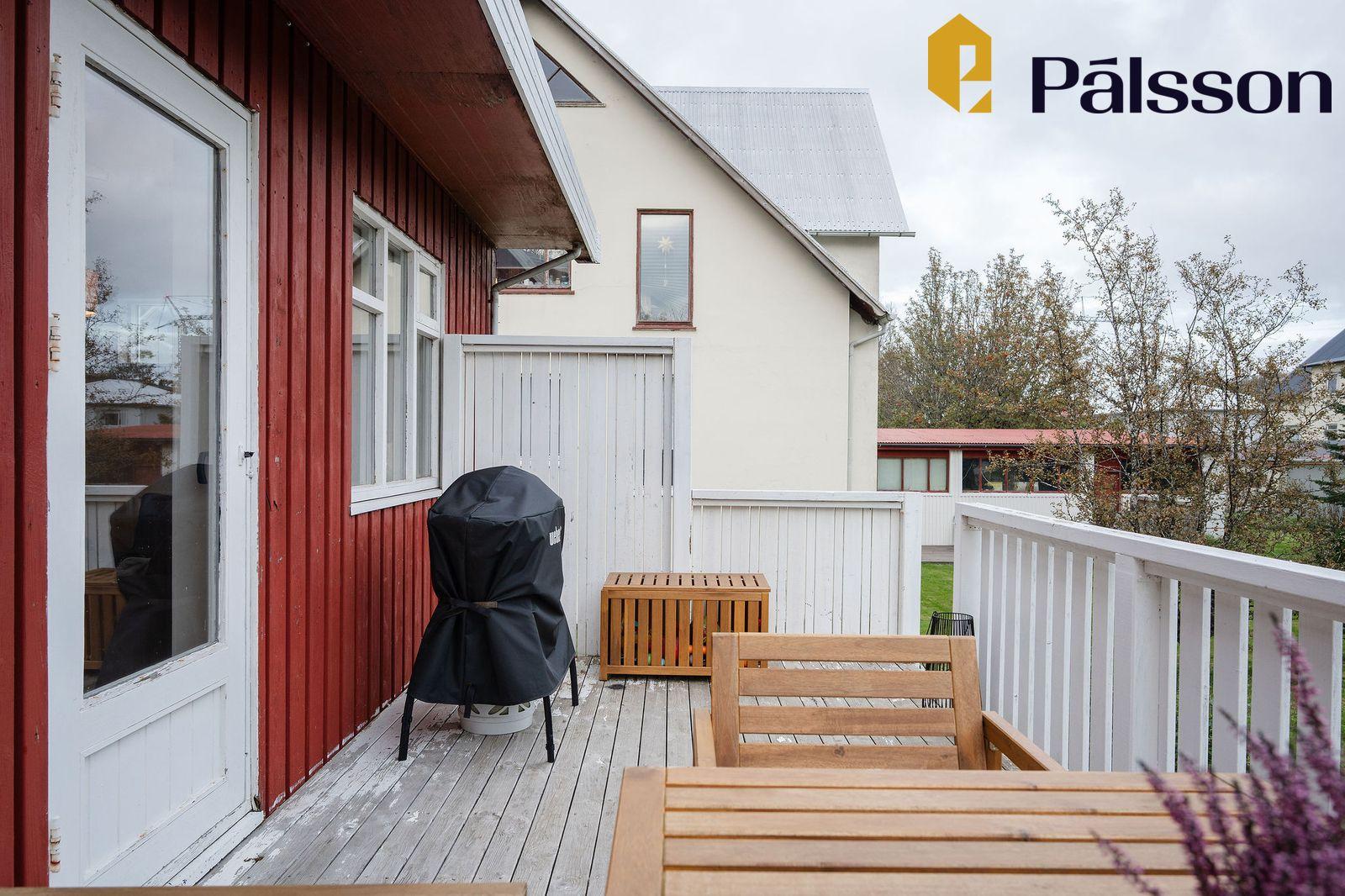 Stofa/borðstofa er opin við eldhús sem skapar sérlega góða birtu í rúmgóðu alrýminu. Þar er gengið út á pall með stiga niður í fallega garðinn.