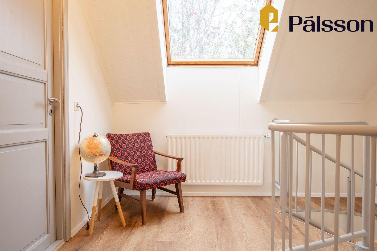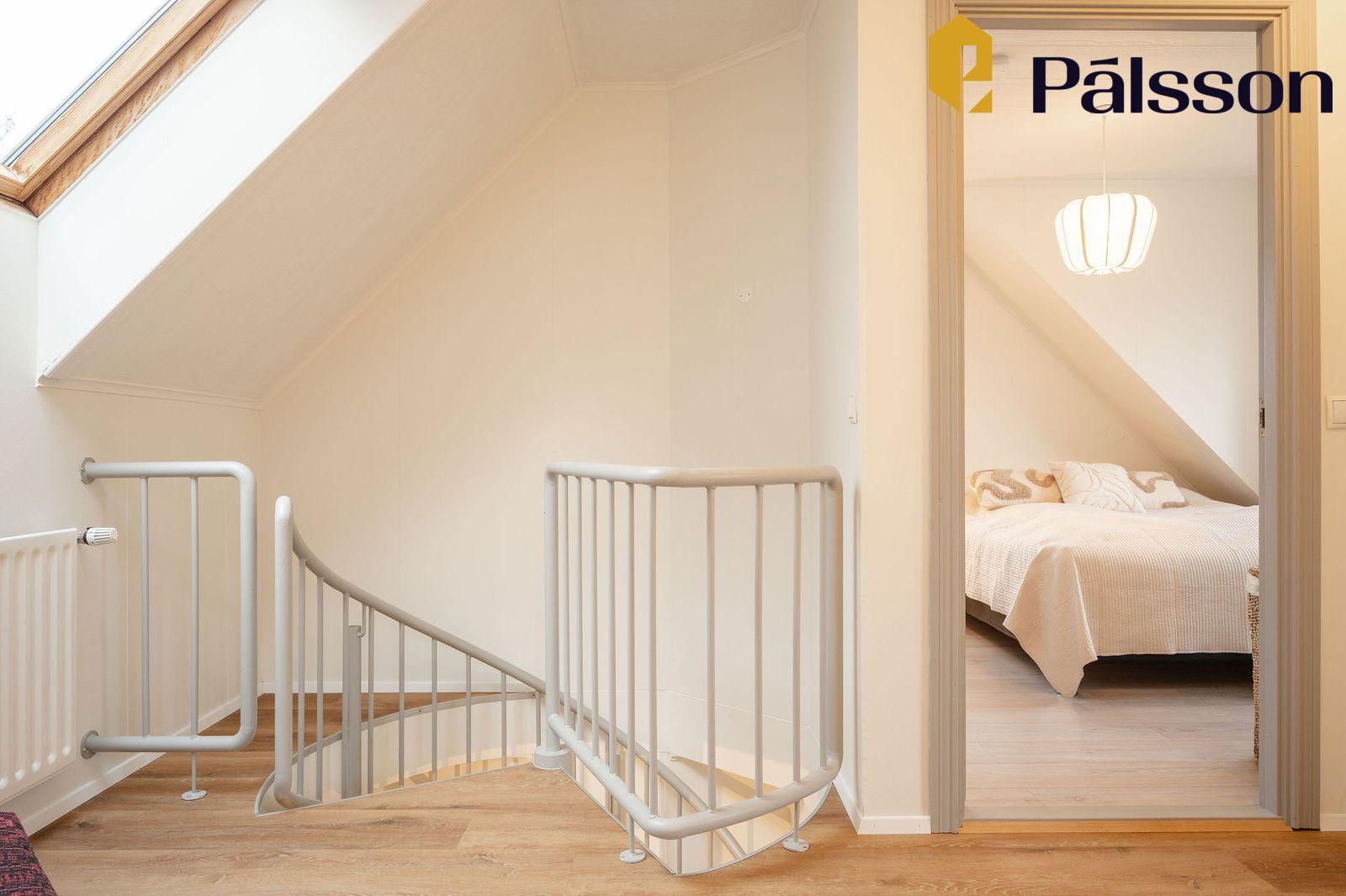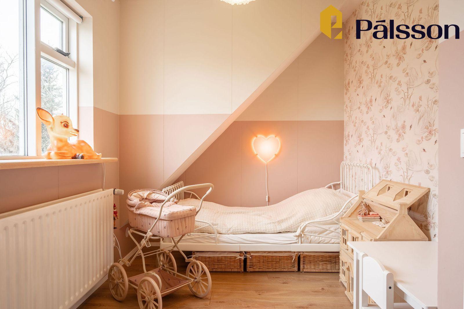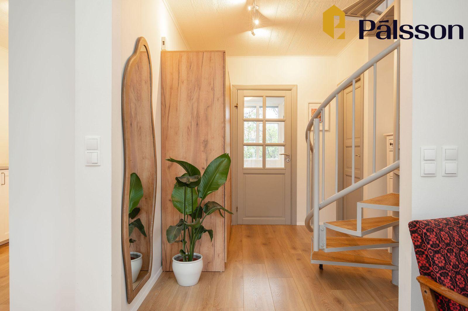 Stofa/borðstofa er opin við eldhús sem skapar sérlega góða birtu í rúmgóðu alrýminu. Þar er gengið út á pall með stiga niður í fallega garðinn.