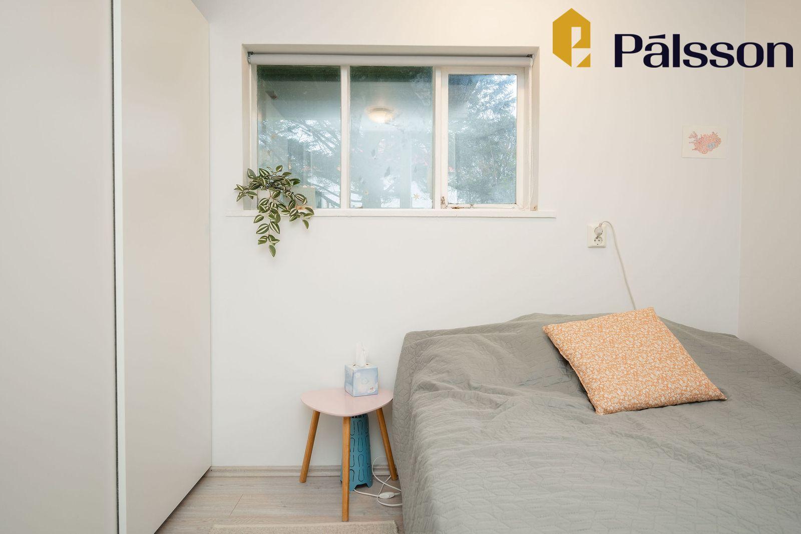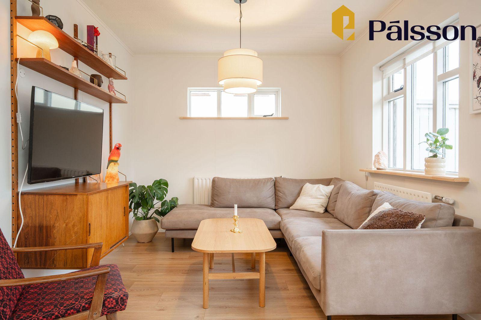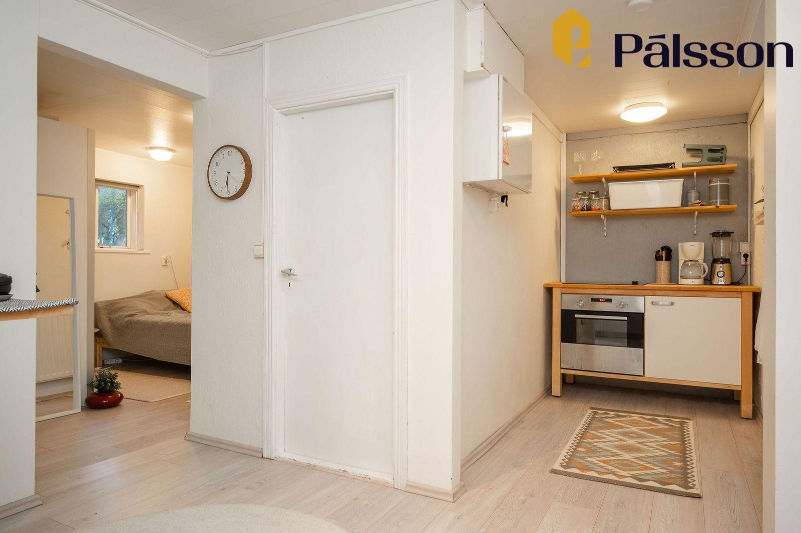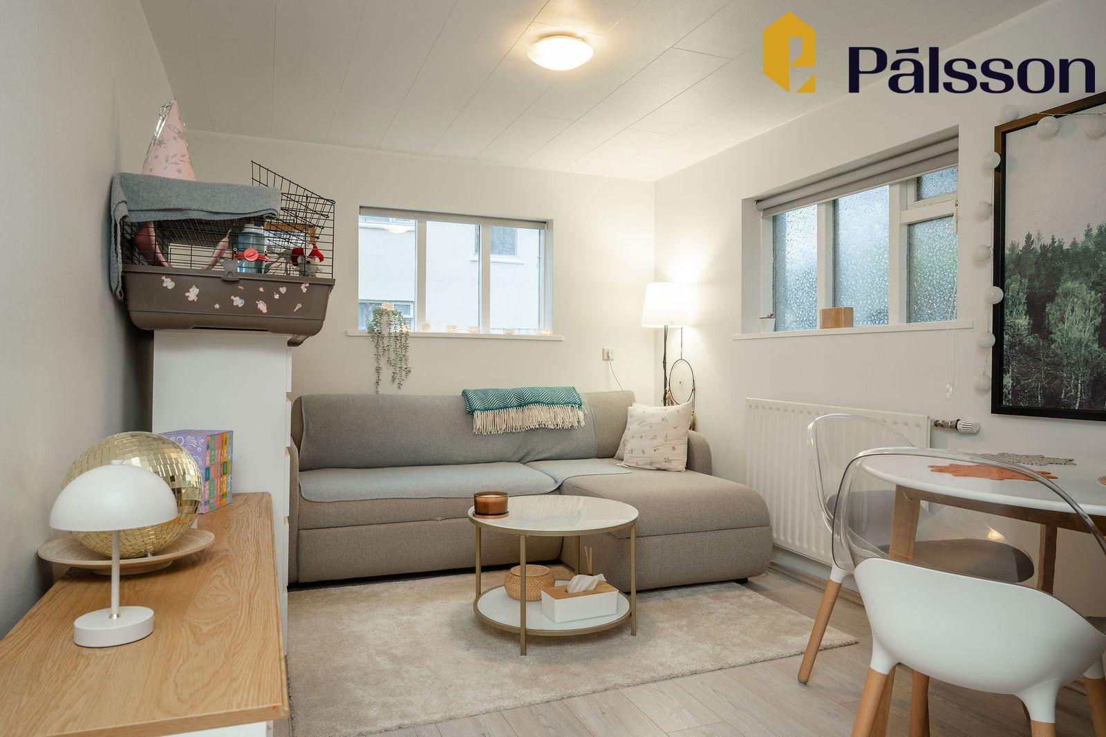 Kjallaraíbúðin er 48,2m2 stúdíóíbúð með sérinngangi. Hún skiptist í stofu, eldhús, svefnherbergi, baðherbergi og geymslu sem hægt er að nýta sem þvottaaðstöðu með þvottavél og þurkara.