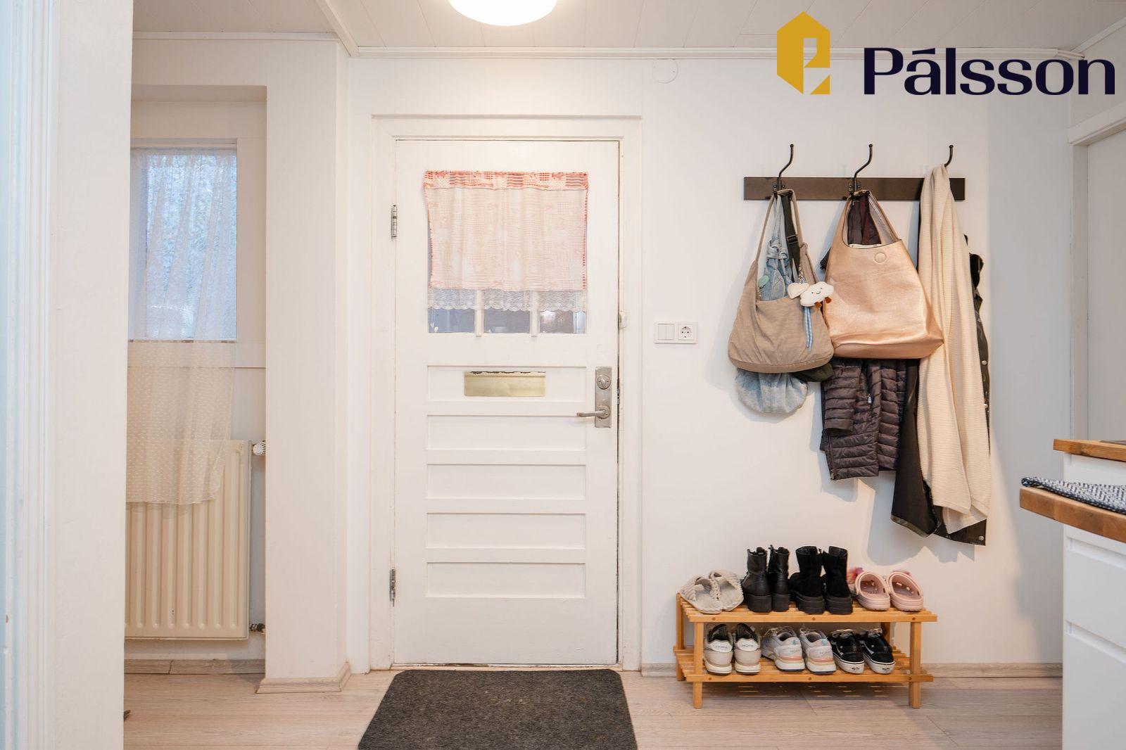 Forstofa er björt með gluggum og flísalögðu gólfi.