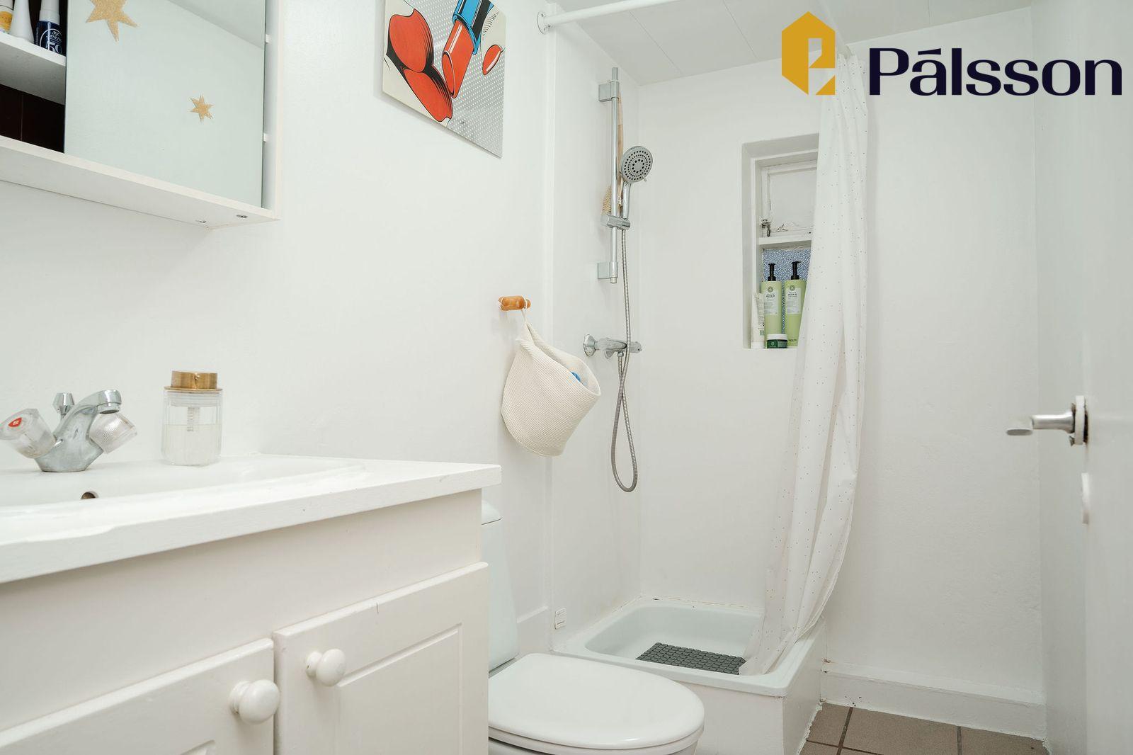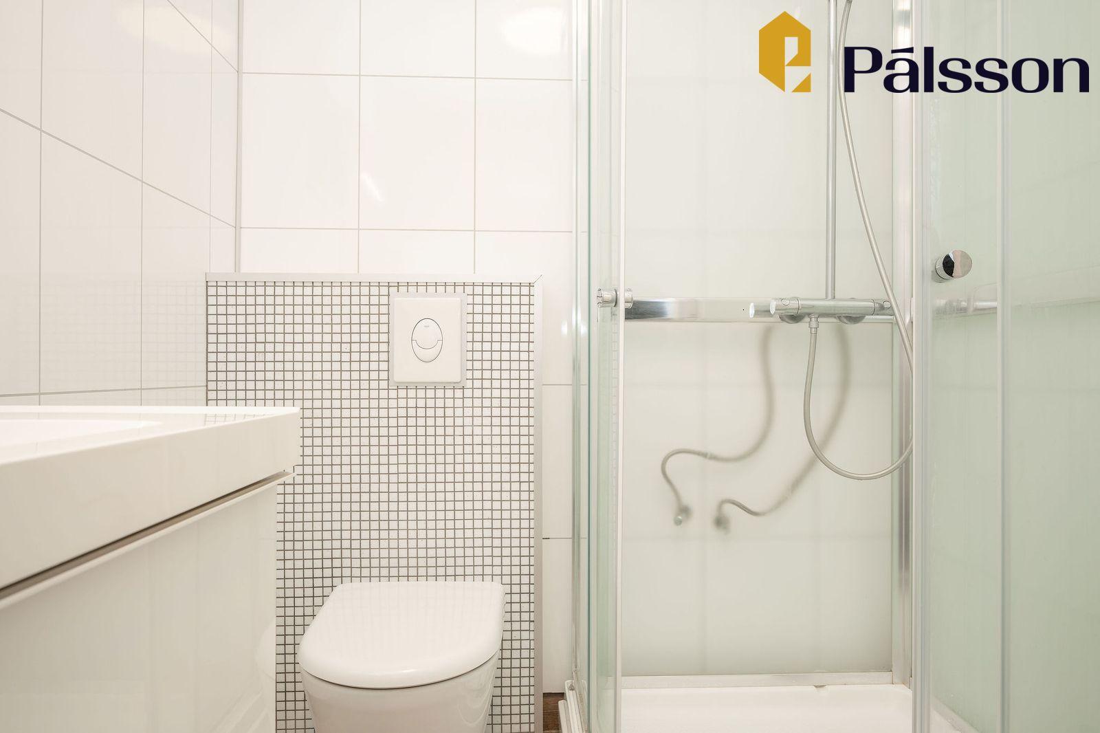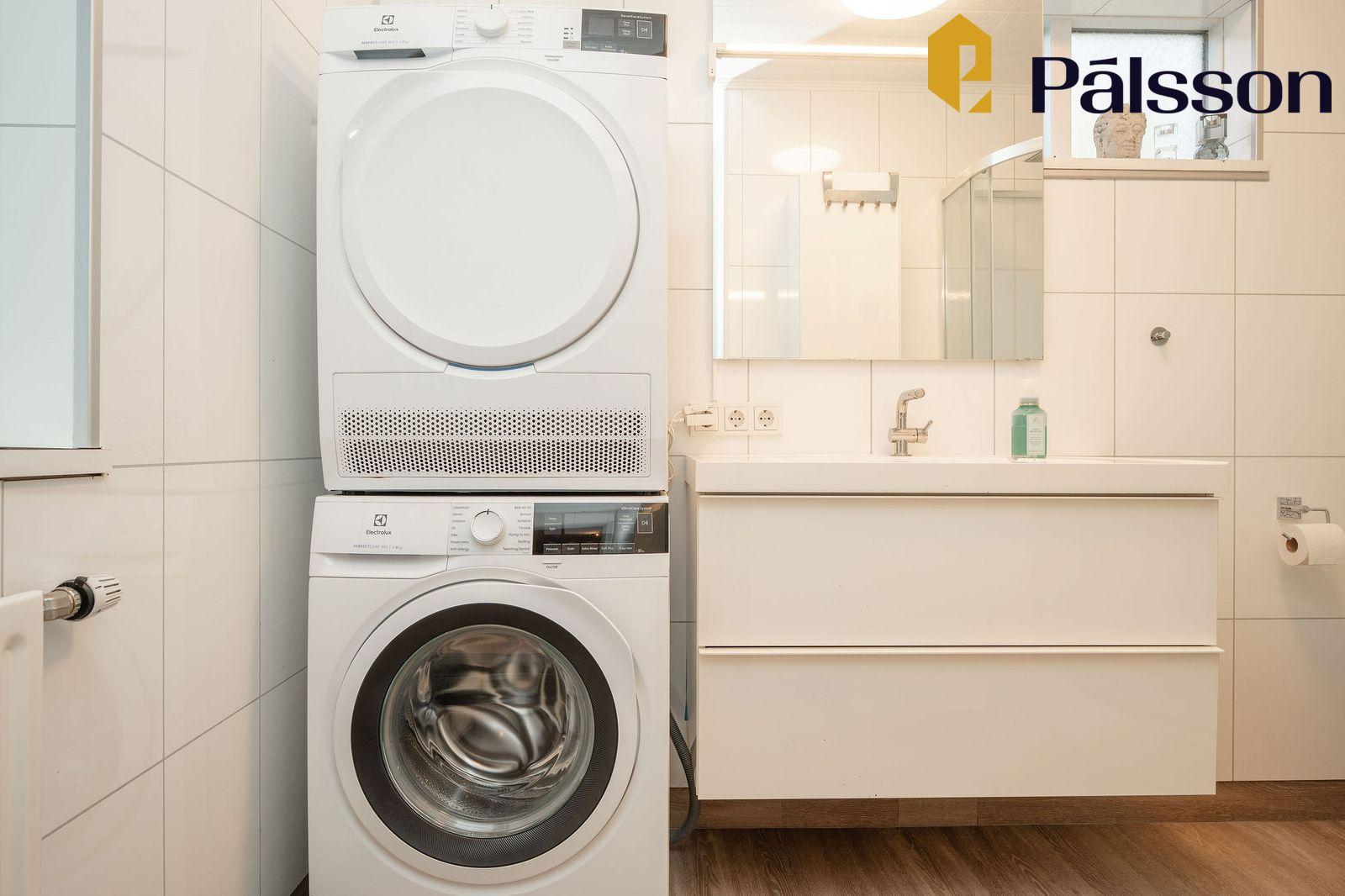 Baðherbergi er rúmgott með opnanlegum glugga, vaski í góðri innréttingu, sturtuklefa og þvottaaðstöðu fyrir þvottavél og þurkara.