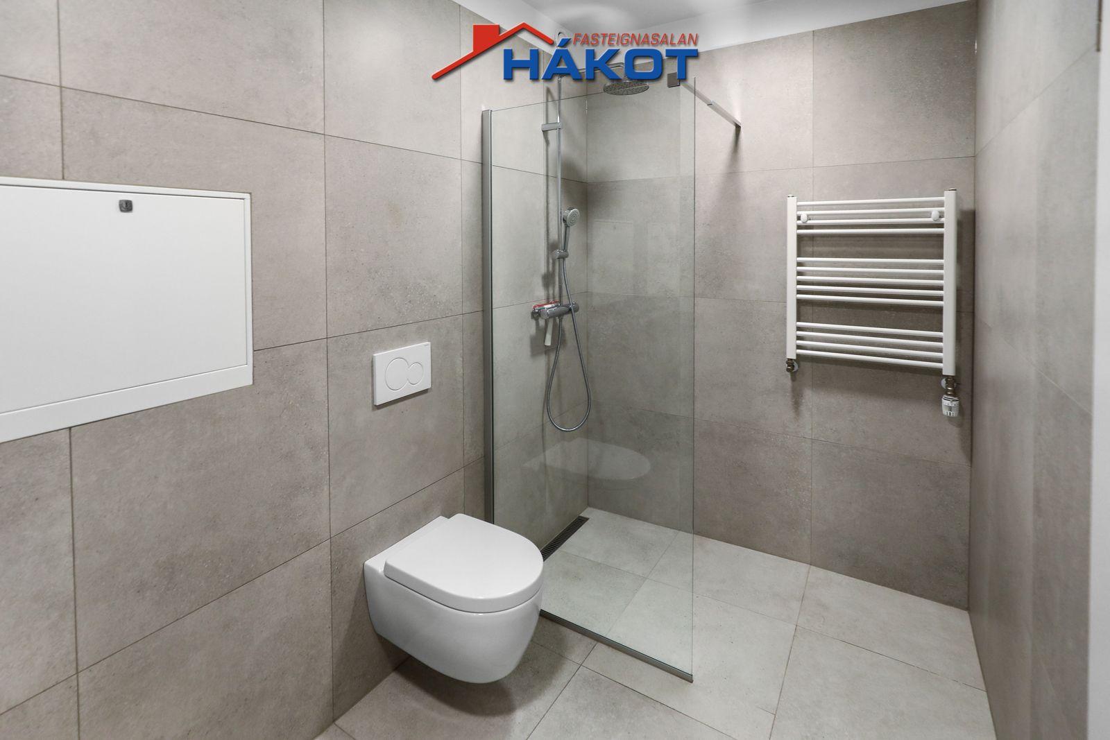 Baðherbergi (flísar, flísar á veggjum, sturta í gólf, hvít innrétting, upphengt wc, handklæðaofn, tengi fyrir þvottavél).
