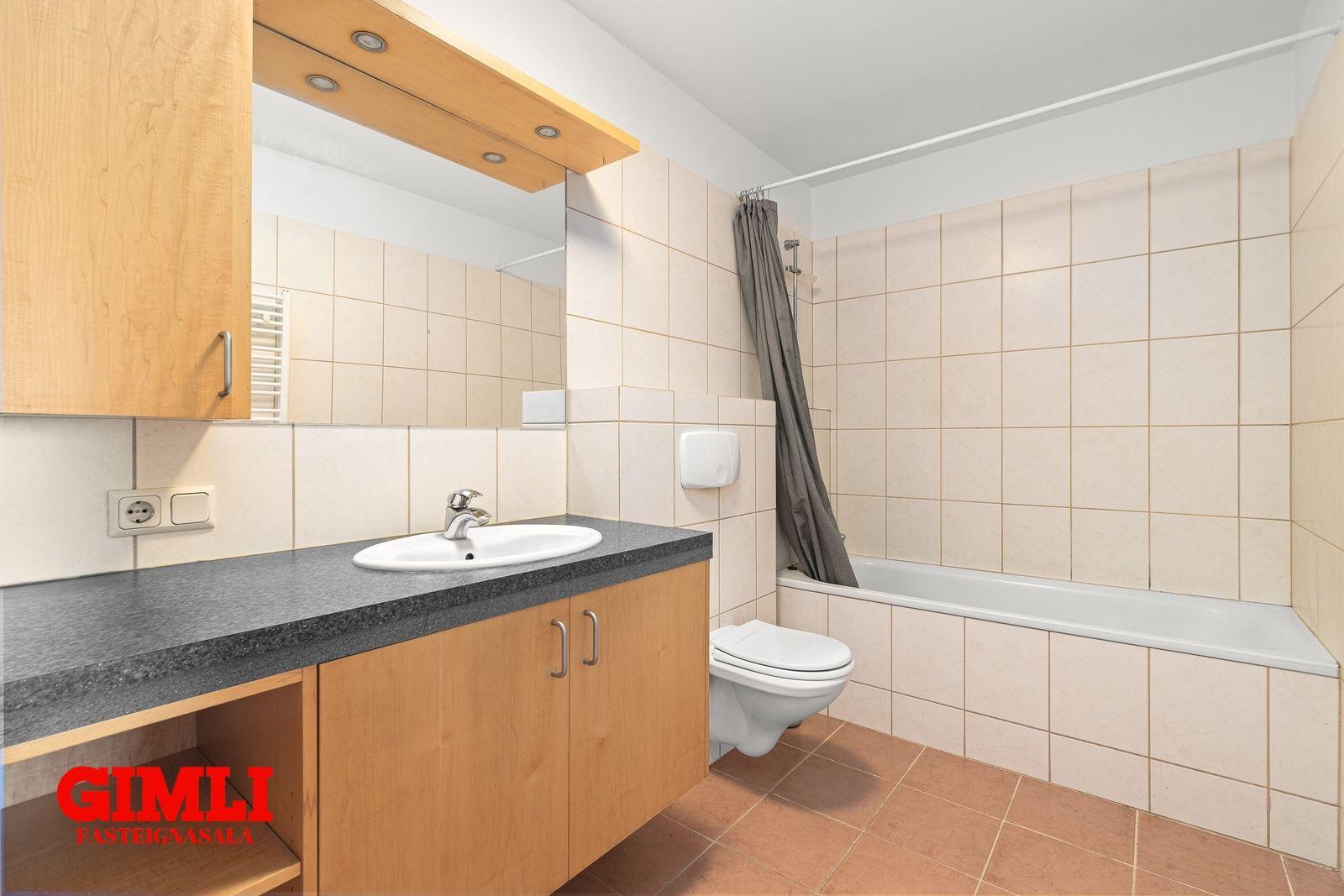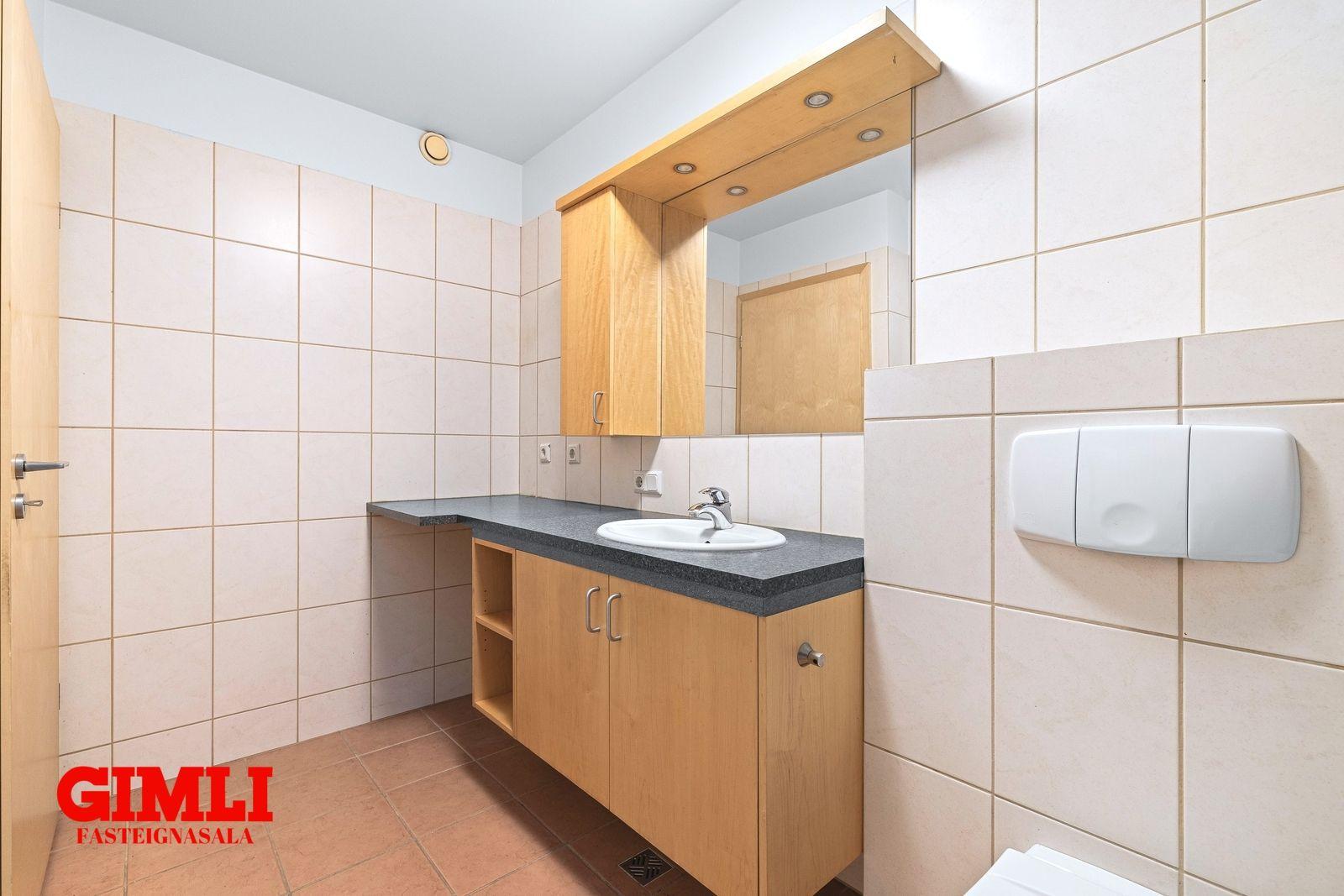 Baðherbergið er með flísum á gólfi og veggjum, góð beyki innrétting með granít borðplötu, vegghengt salerni, tengi fyrir þvottavél, handklæðaofn og baðkar með sturtu.