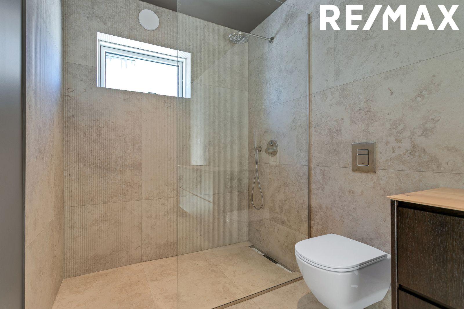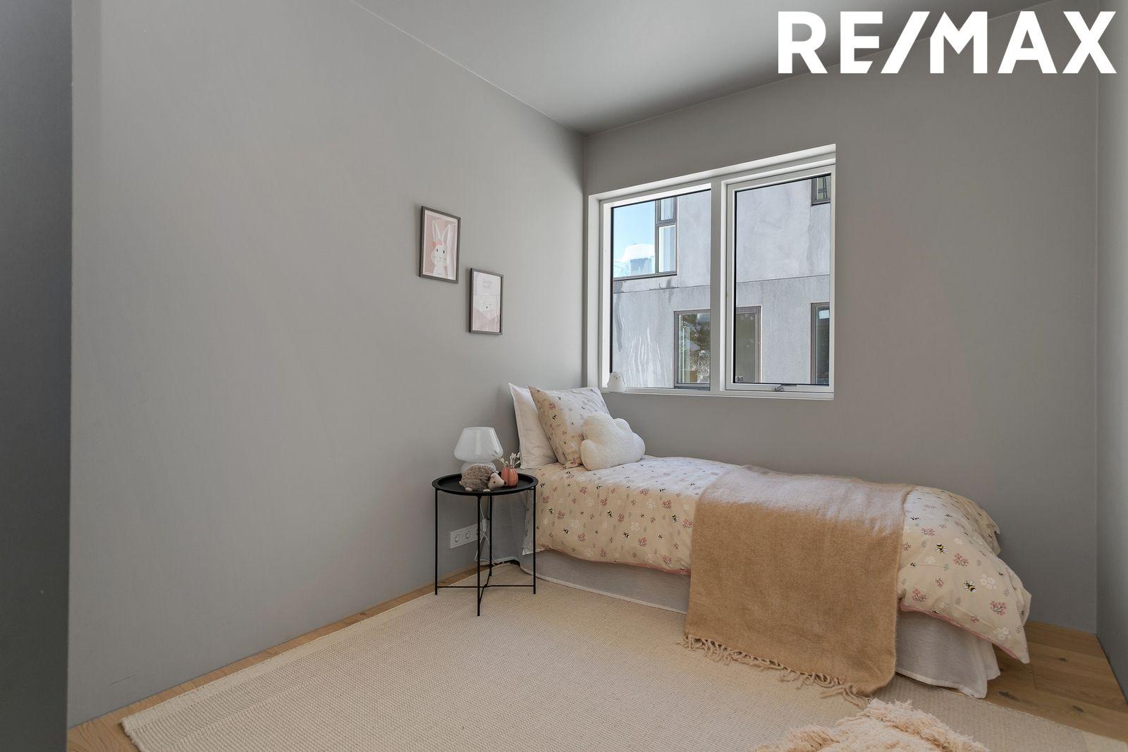 Neðri hæð: Tvö svefnherbergi með fataskápum. Stórt alrými með útgengt út í bakgarðinn. Hægt er að gera fjórða svefnherbergið úr hluta alrýmisins. Geymsla með hurð út í garð. Baðherbergi 2 er flísalagt í hólf og gólf. Upphengt klósett, innrétting, sturta, gluggi fyrir loftun og innrétting fyrir þvottavél og þurrkara.