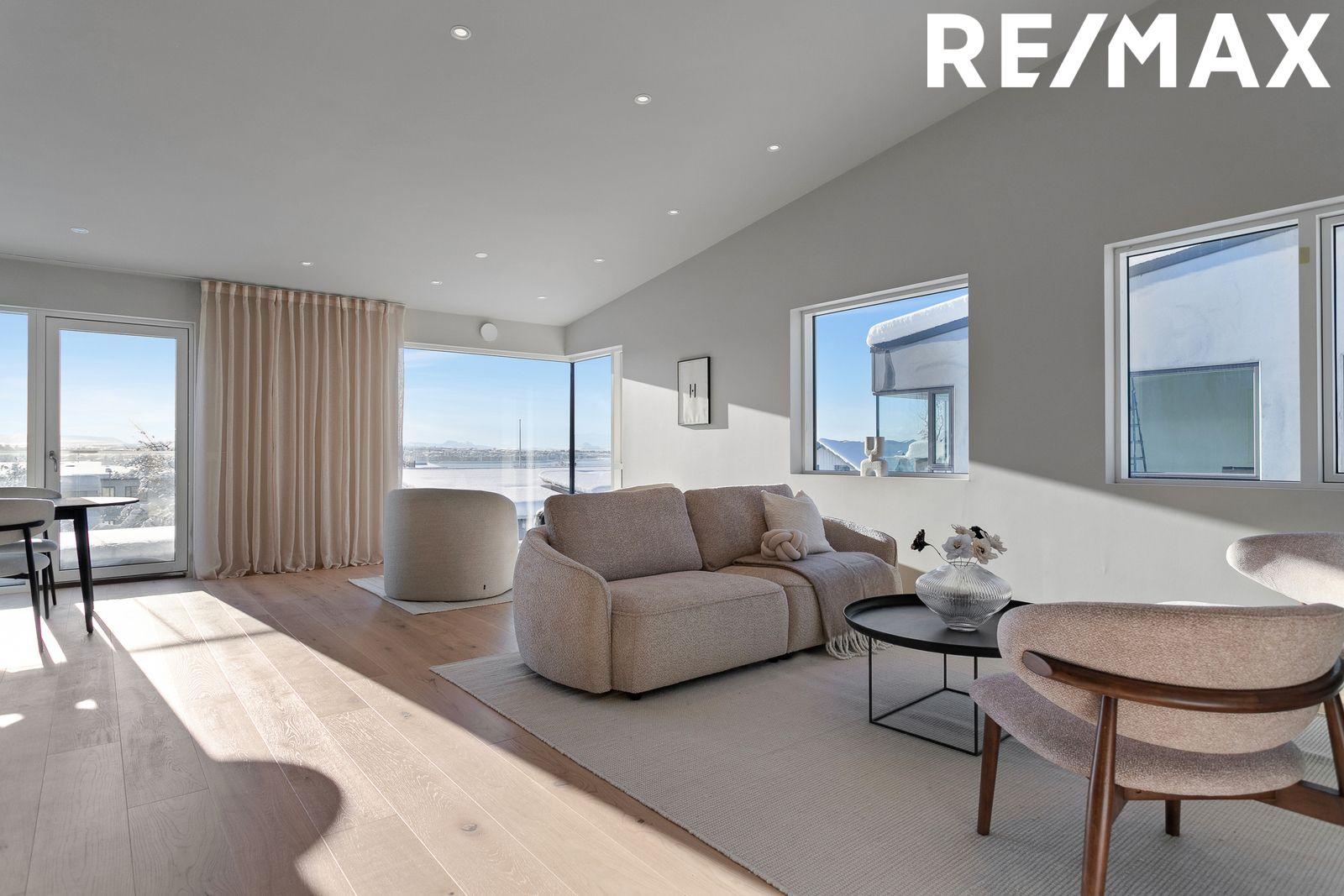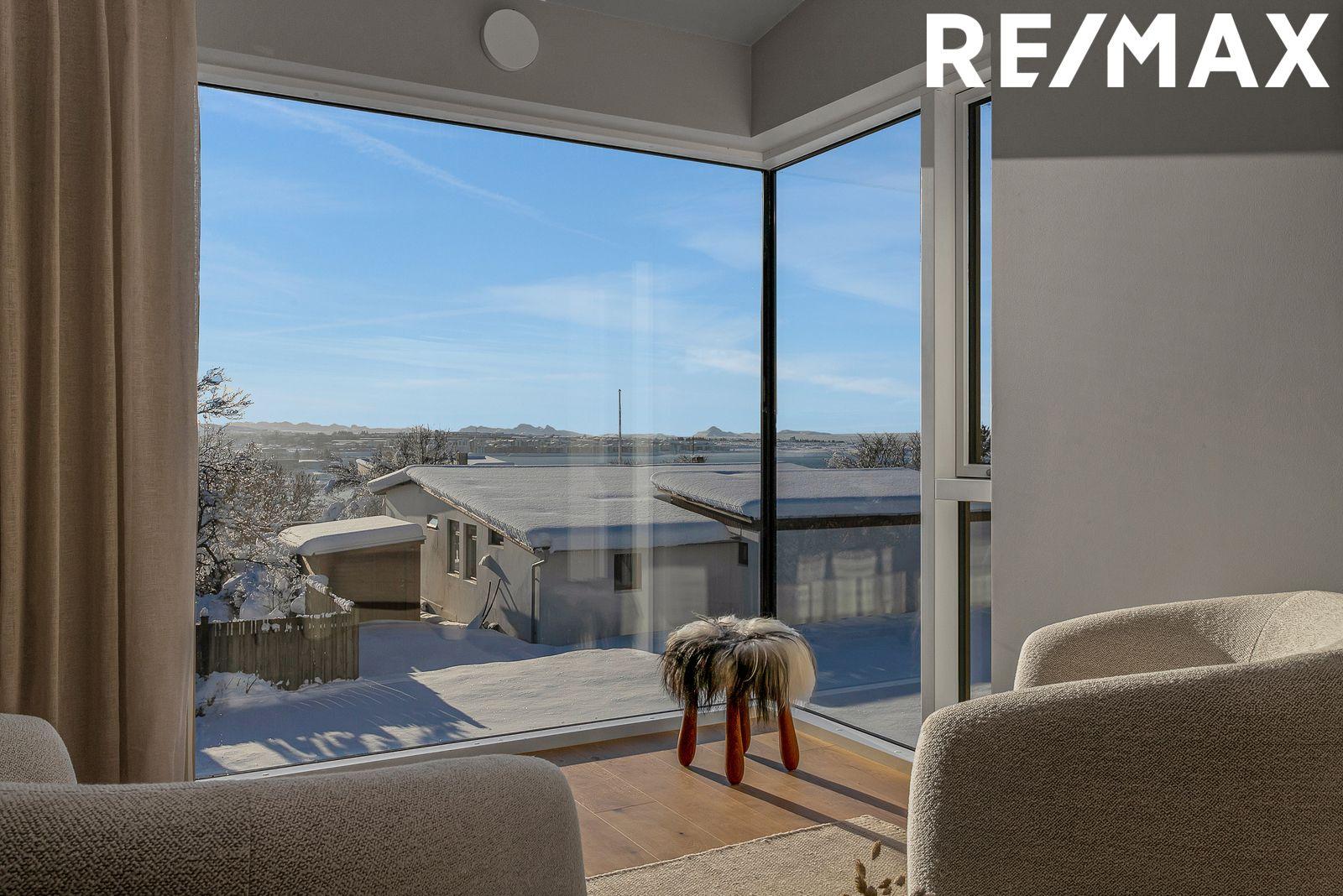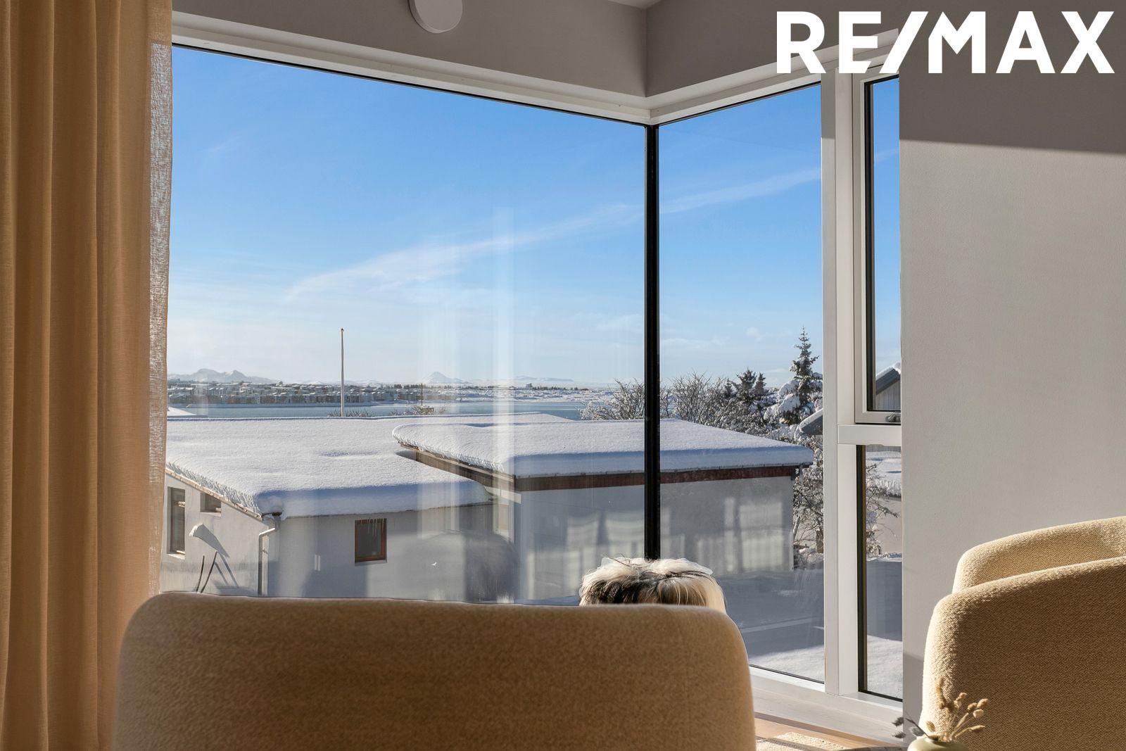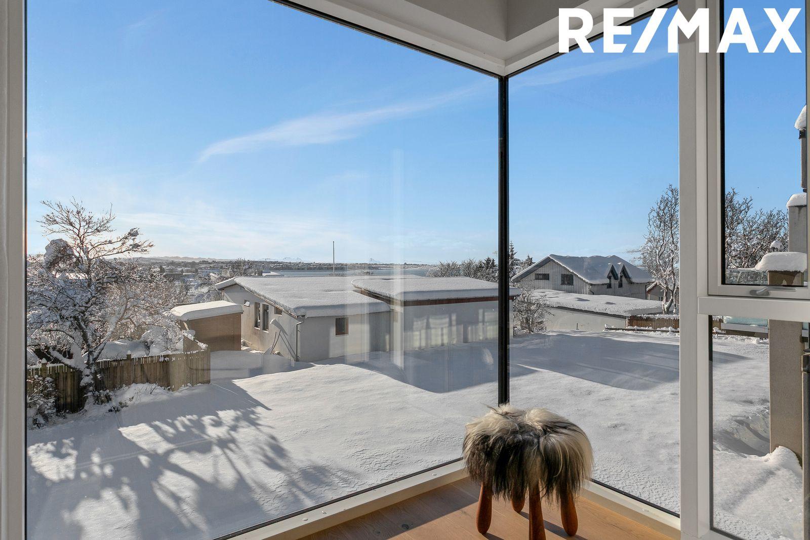 Efri hæð: Stofan og eldhúsið er í opnu alrými. Fallegt útsýni yfir byggð og til sjávar. Gólfsíður gluggi og horngluggi sem gefa eigninni mikinn sjarma (enginn gluggapóstur í horninu). Svalir eru með glerhandriði og snúa í suðurátt. Eldhúsið er með sérsmíðuðum innréttingum. Tveir bakaraofnar, helluborð, innbyggður ísskápur og uppþvottavél. Kaupandi fær að velja borðplötu (stein) á eldhúsið. Hjónaherbergið er með stórum fataskáp. Baðherbergi 1 er flísalagt í hólf og gólf. Upphengt klósett, innrétting, baðkar með sturtuaðstöðu og gluggi fyrir loftun.