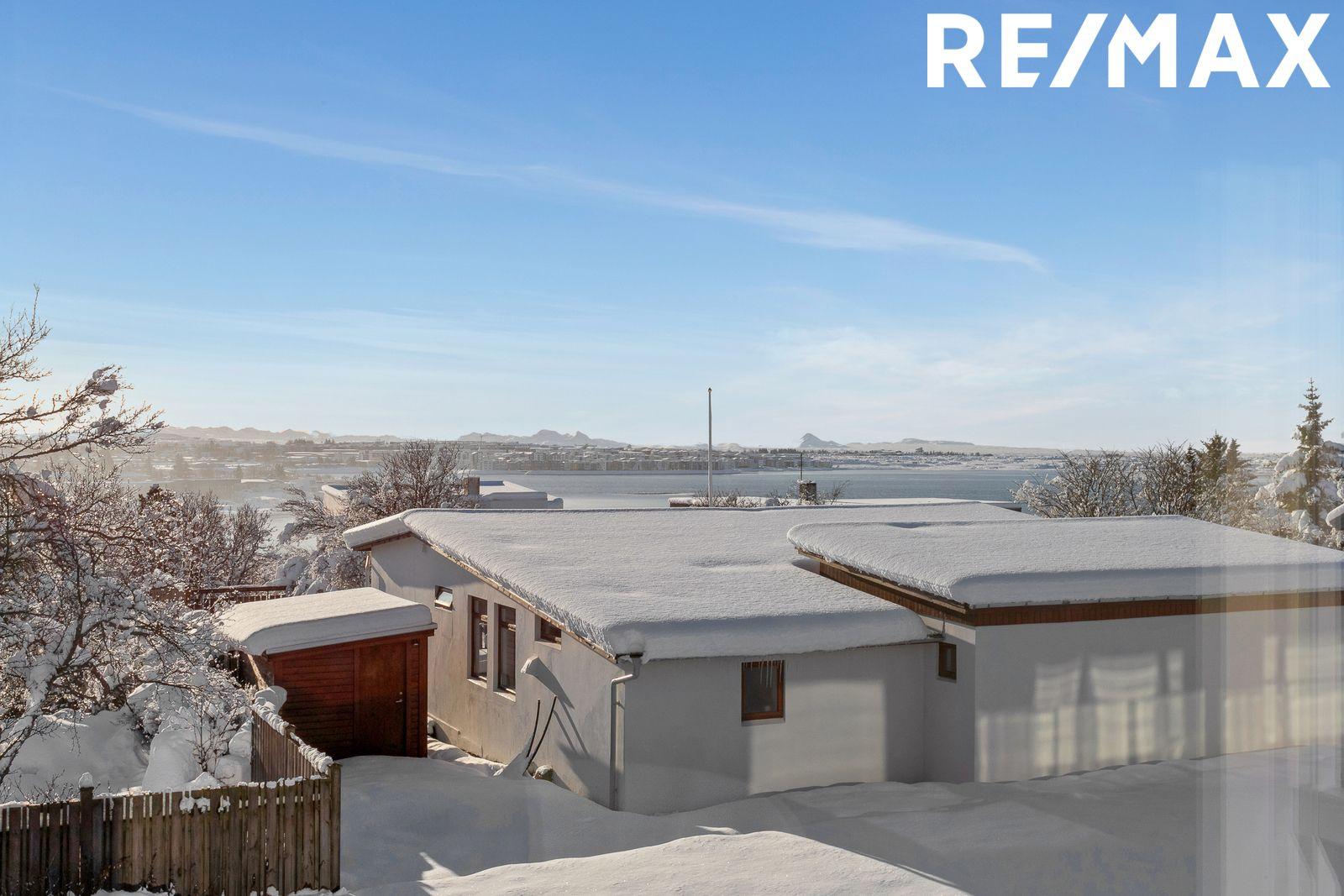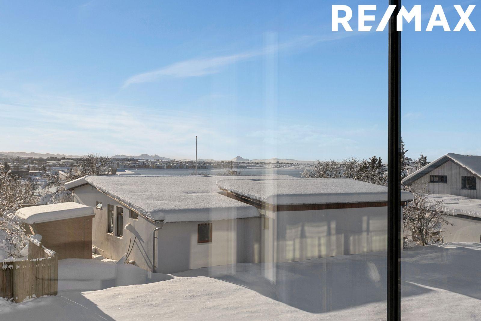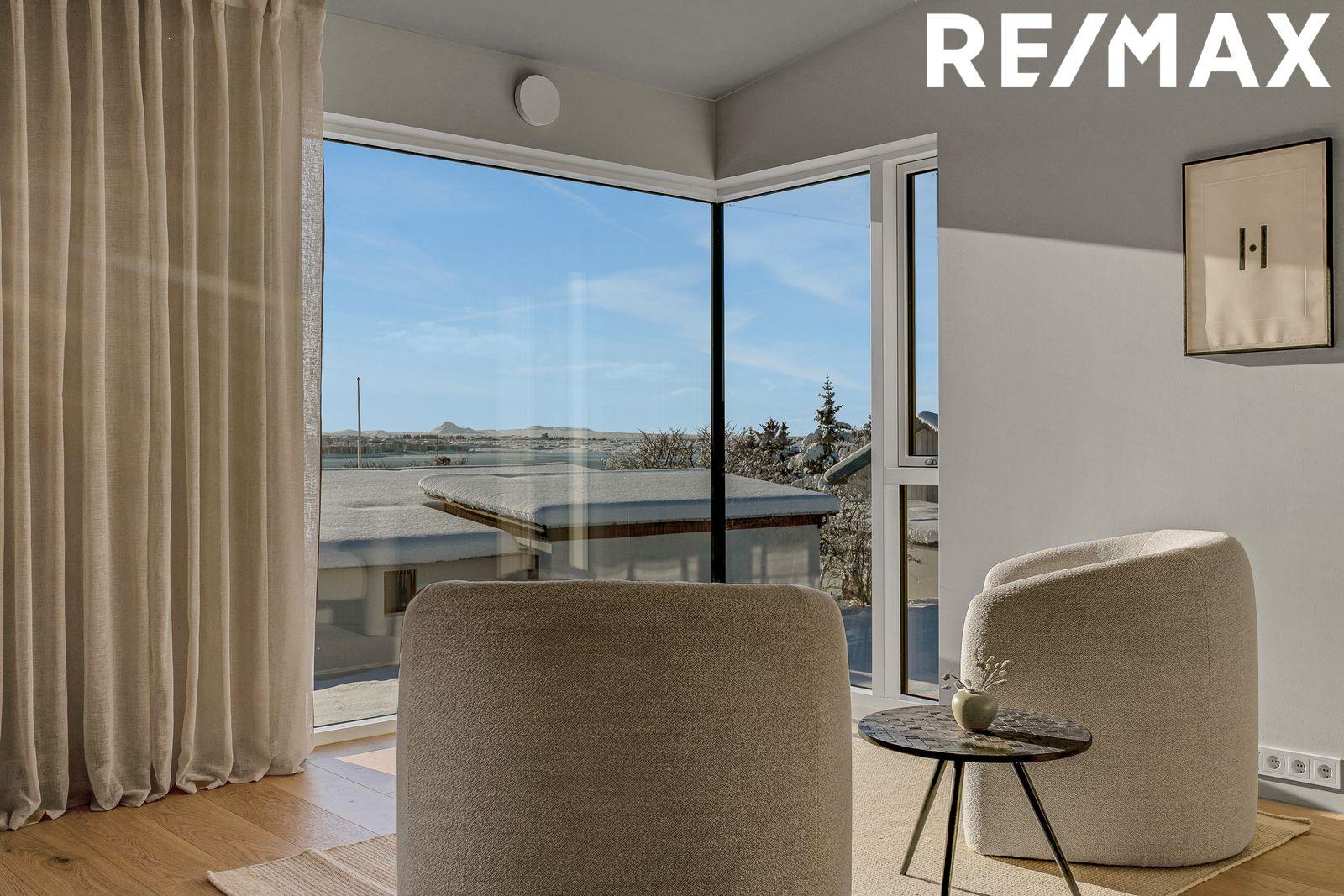 Efri hæð: Stofan og eldhúsið er í opnu alrými. Fallegt útsýni yfir byggð og til sjávar. Gólfsíður gluggi og horngluggi sem gefa eigninni mikinn sjarma (enginn gluggapóstur í horninu). Svalir eru með glerhandriði og snúa í suðurátt. Eldhúsið er með sérsmíðuðum innréttingum. Tveir bakaraofnar, helluborð, innbyggður ísskápur og uppþvottavél. Kaupandi fær að velja borðplötu (stein) á eldhúsið. Hjónaherbergið er með stórum fataskáp. Baðherbergi 1 er flísalagt í hólf og gólf. Upphengt klósett, innrétting, baðkar með sturtuaðstöðu og gluggi fyrir loftun.