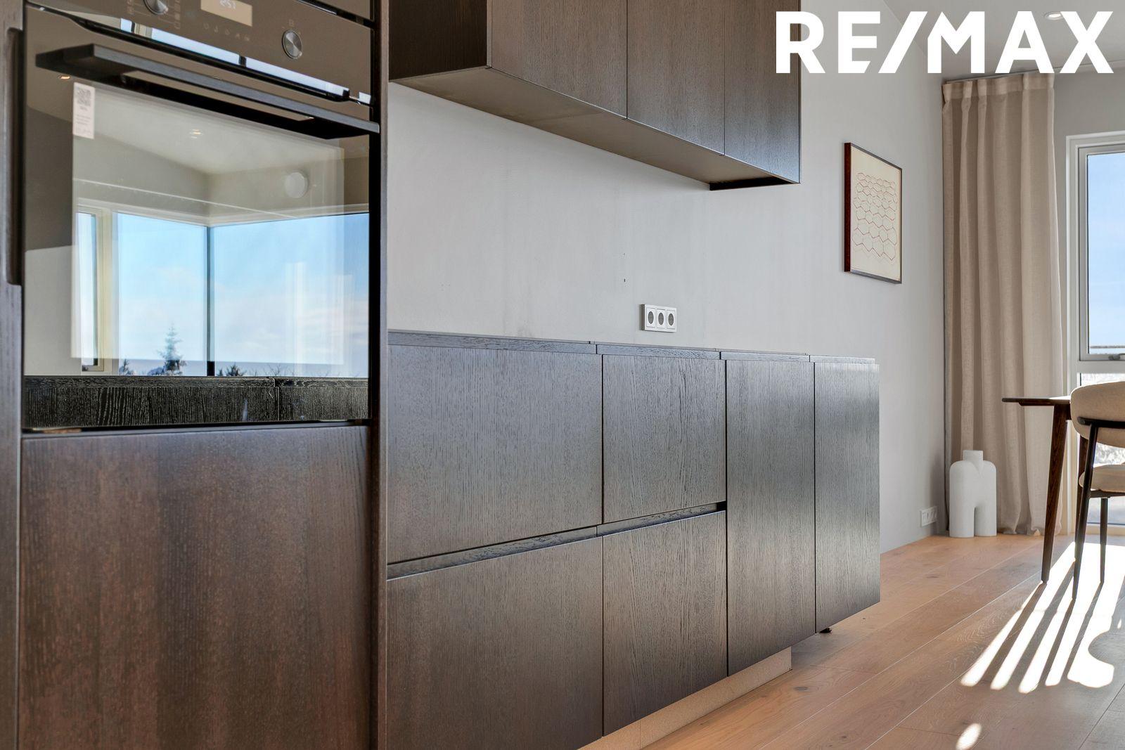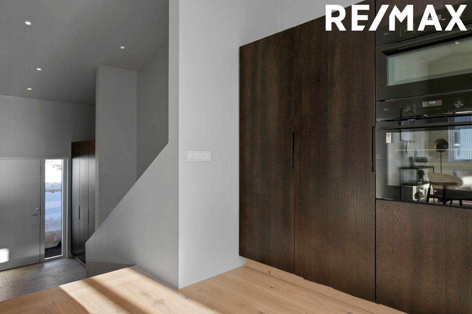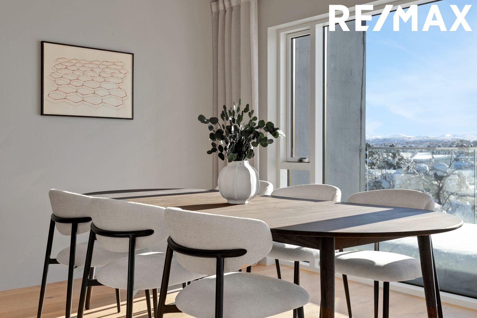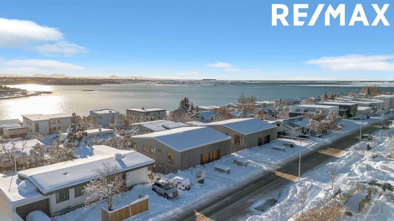 Efri hæð: Stofan og eldhúsið er í opnu alrými. Fallegt útsýni yfir byggð og til sjávar. Gólfsíður gluggi og horngluggi sem gefa eigninni mikinn sjarma (enginn gluggapóstur í horninu). Svalir eru með glerhandriði og snúa í suðurátt. Eldhúsið er með sérsmíðuðum innréttingum. Tveir bakaraofnar, helluborð, innbyggður ísskápur og uppþvottavél. Kaupandi fær að velja borðplötu (stein) á eldhúsið. Hjónaherbergið er með stórum fataskáp. Baðherbergi 1 er flísalagt í hólf og gólf. Upphengt klósett, innrétting, baðkar með sturtuaðstöðu og gluggi fyrir loftun.