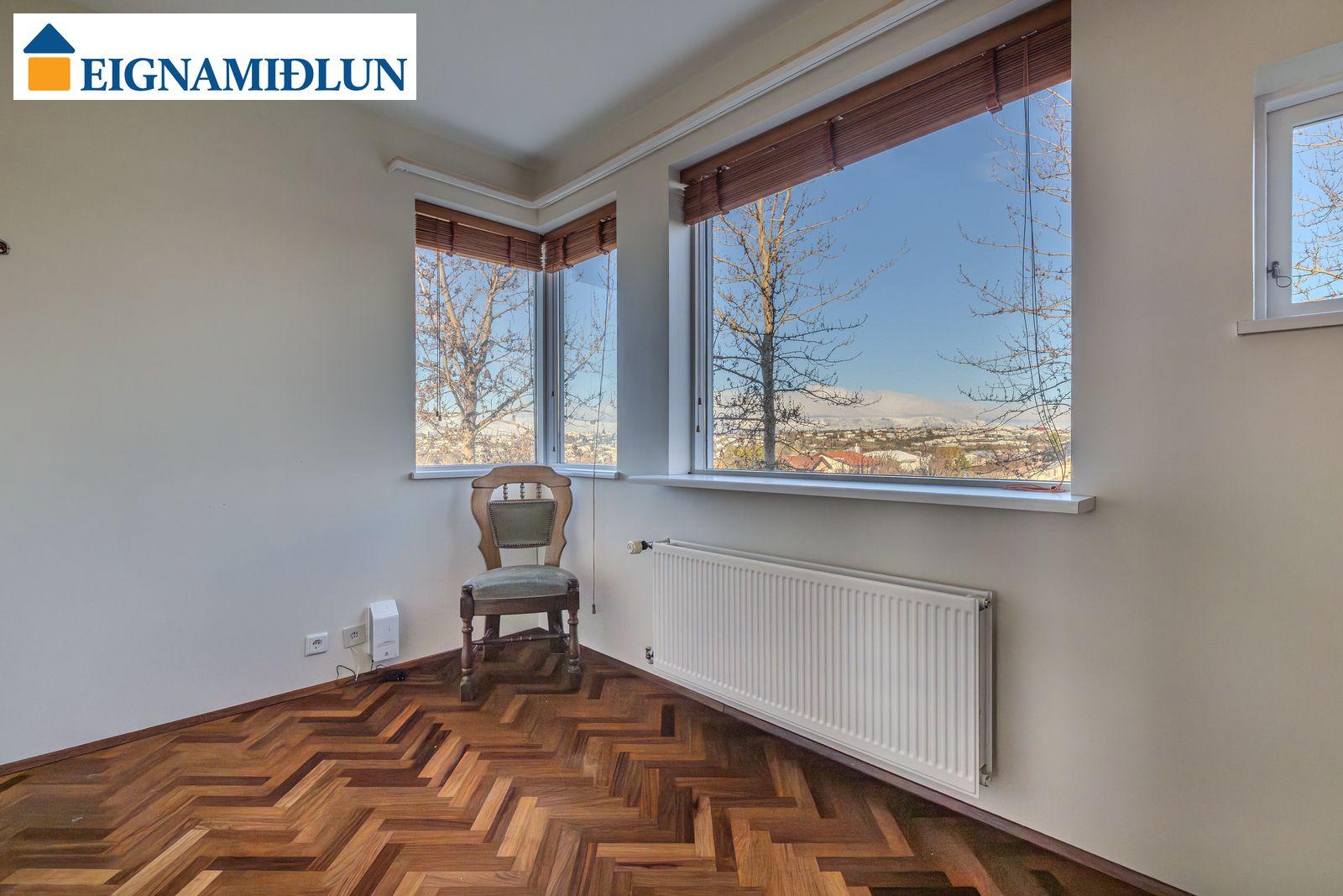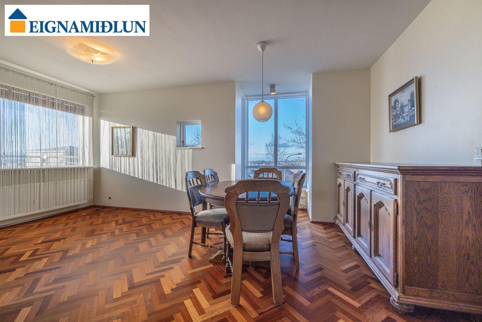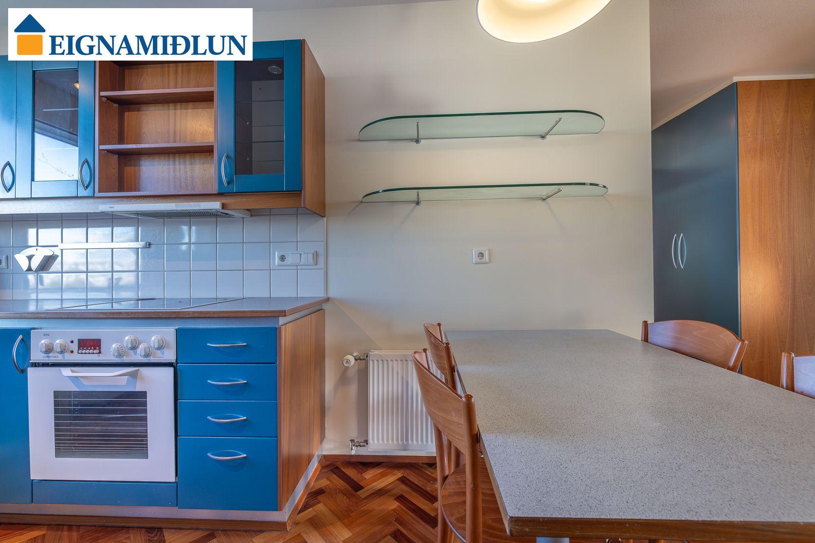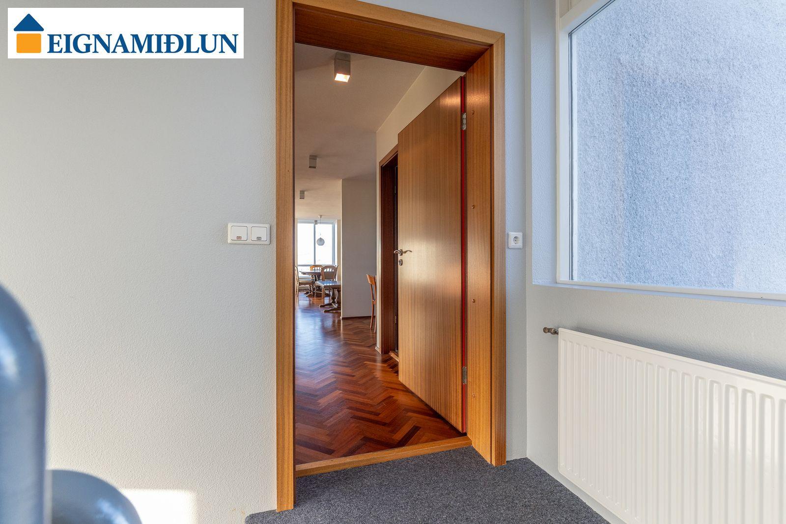 Stofa og borðstofa í björtu og vistlegu rými með stórum gluggum í tvær áttir og útgengi á rúmgóðar svalir til suð-vesturs. Gluggi til vesturs frá borðstofu með fallegu útsýni til sjávar. Hjónaherbergi með góðum fataskápum og snyrtiborði ásamt spegli. Barnaherbergin eru rúmgóð, annað þeirra með fataskáp. Baðherbergi er flísalagt, gólf og veggir, með sturtu og baðkari, innréttingu kringum vask auk skáps.