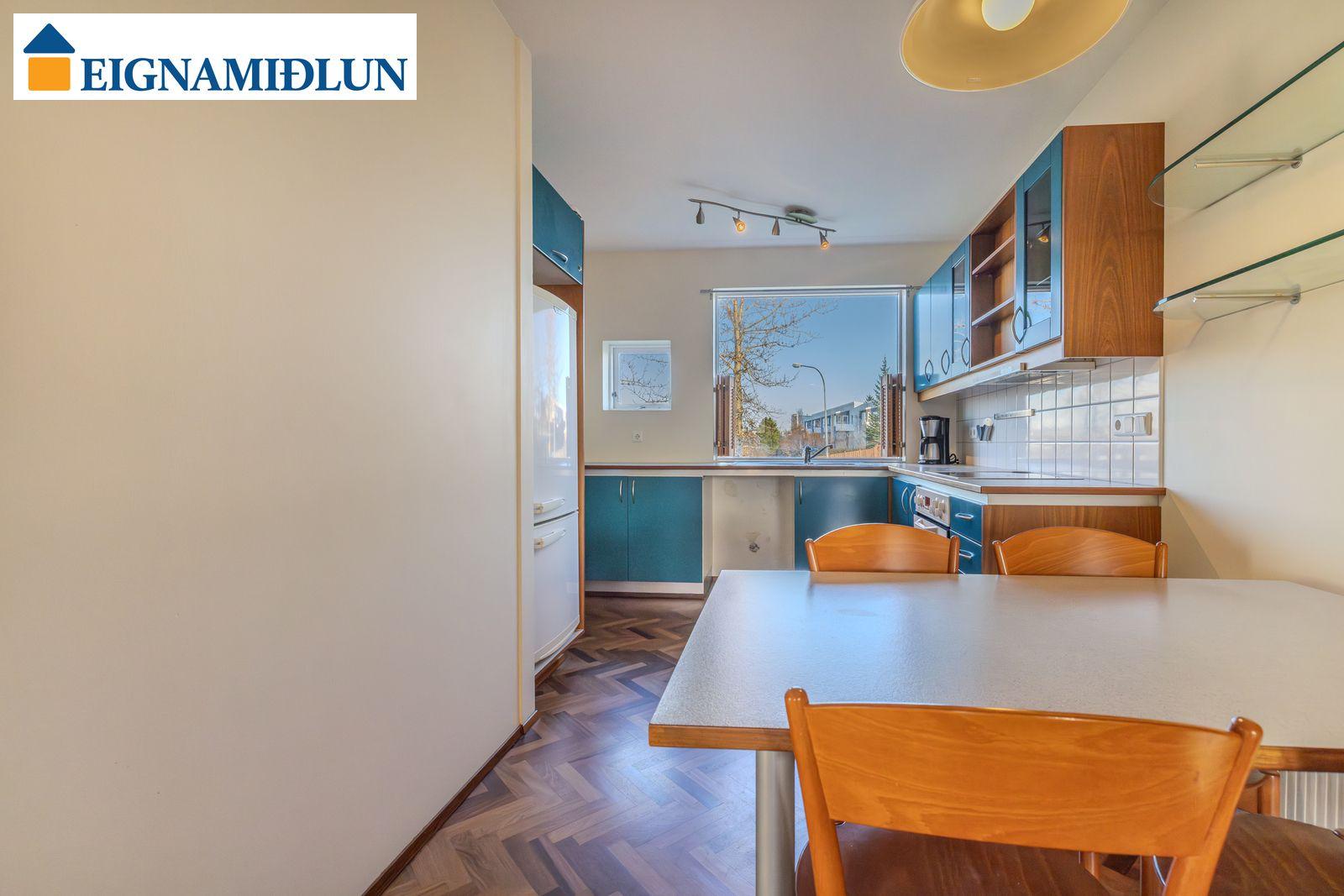 Eldhúsið er rúmgott með vönduðum innréttingum. Mjög gott skápapláss. Flísar á gólfi og milli skápa. Gott pláss fyrir eldhúsborð. Þvottahús með vaski og innréttingu ásamt hillum er inn af eldhúsi.