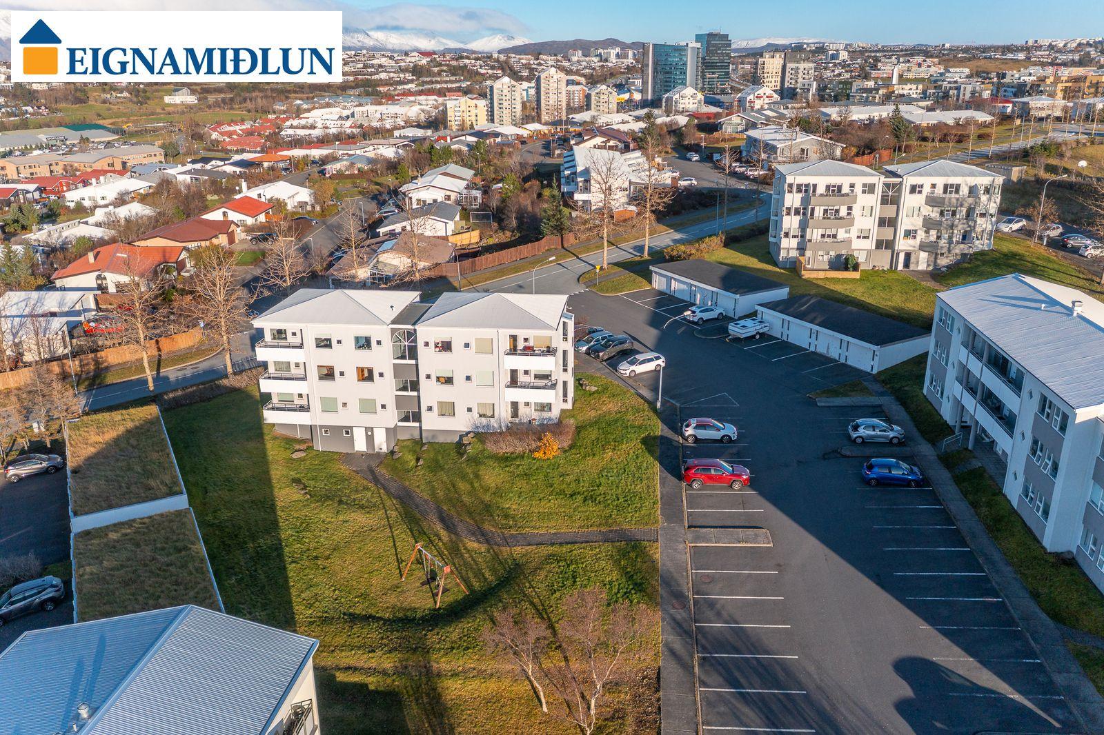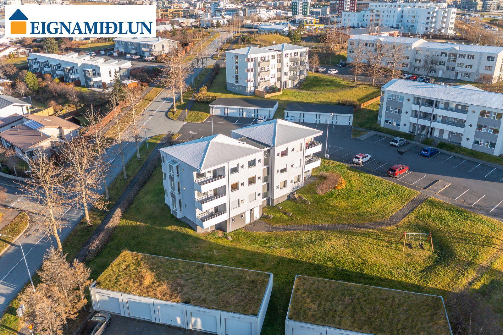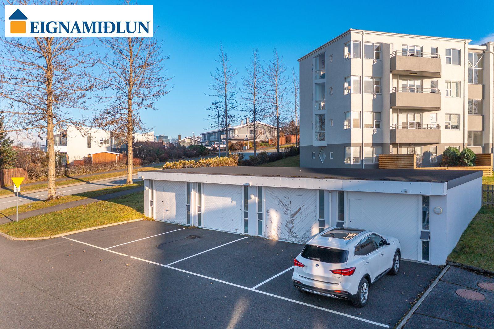 Íbúðinni fylgir sér geymsla í kjallara, sem ekki er innan fermetratölu eignar. Sameiginleg hjóla- og vagnageymsla er í kjallara. Bílskúr er með sjálfvirkum hurðaopnara og góðri lofthæð. Vaskur er í bílskúr, heitt og kalt vatn og krani fyrir bílslöngu.
