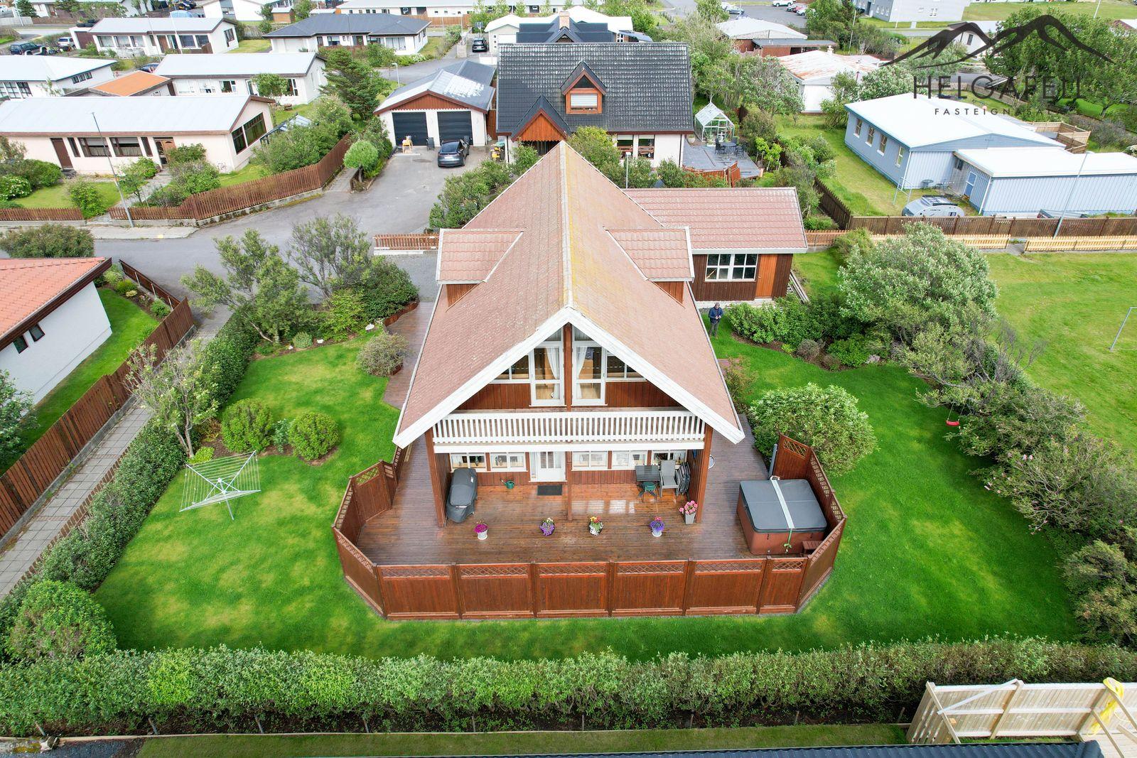 Lóð: Einstaklega falleg og gróin 797 fm lóð. Framan við húsið er möl í innkeyrslu og meðfram húsinu er timburpallur, á vesturhlið hússins er ca. 100 fm sólpallur og heitur pottur.