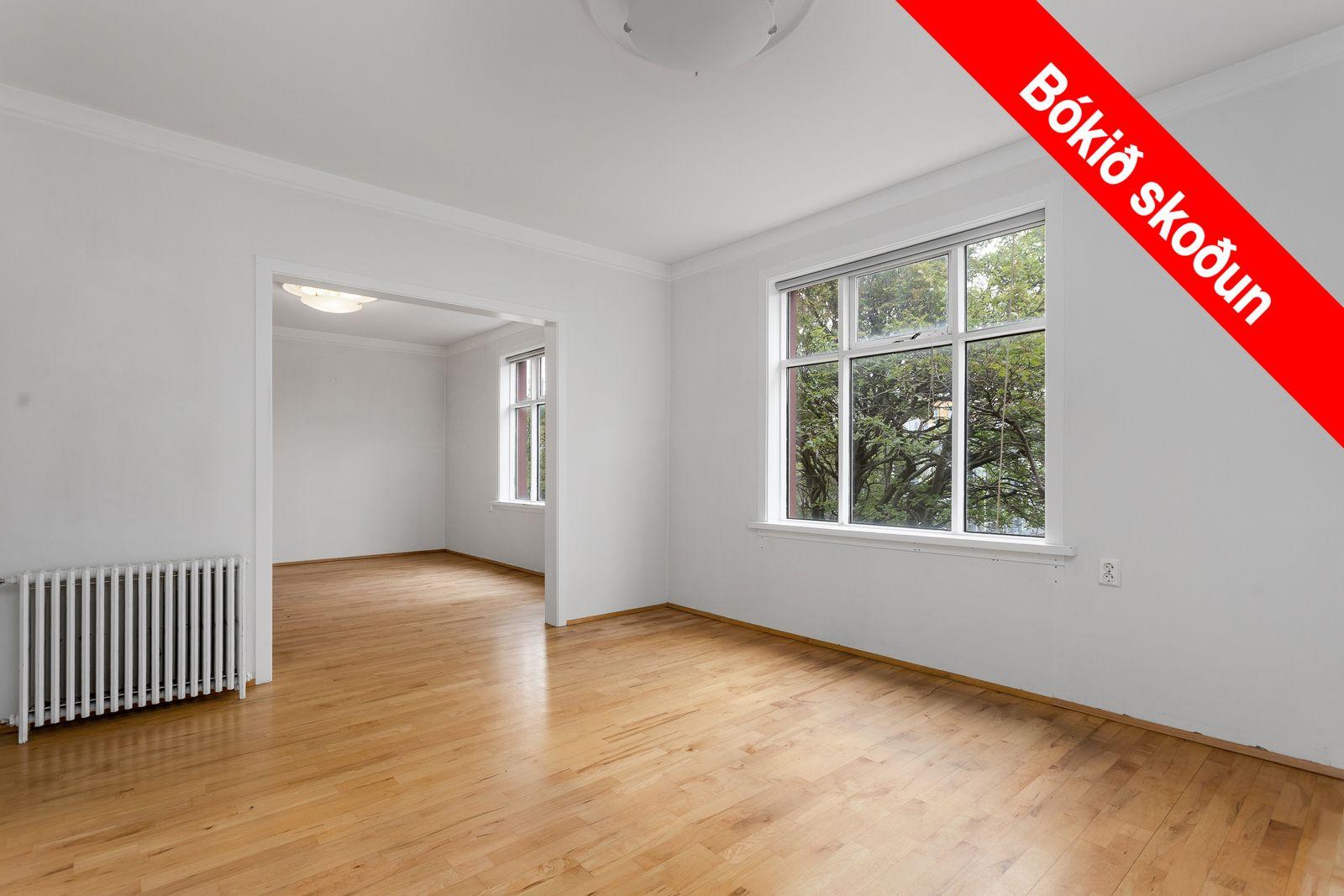Samliggjandi skiptanlegar stofur, parketlagðar, mjög rúmgóðar og bjartar með miklum gluggum og mögulegt að setja svalir.