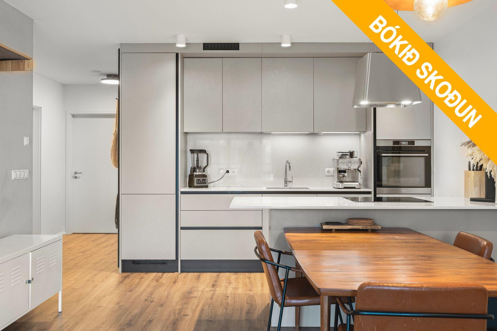 Eldhús með vínilparket á gólfi og fallegri sérsmíðaðri ítalskri eldhúsinnréttingu með eyju, borðplötur eru úr Silestone kvartssteini. Innbyggður kæliskápur með frysti, innbyggð uppþvottavél. Vandaður bakaraofn með sjálfhreinsibúnaði ásamt spanhelluborði.
