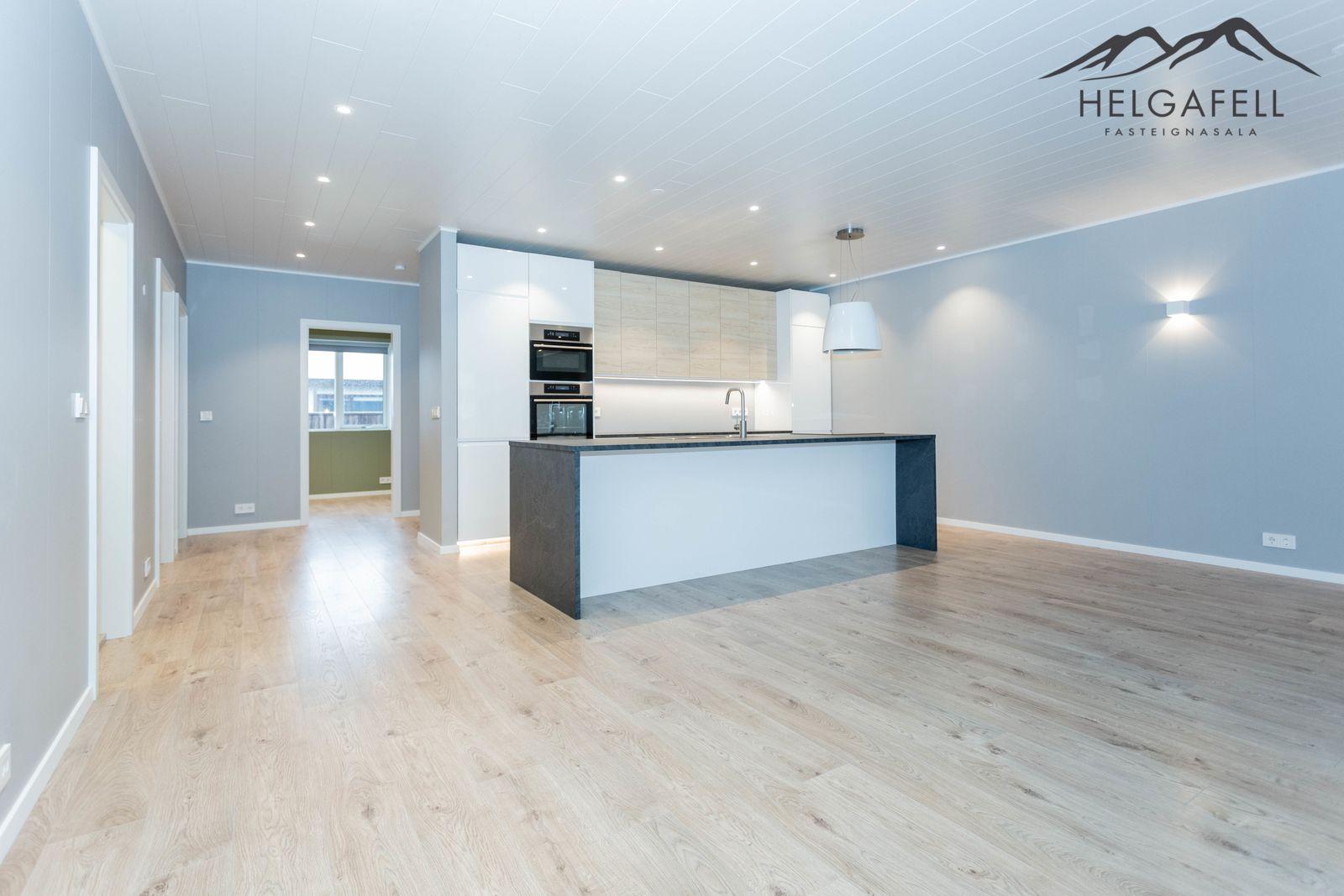 Baðherbergi: Rúmgott baðherbergi, falleg viðar innrétting, walk in sturta með hillu og led lýsingu, upphengt salerni, handklæðaofn, innfelld ljós í loft, flísalagt í hólf og gólf.