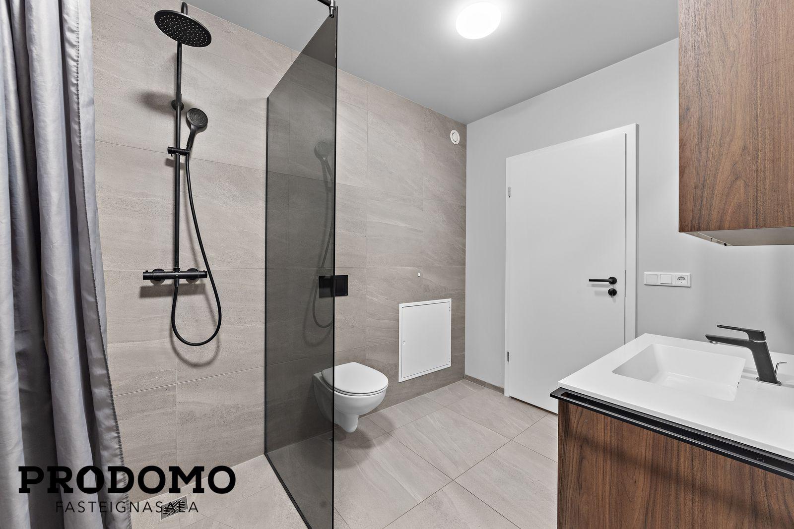 Baðherbergi með flísum á gólfi og veggjum að hluta. Falleg innrétting, upphengt salerni og sturta. Þar er aðstaða fyrir þvottavél og þurrkara.