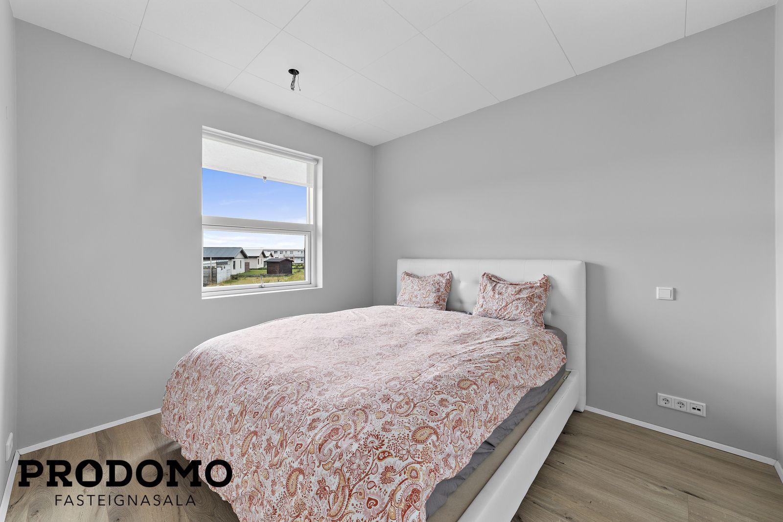 Húsið er einangrað að utan og klætt með báruðu áli. Svalahurðir og gluggar úr álklæddu timbri. Innréttingar eru frá Nobilia,  fataskápar í herbergjum frá GKS. Hnotu innréttingar í eldhúsi og baðherbergi, innihurðar og fataskápar eru hvítir. Vel skipulögð eign. Stétt við innganga er hellulögð og gönguleiðir með snjóbræðslukerfi.