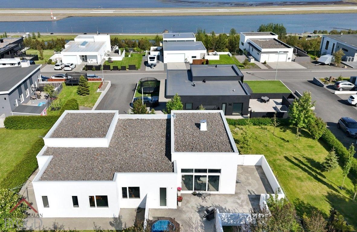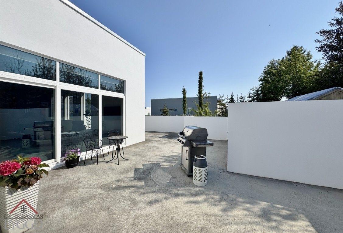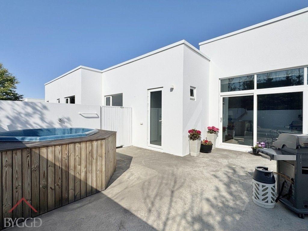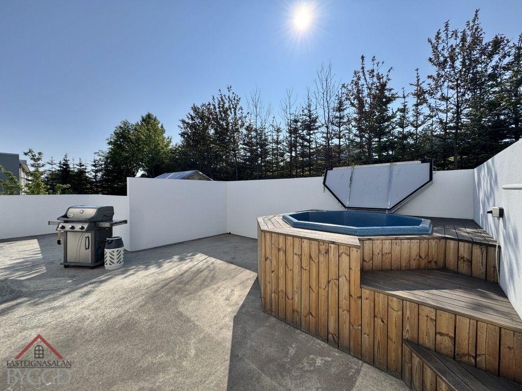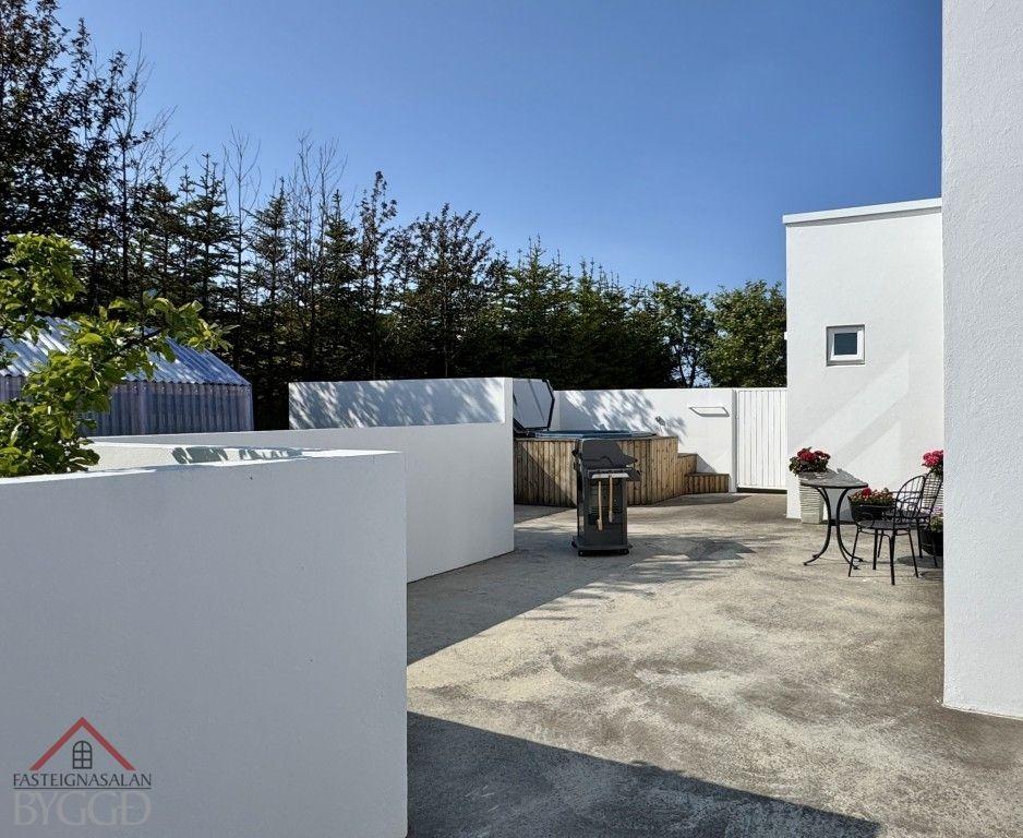 - Steypt stétt er hringinn í kringum húsið og steypt verönd með steyptum skjólveggjum og heitum potti er á baklóðinni.