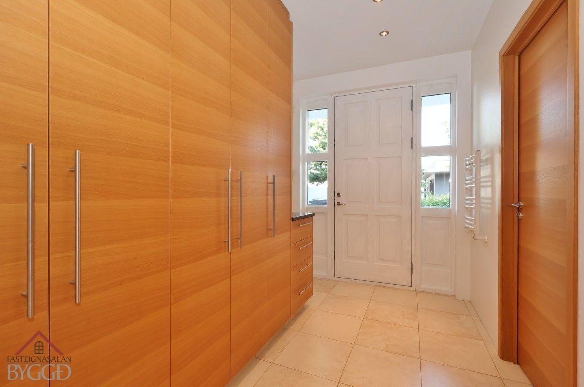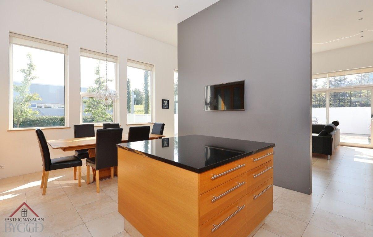 Eldhús, vönduð sérsmíðuð spónlögð eikar innrétting og eyja með mjög góðu skápa- og bekkjarplássi. Dökkur steinn er á bekkjum og flísar á milli skápa. Stæði er innréttingu fyrir amerískan ísskáp og uppþvottavél, bakaraofn í vinnuhæð. Siemens tæki. Lítið búr er inn af eldhús.