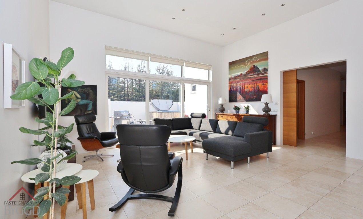 Stofa með flísum á gólfi og stórum gólfsíðum gluggum til tveggja átta. Aukin lofthæð er í stofunni og innfelld lýsing í loftum. Fallegur arinn er á vegg milli eldhúss og stofu. Rennihurð er úr stofunni út á steypta verönd.