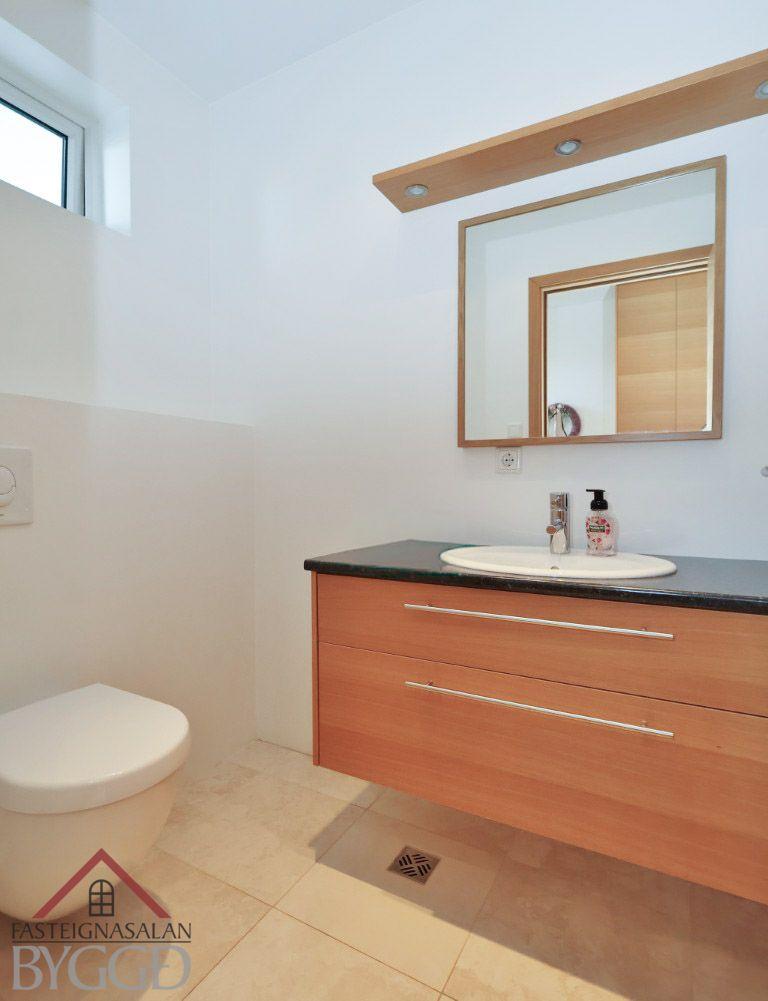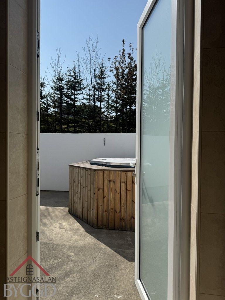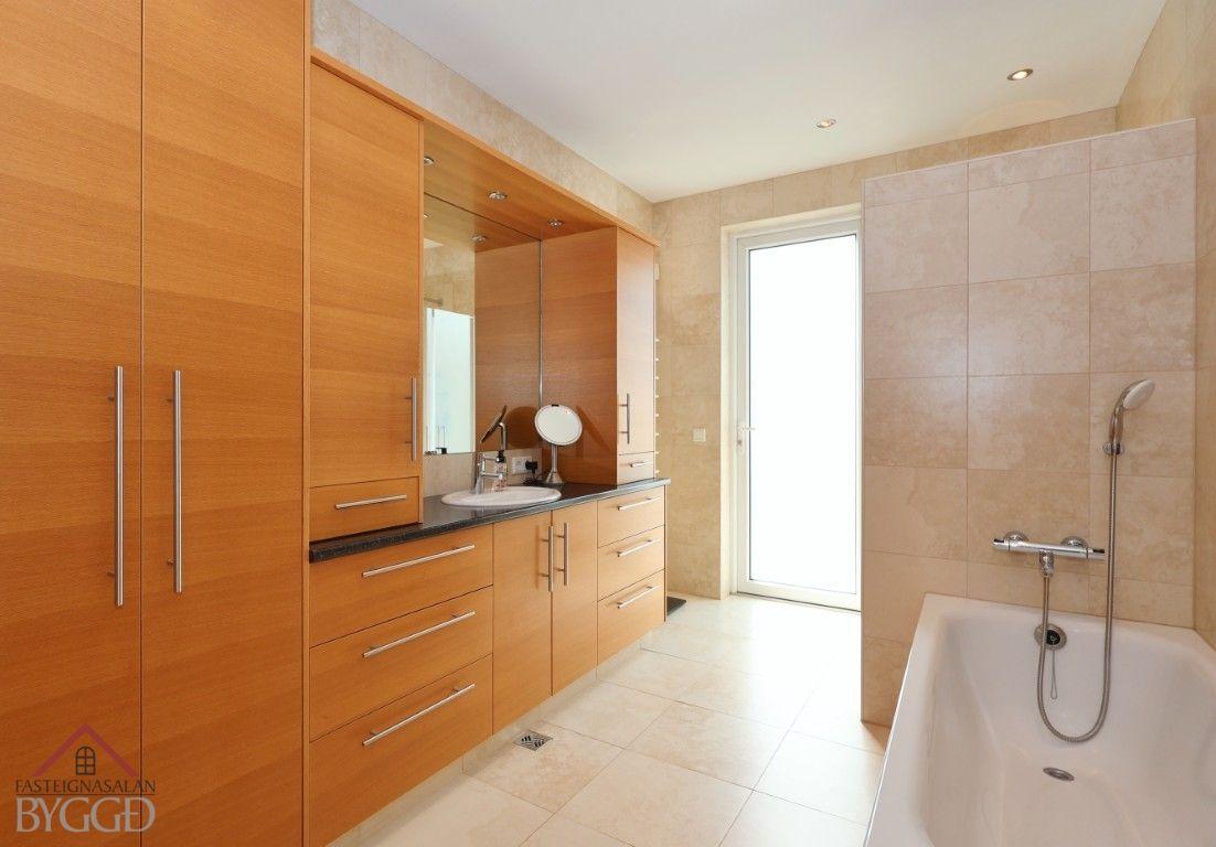 Baðherbergi er flísalagt í hólf og gólf og með innfelldri lýsingu í lofti. Spónlögð eikar innrétting með mjög góðu skápaplássi, upphengt wc, handklæðaofn, baðkar og rúmgóð sturta með innfelldum tækjum. Útgengt er út af baðherberginu út á verönd með heitum potti.