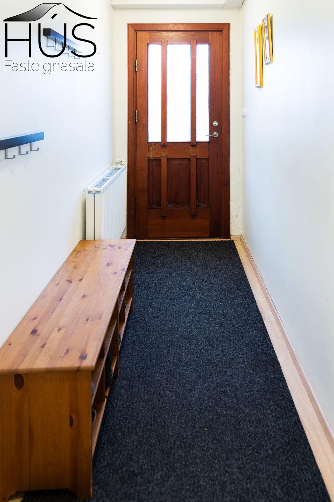 Forstofa: Komið er inn í forstofu, flísar á gólfi, fatahengi