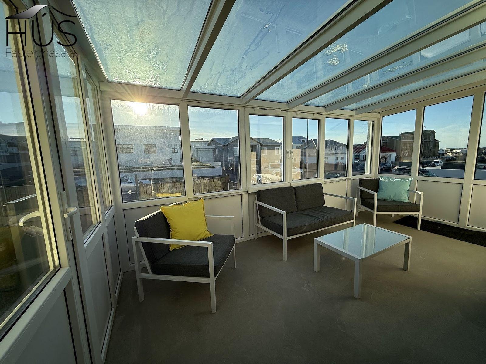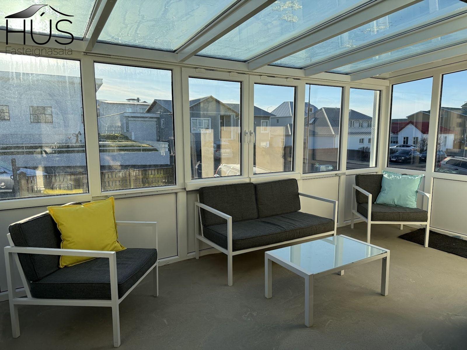 Sólskáli: Nýlegur 10,5 m2 sólskáli sem er ekki inn í skráðum m2. Hiti í gólfi, búið að flota.