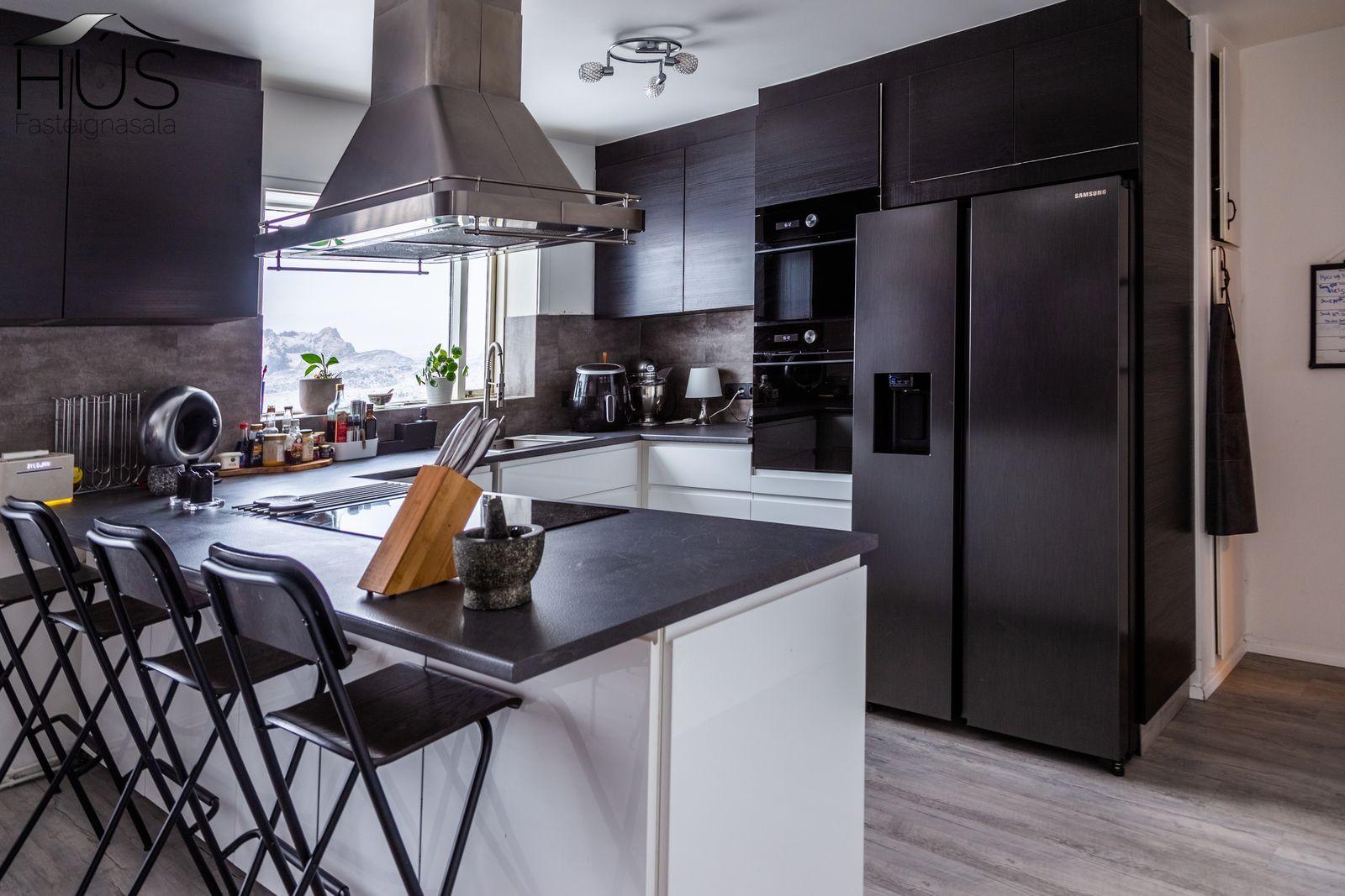 Eldhús: Vínylparket á gólfi, nýleg Ikea innrétting, tveir ofnar, háfur, innbyggð uppvöskunarvél