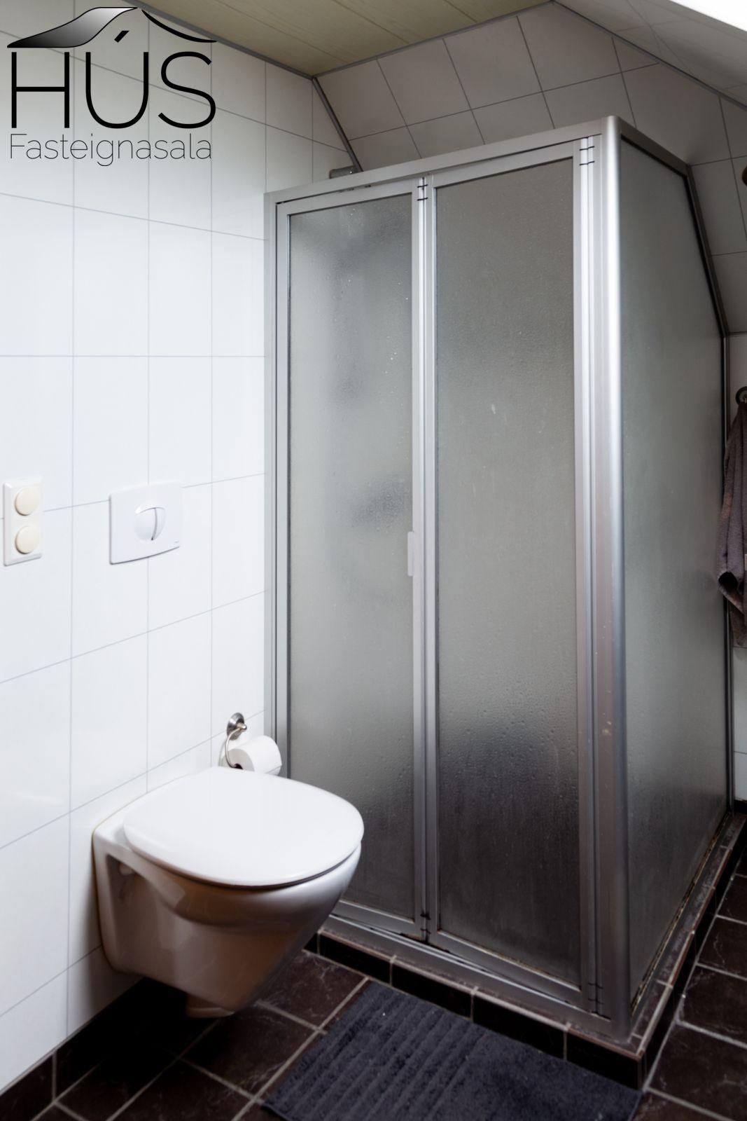 Baðherbergi: flísar á gólfi, innrétting, sturta, wc.