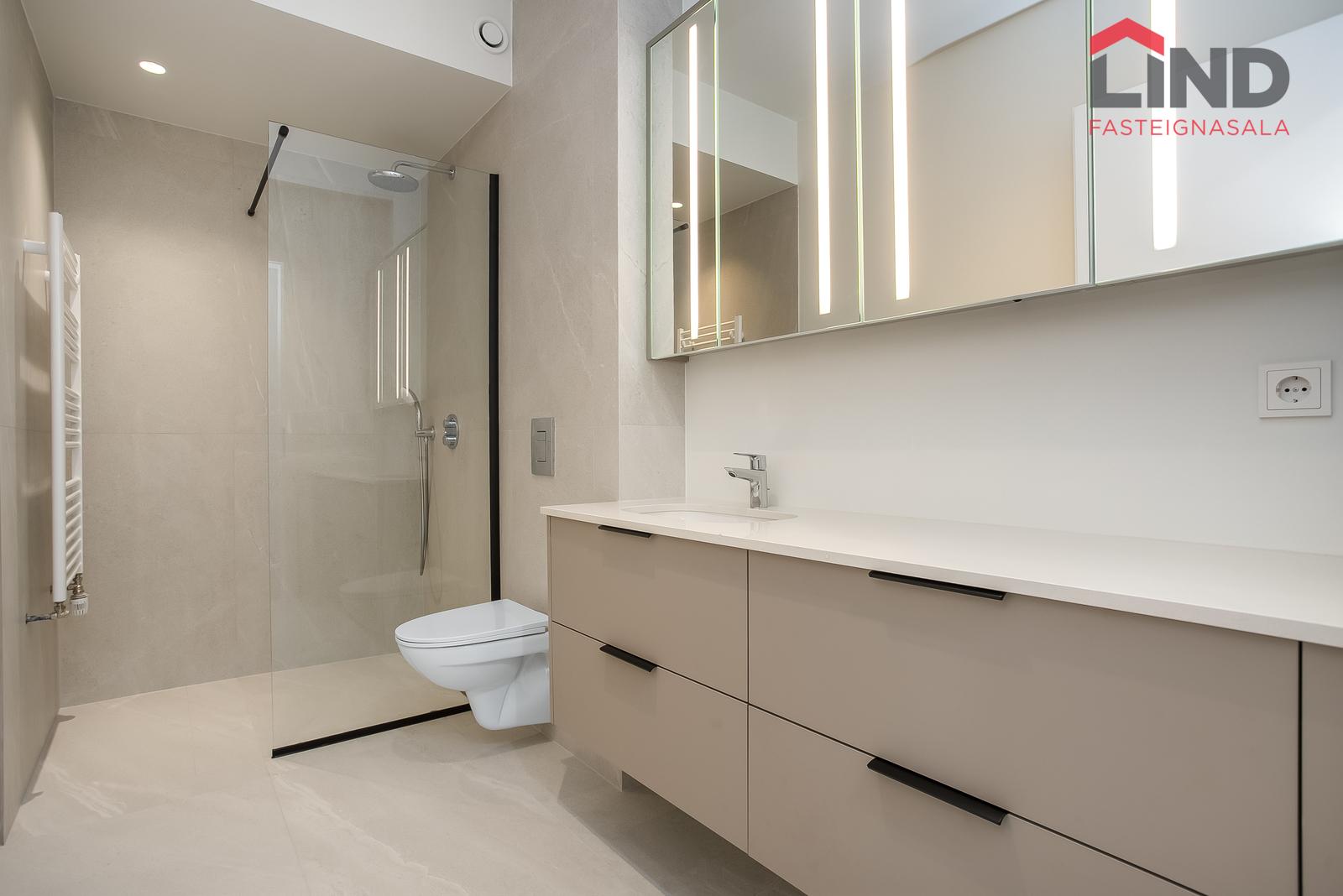 Baðherbergi: Gráar flísar 60x120 að stærð á gólfi og á veggjum að hluta. Borðplötur eru úr 20mm Quartz steini með undirlímdum vaski. innréttingin er frá Selós, framhliðar eru matt beige, grábrúnar að lit. Upphengt salerni, handklæðaofn og sturta. Hreinlætistæki eru frá Grohe og innihalda hitastýrð og innbyggð blöndunartæki í sturtu.