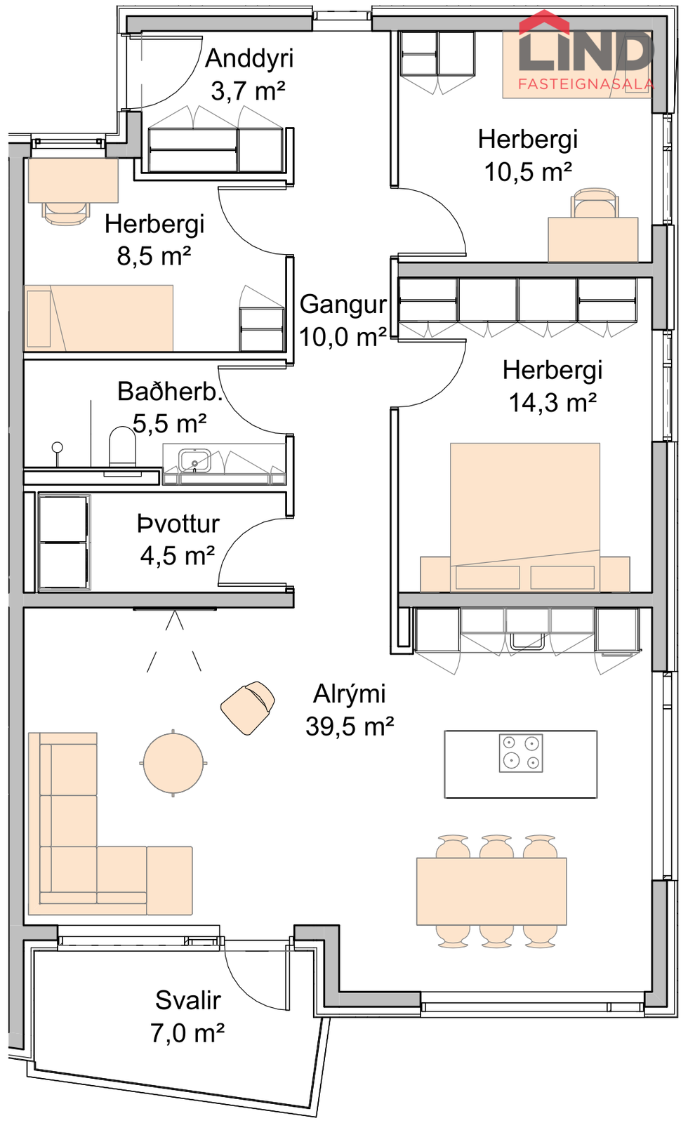 Alrými: Parket á gólfi, útgengt út á svalir.
