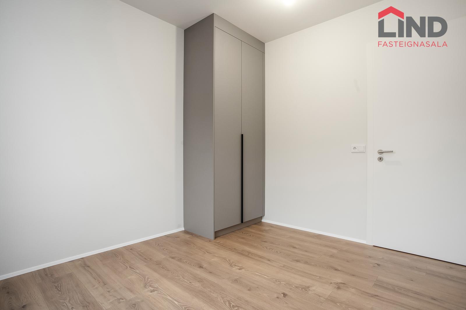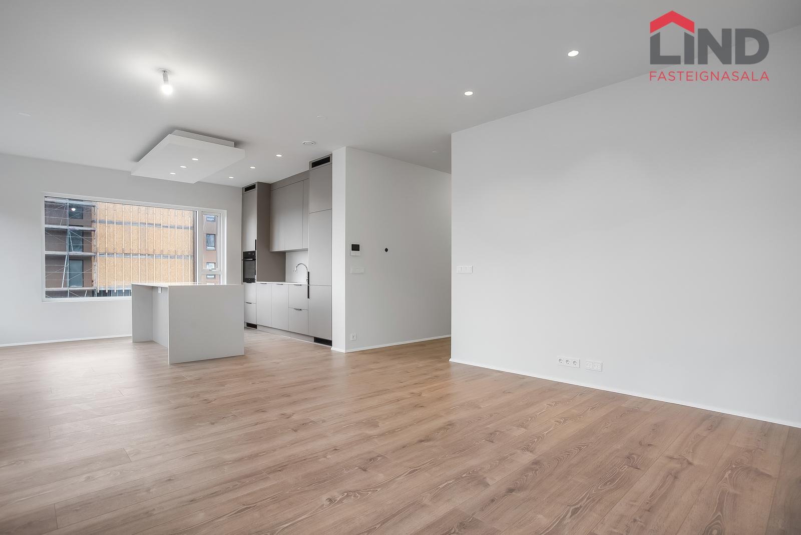 Eldhús: Parket á gólfi, gott skápa- og borðpláss, innréttingin er frá Selós, framhliðar eru matt beige, grábrúnar að lit, borðplötur eru úr 20mm Quartz steini með undirlímdum vaski úr stáli. Eldhústæki eru frá AEG. Innbyggður ísskápur, frystir og uppþvottavél fylgir. Skúffur eru með mjúklokunarbúnaði, og LED lýsing undir efri skápum. Höldur eru svartar grip höldur frá Selós.