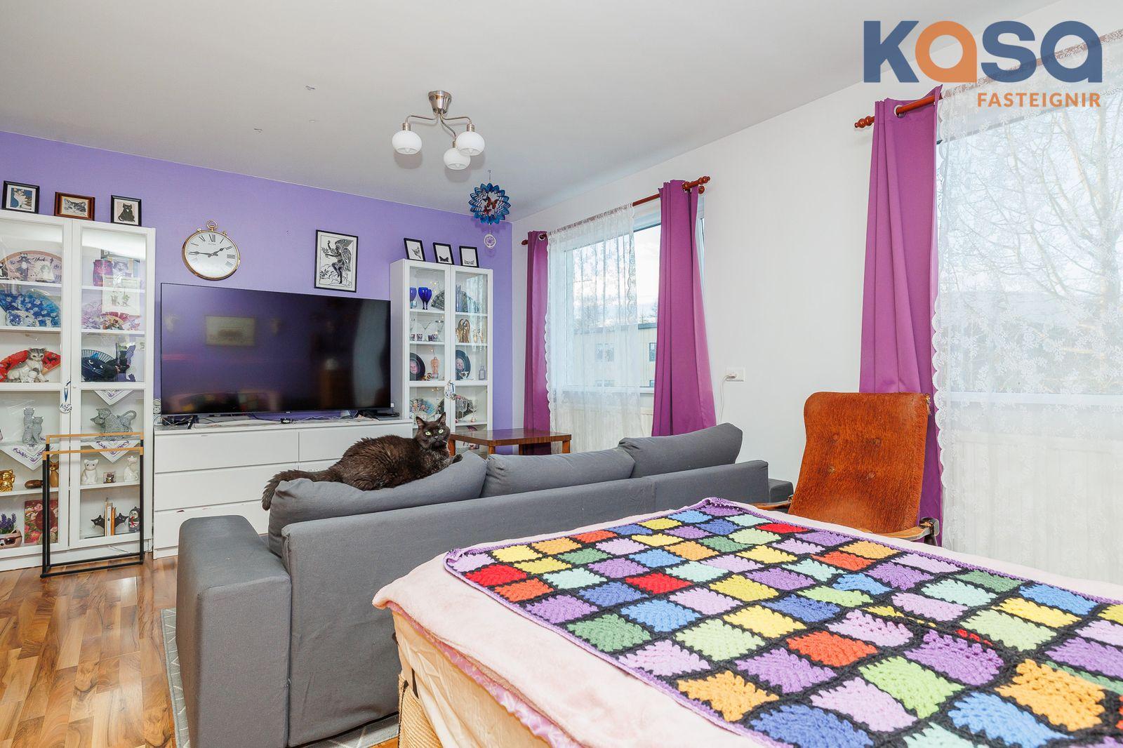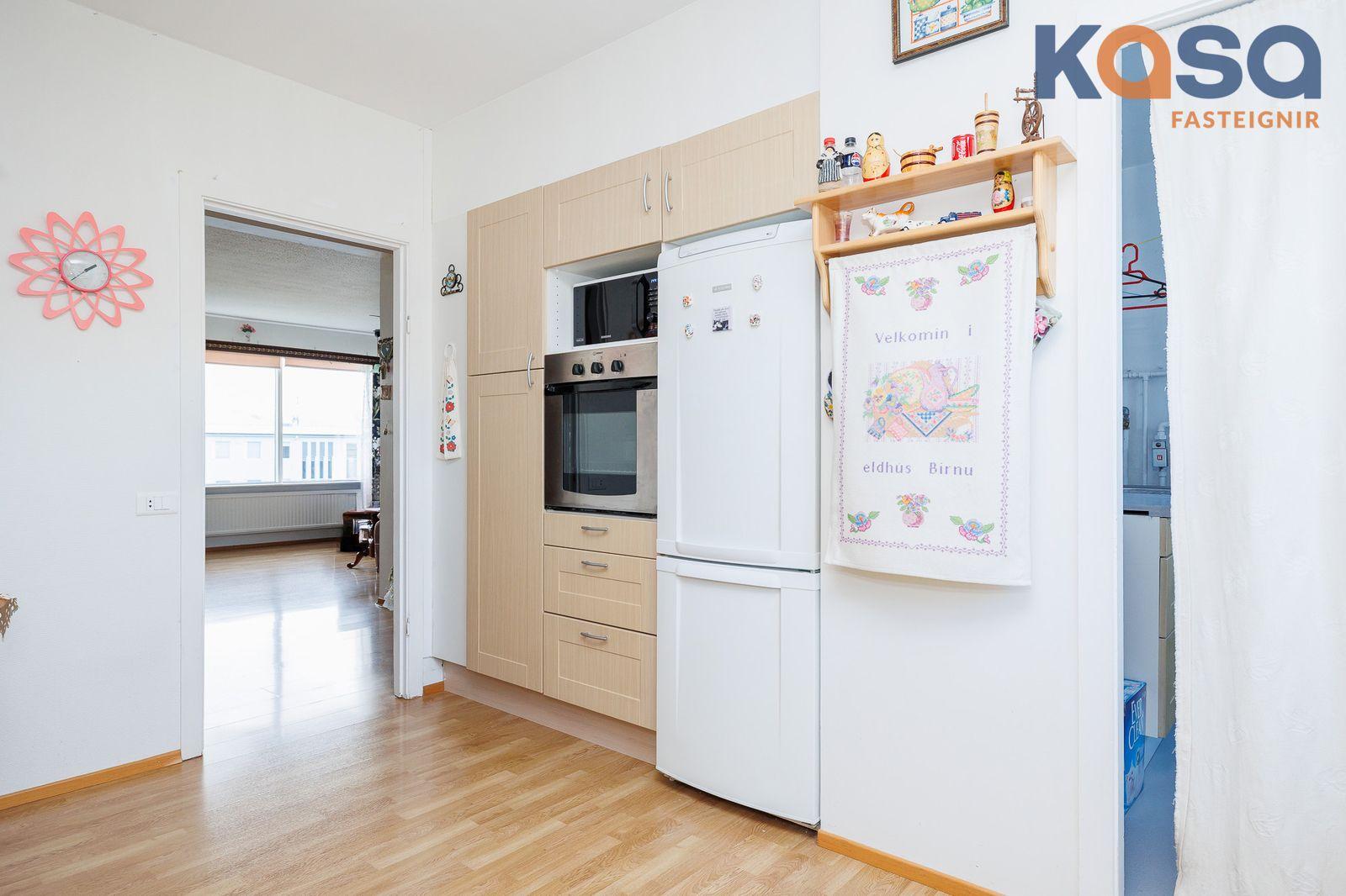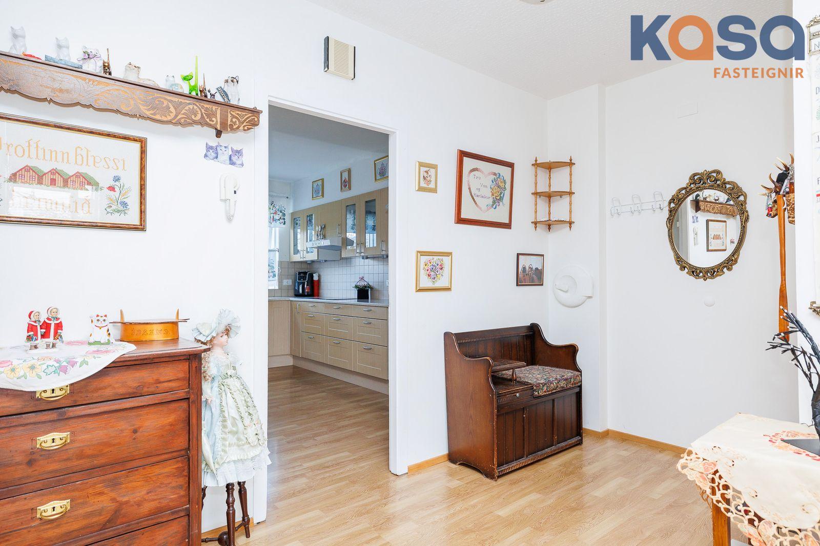 Svefnherbergin eru tvö í dag, en búið er að opna á milli tveggja barnaherbergja og gera úr því eitt stórt herbergi. Hurðir eru enn til staðar svo það er mögulegt að skipta herbergjunum aftur upp, ef vilji er fyrir því. Bæði svefnherbergin eru með parketi á gólfum. Úr hjónaherbergi er gengið út á steyptar svalir til suðurs. Baðherbergi er flísalagt í hólf og gólf. Þar er ljós innrétting og baðkar með sturtutækjum. í eldhúsi er rúmgóð, ljós innrétting, parket á gólfi og flísar á milli skápa. Þar er einnig lítill borðkrókur. Þvottahús er inn af eldhúsi. Þar er lakkað gólf, opnanlegur gluggi og ljós innrétting með vaski. Stofa er rúmgóð með parketi á gólfum. Geymsla er inn af holi og þar er parket á gólfi.
