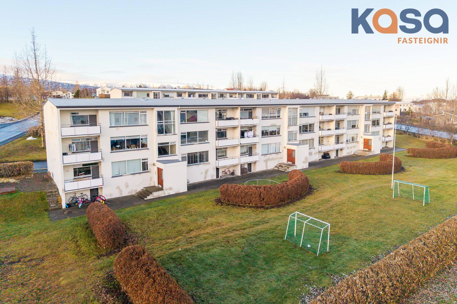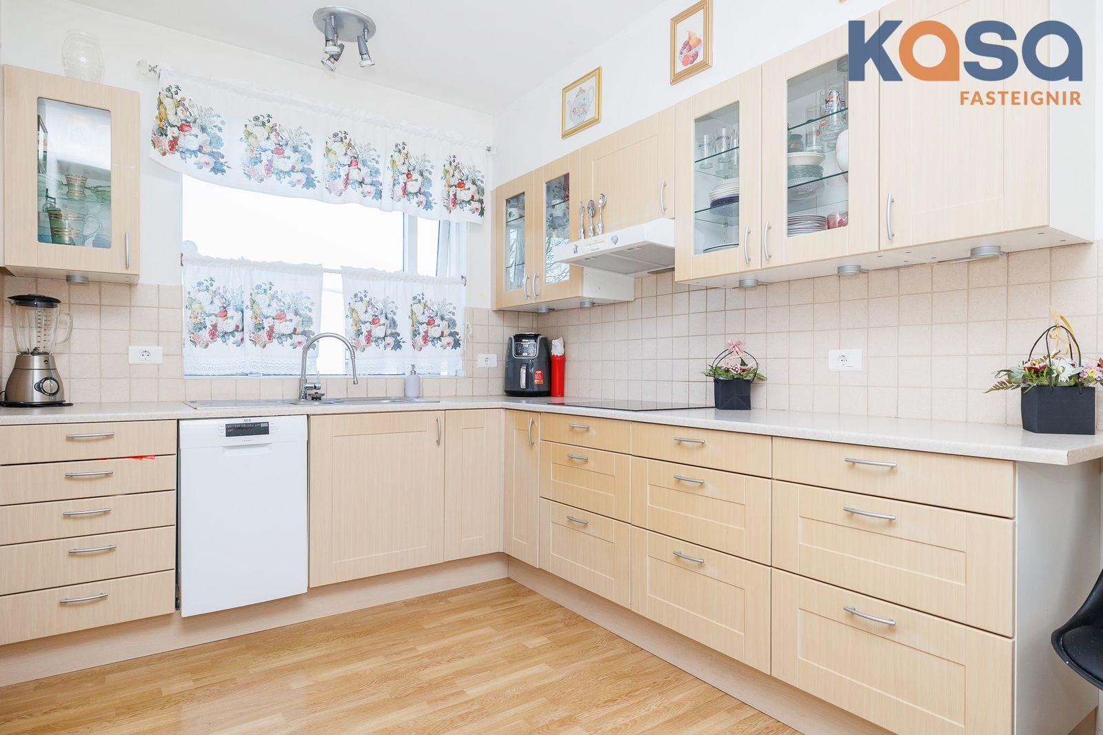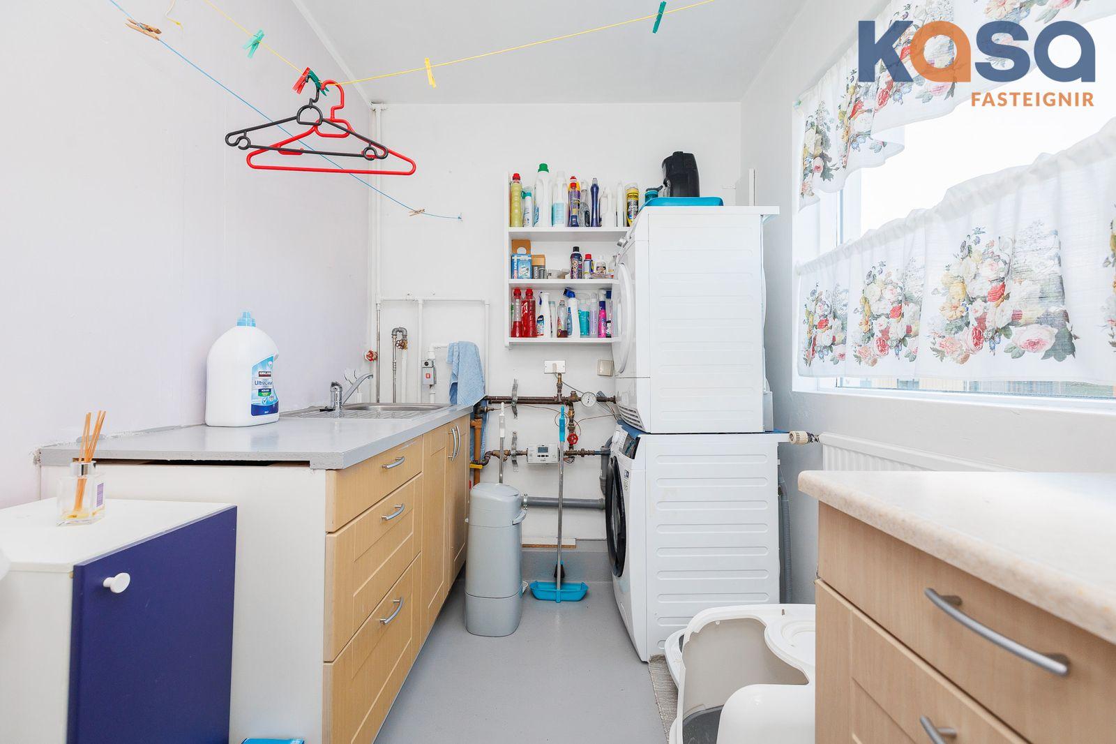Svefnherbergin eru tvö í dag, en búið er að opna á milli tveggja barnaherbergja og gera úr því eitt stórt herbergi. Hurðir eru enn til staðar svo það er mögulegt að skipta herbergjunum aftur upp, ef vilji er fyrir því. Bæði svefnherbergin eru með parketi á gólfum. Úr hjónaherbergi er gengið út á steyptar svalir til suðurs. Baðherbergi er flísalagt í hólf og gólf. Þar er ljós innrétting og baðkar með sturtutækjum. í eldhúsi er rúmgóð, ljós innrétting, parket á gólfi og flísar á milli skápa. Þar er einnig lítill borðkrókur. Þvottahús er inn af eldhúsi. Þar er lakkað gólf, opnanlegur gluggi og ljós innrétting með vaski. Stofa er rúmgóð með parketi á gólfum. Geymsla er inn af holi og þar er parket á gólfi.