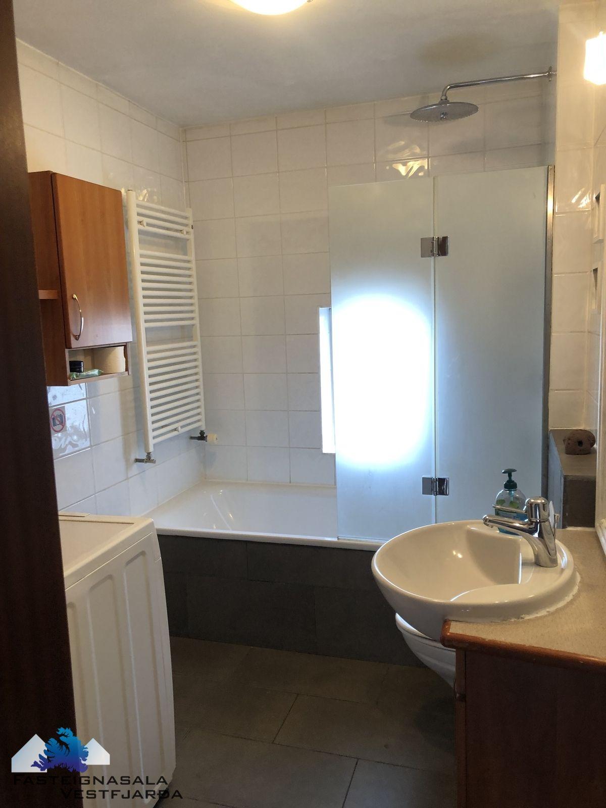 Nánari lýsing: Inngangur er um stóran hringstiga frá baklóð. Forstofa með dökkum flísum á gólfi, hiti í gólfi og fataskápur. Gangur með flísum á gólfi. Rúmgóð stofa með parketi. Eldhús með flísum á gólfi, innrétting, helluborð og ofn. Baðherbergi með flísum á gólfi, hiti í gólfi, baðkar, flísar á veggjum, ágæt innrétting. Tengi fyrir þvottavél á baði. Þrjú svefnherbergi, tvö stærri herbergi með parketi og góðum fataskápum, eitt minna herbergi með parketi á gólfi.