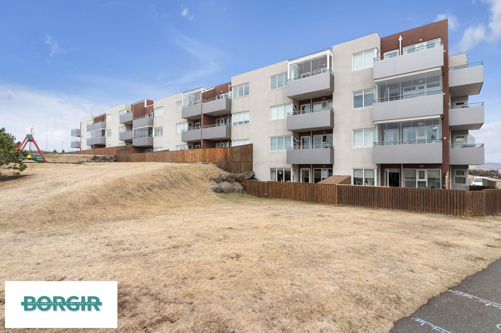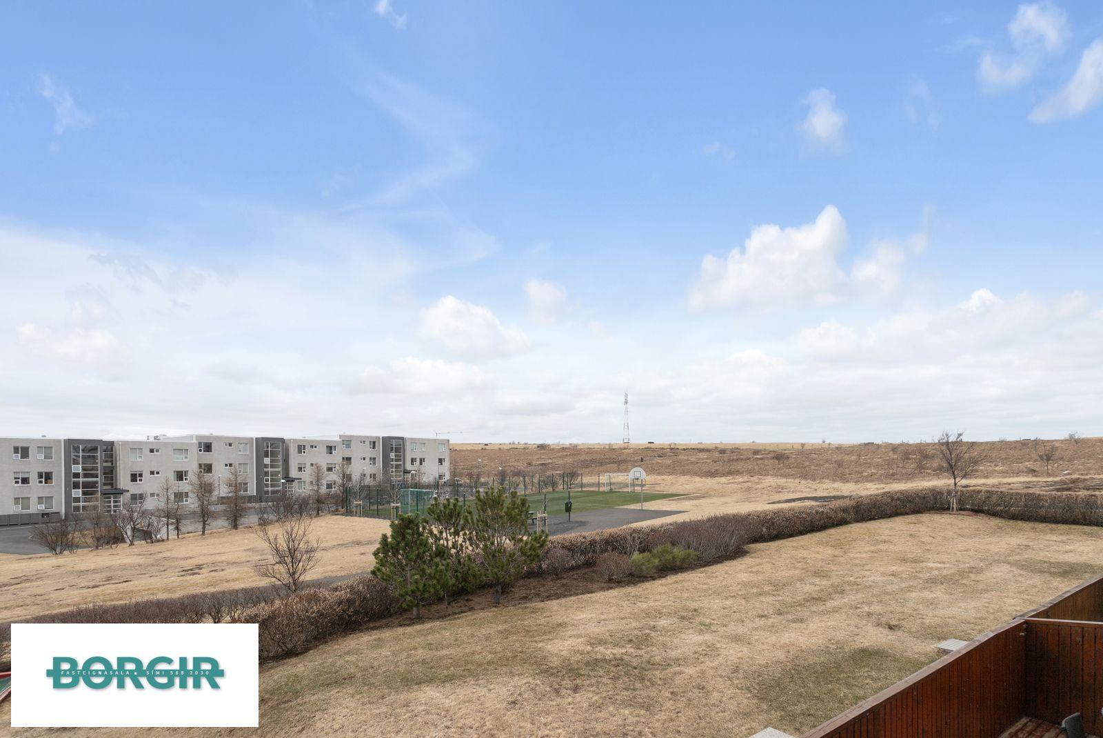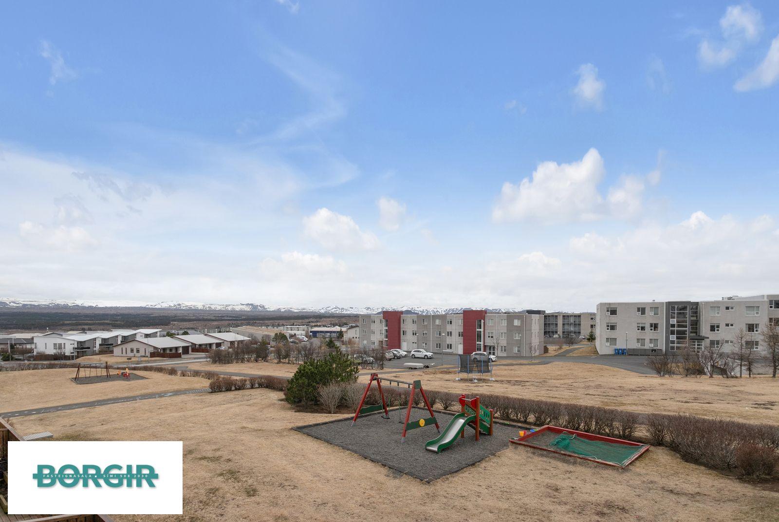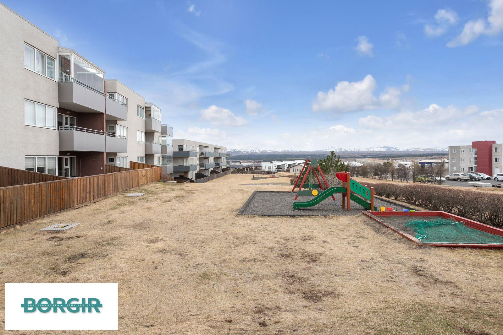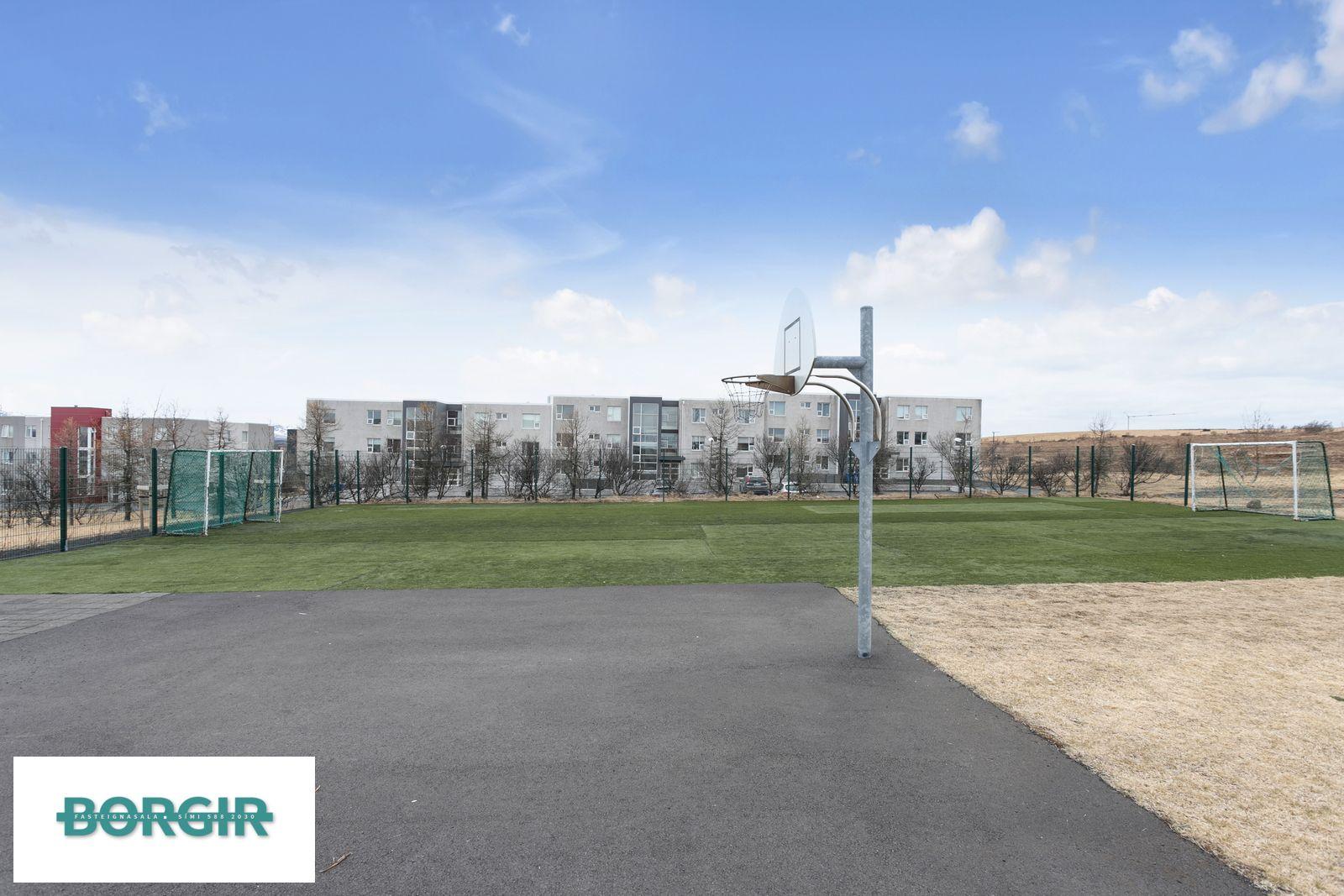 Leikvöllur er fyrir aftan húsið í sameiginlegum garði en búið er að setja upp steyptan körfuboltaleikvöll og fótboltavöll með gervigrasi.