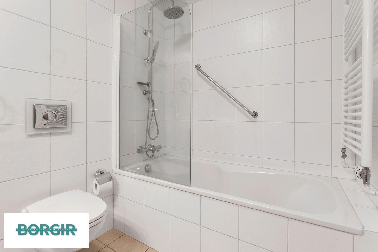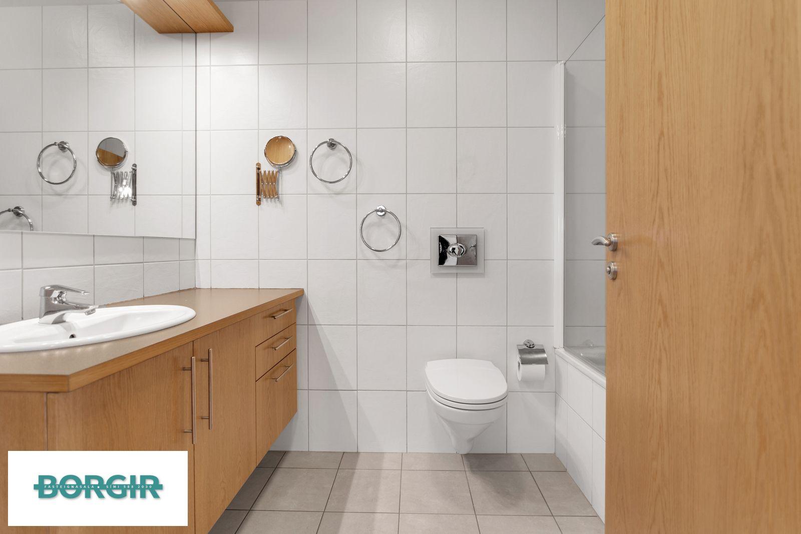 Baðherbergi er flísalagt í hólf og gólf. Baðinnrétting, sturtubaðkar, handklæðaofn og upphengt wc.